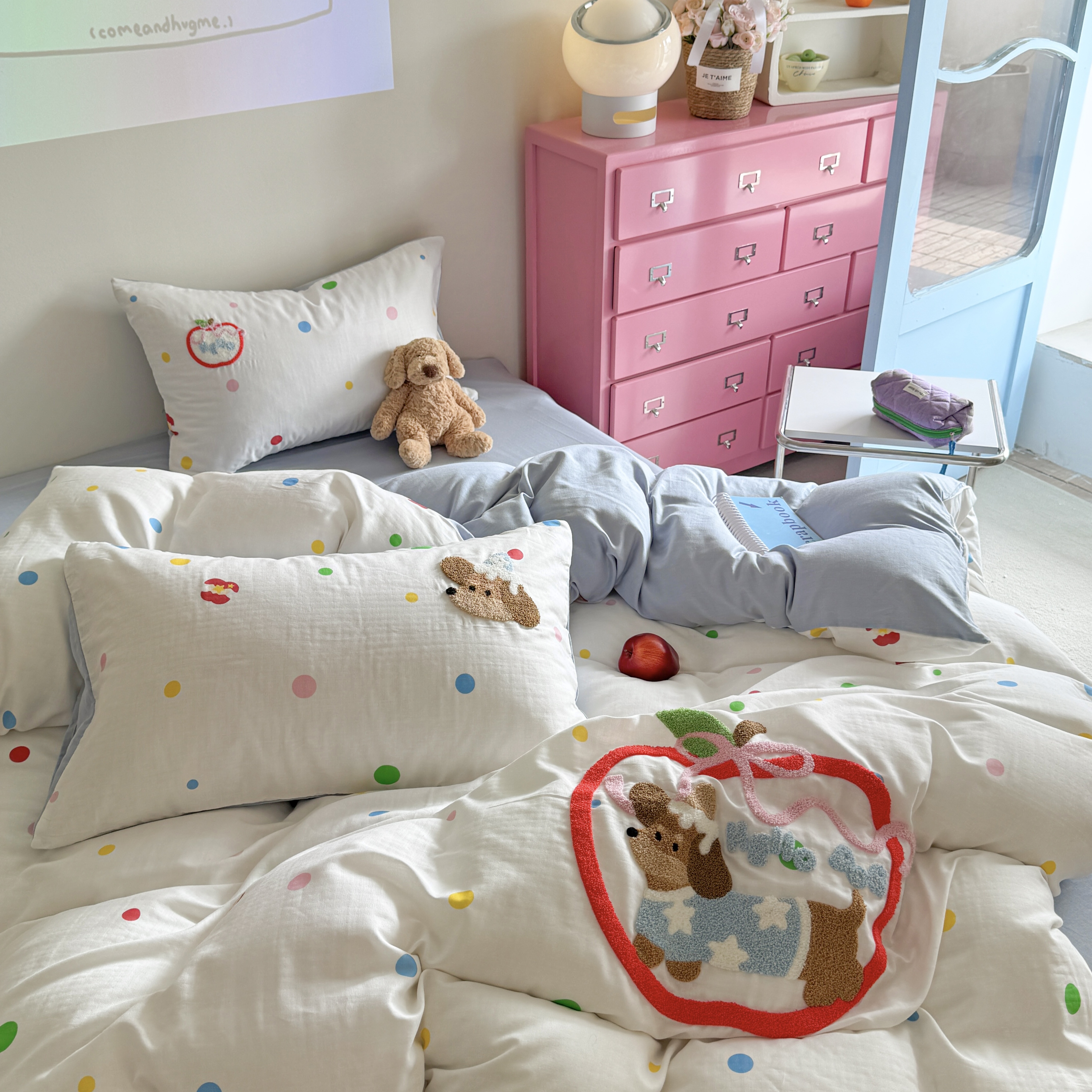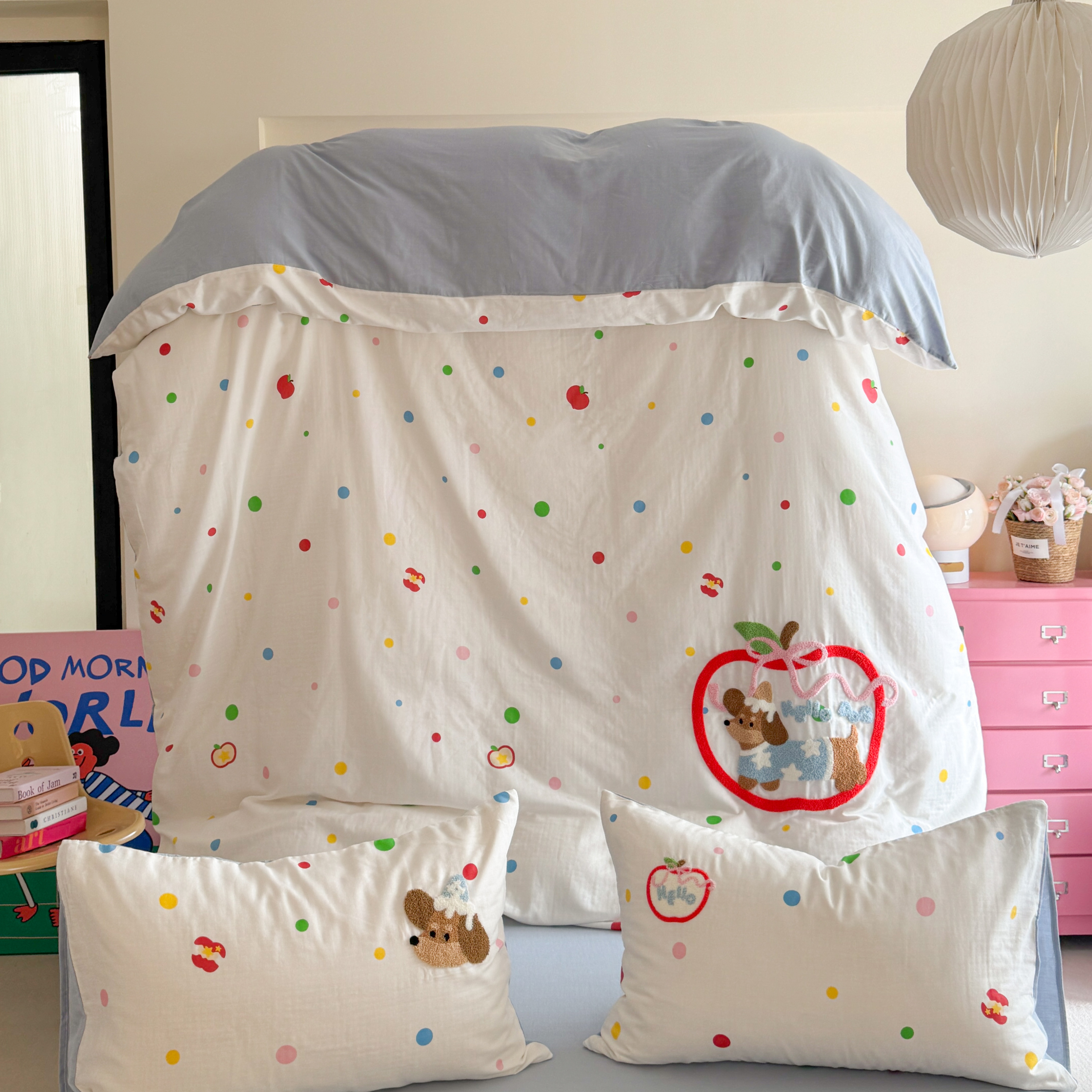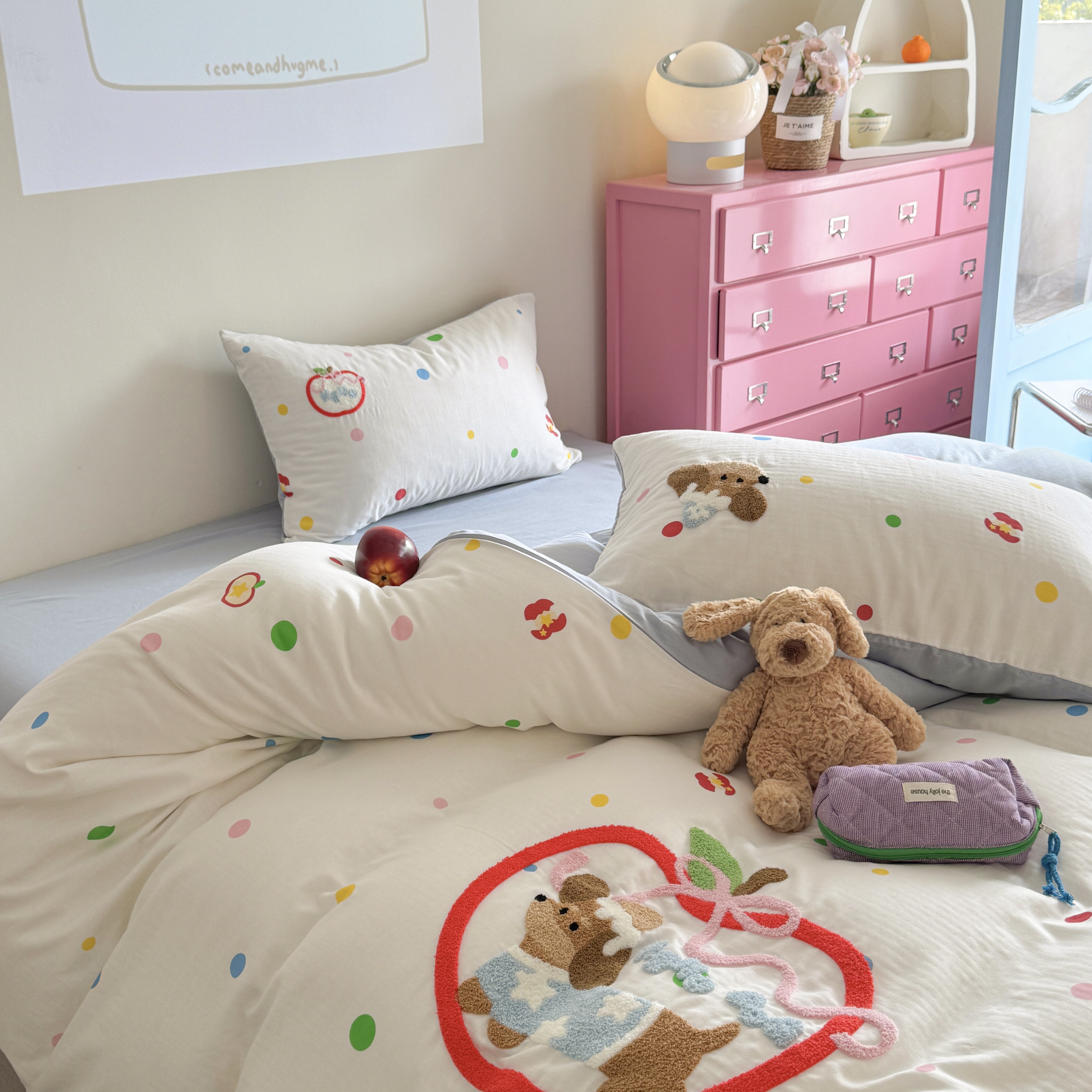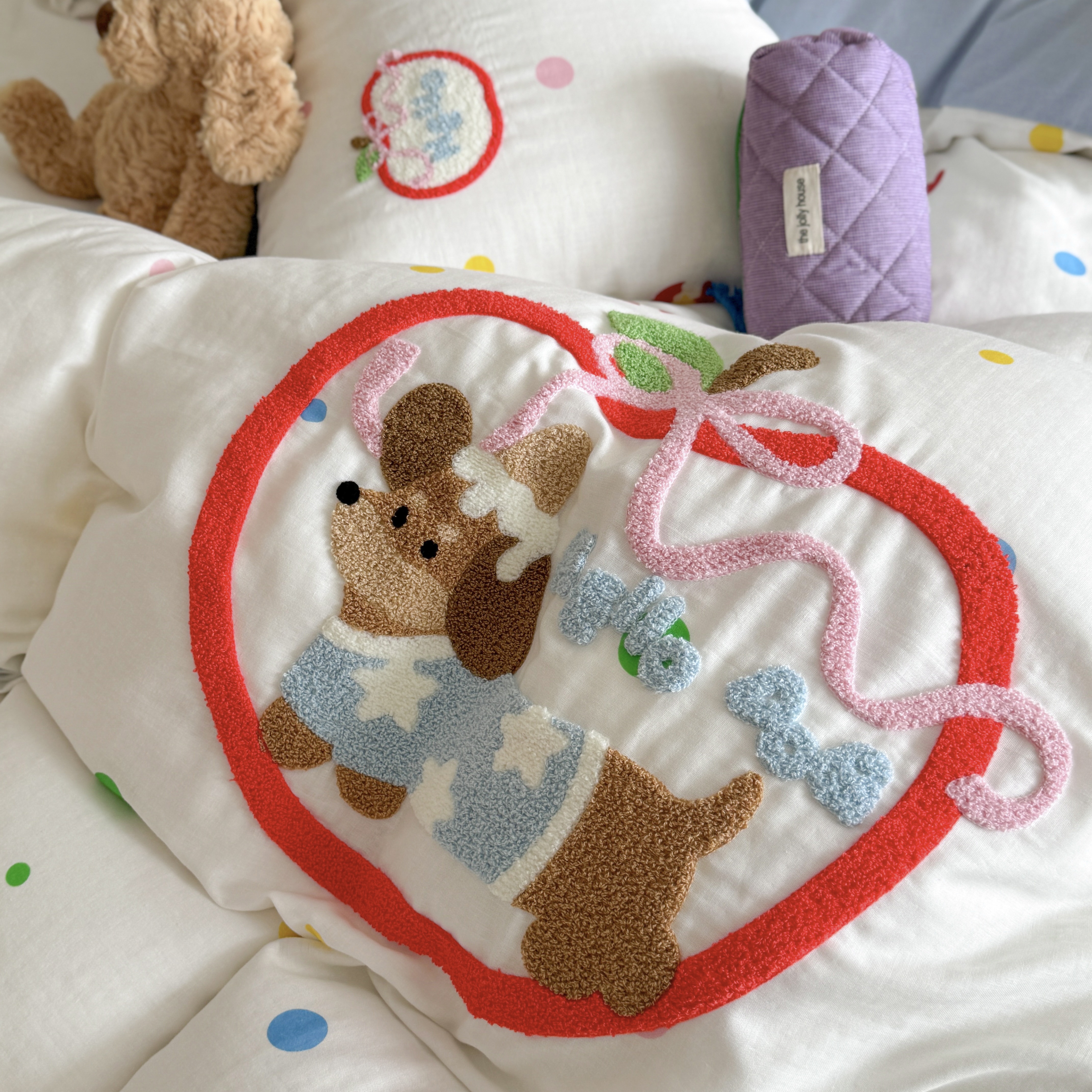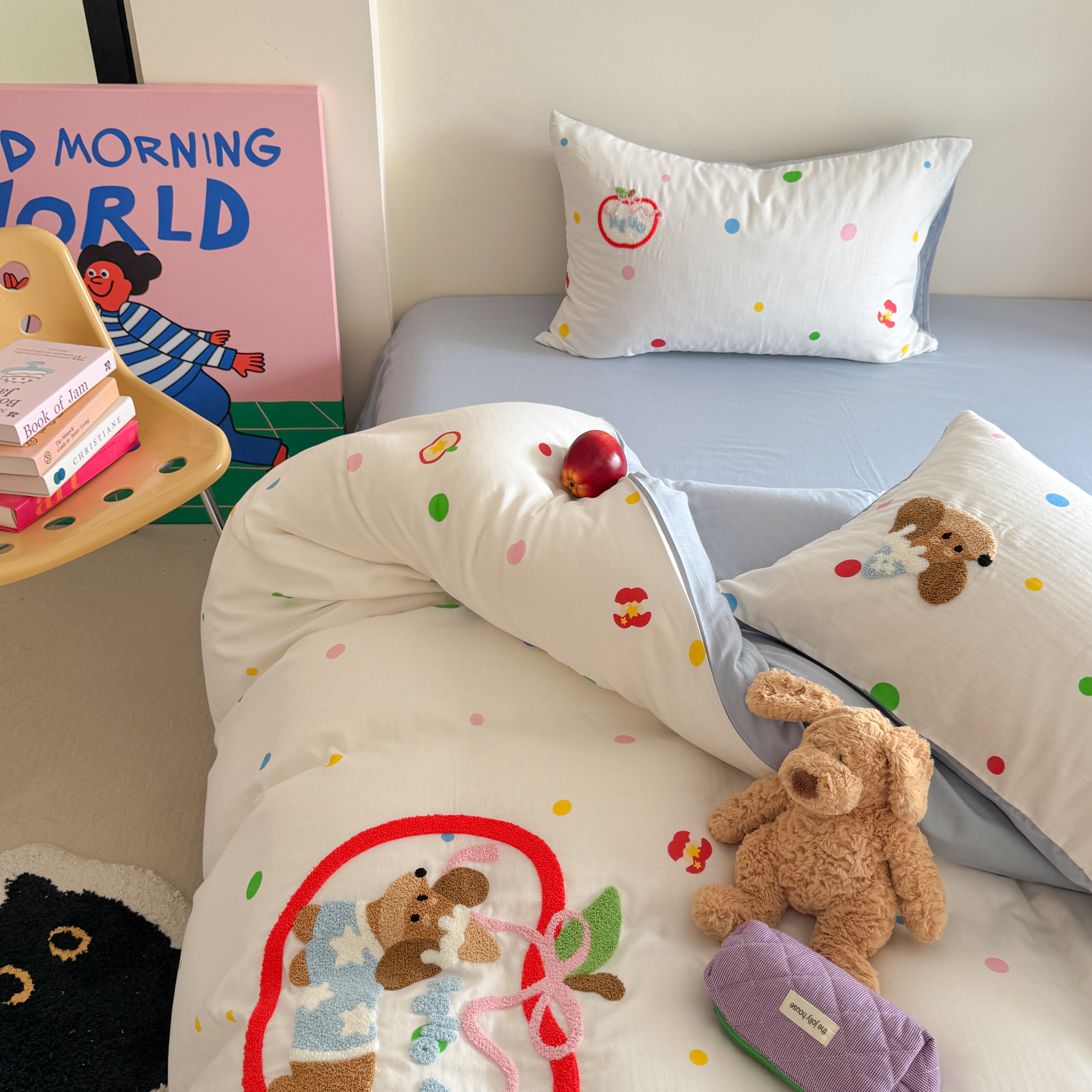 柚子 2025春夏新款全棉纯棉双层纱毛巾绣四件套 苹果狗