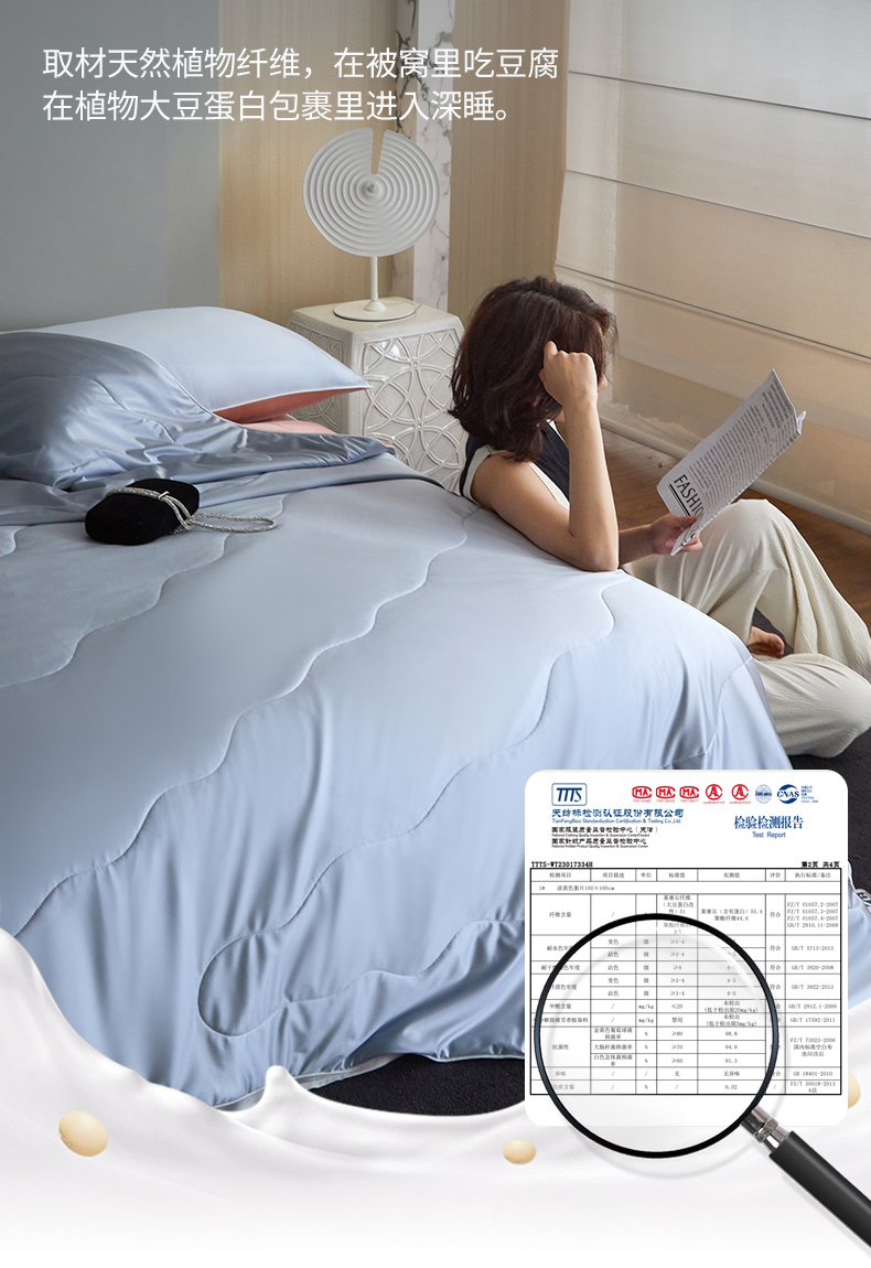 商品名称:头等舱 2025新款水光缎冰肌锦氨A类55植物大豆7A抗菌夏被配包装模特图 水光兰配水光粉