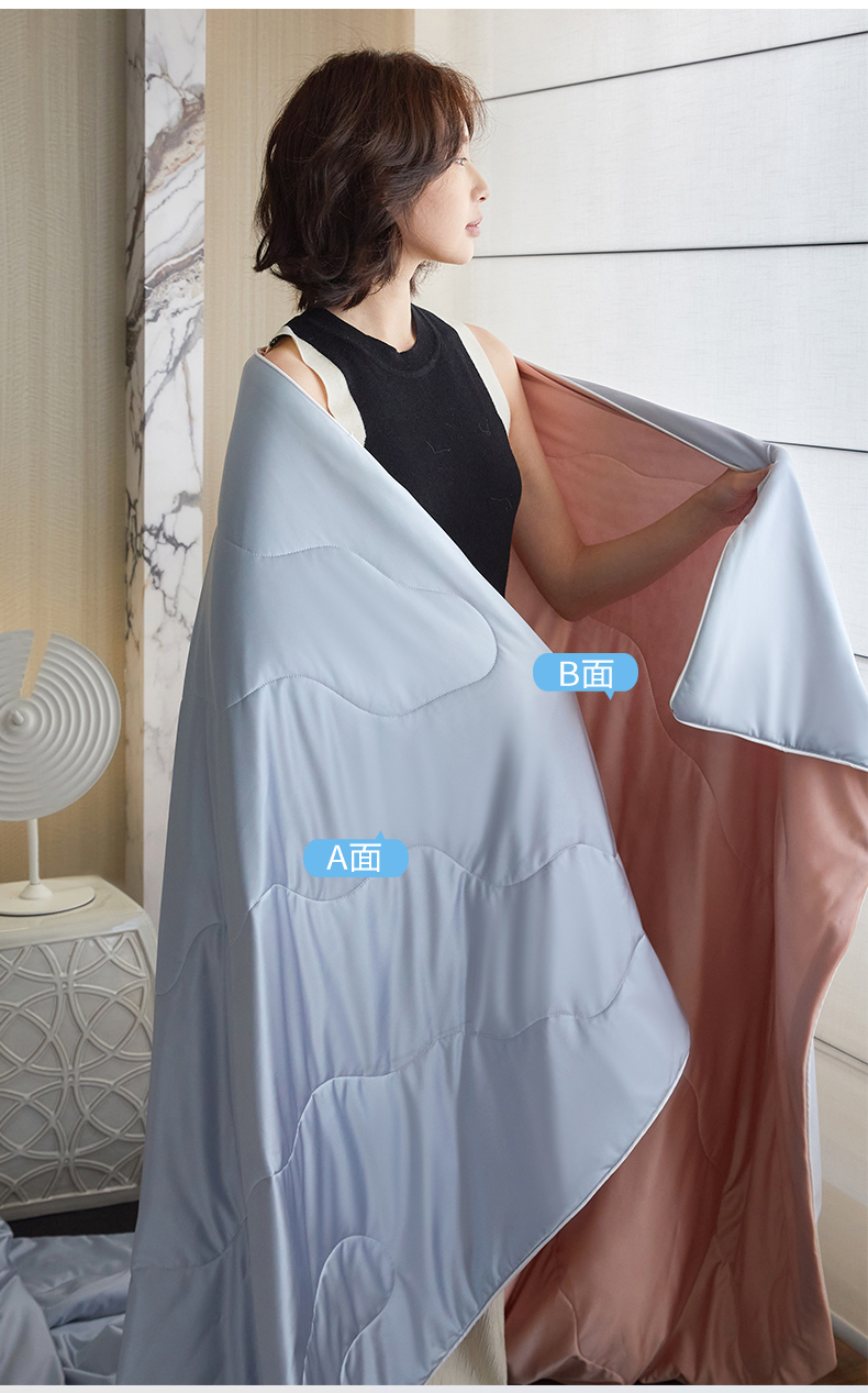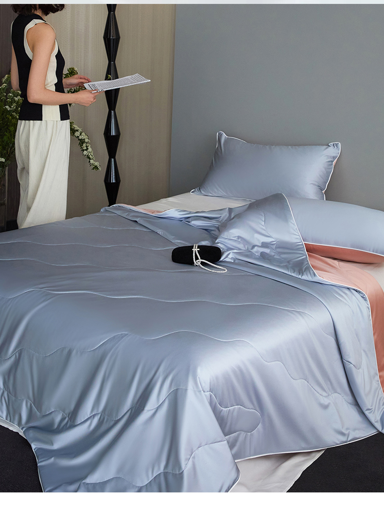 头等舱 2025新款水光缎冰肌锦氨A类55植物大豆7A抗菌夏被配包装模特图 水光兰配水光粉
