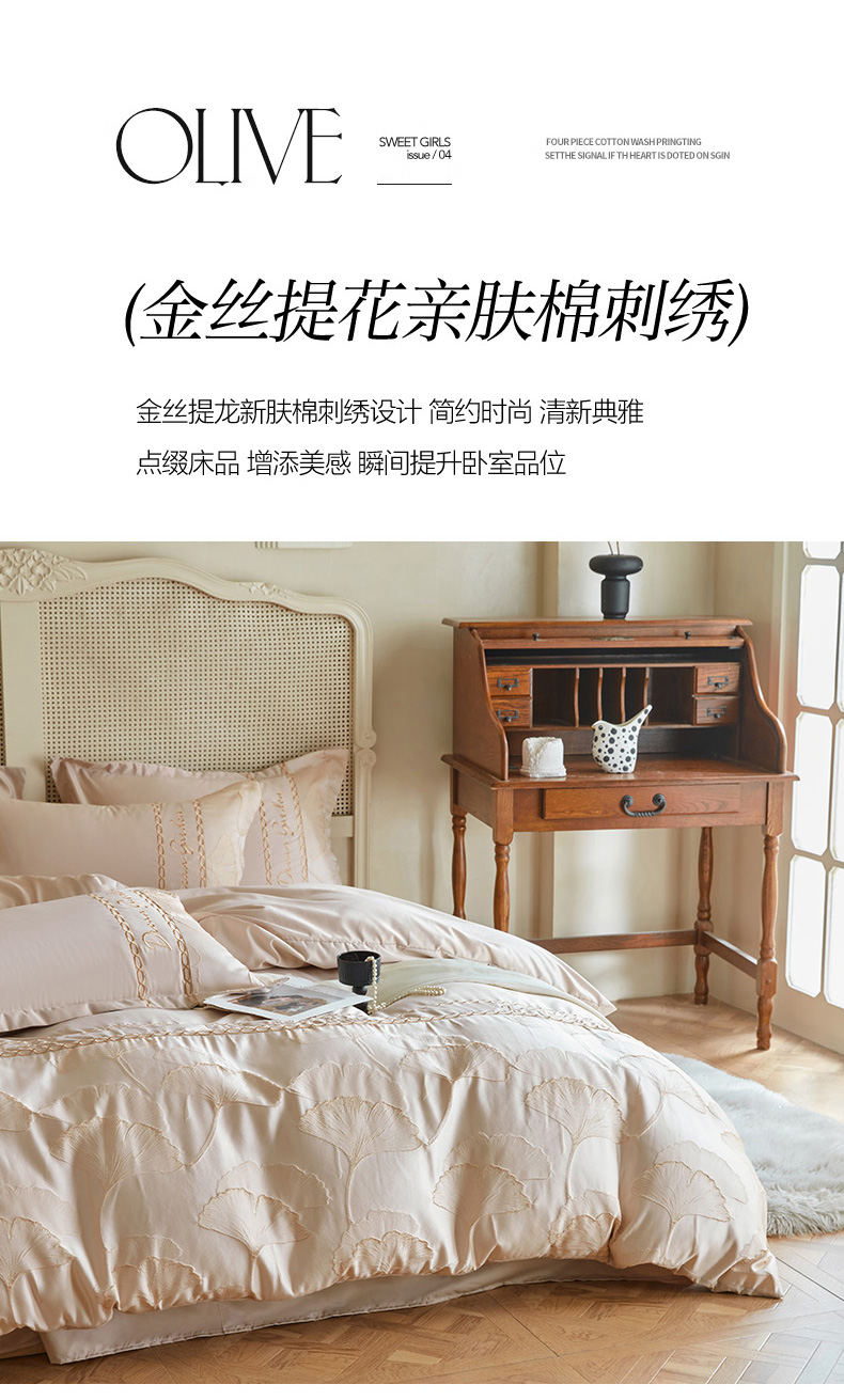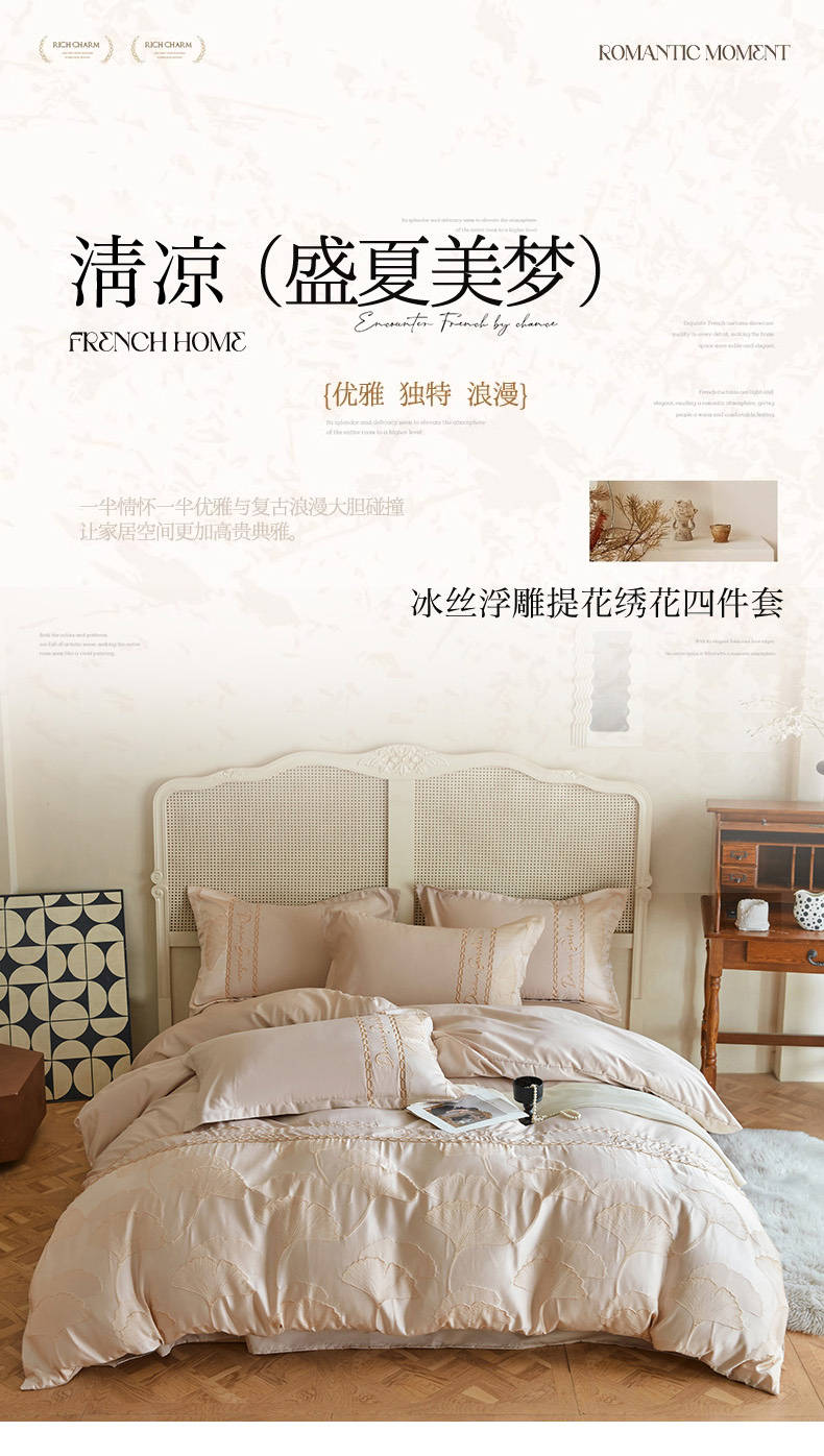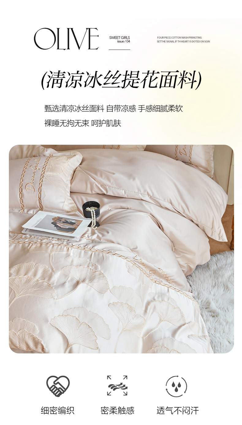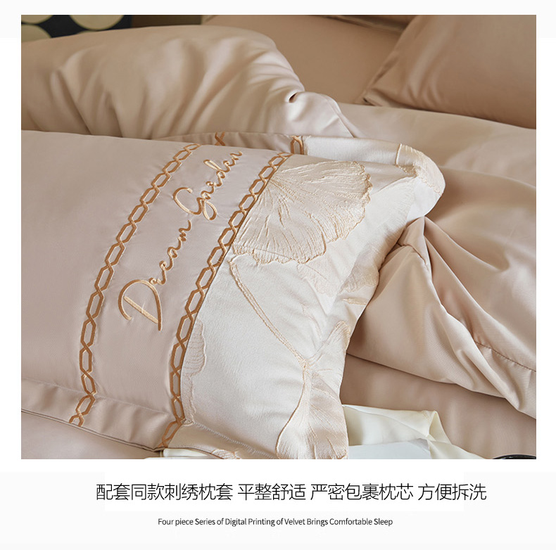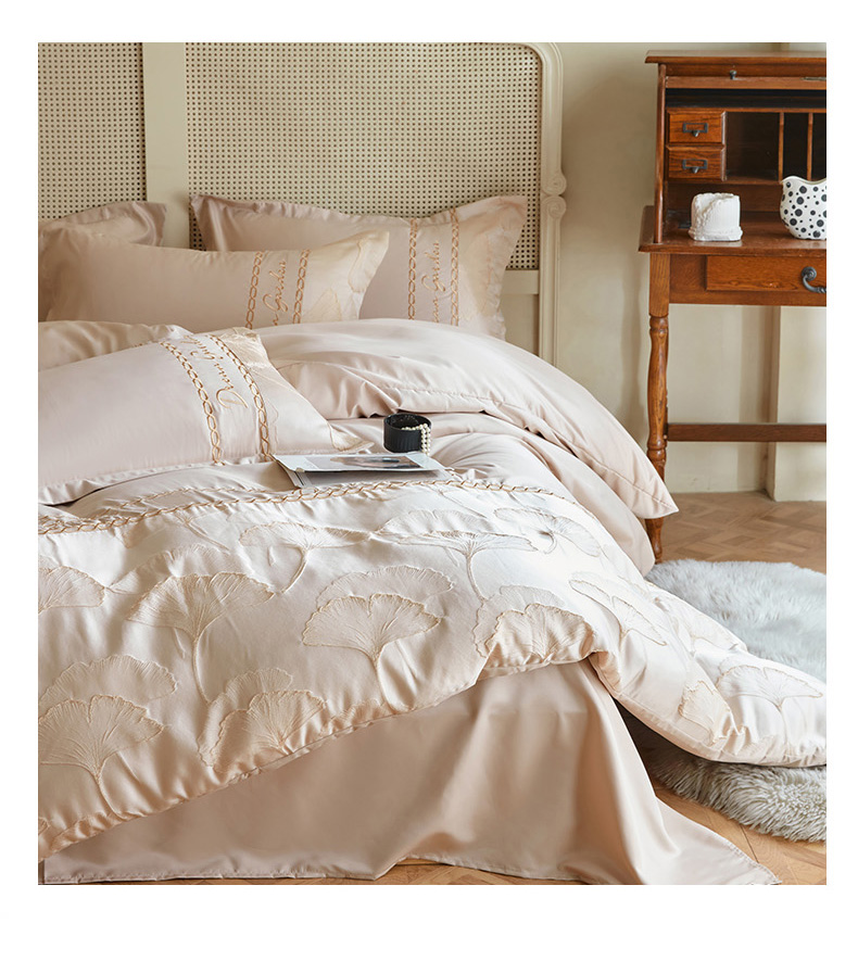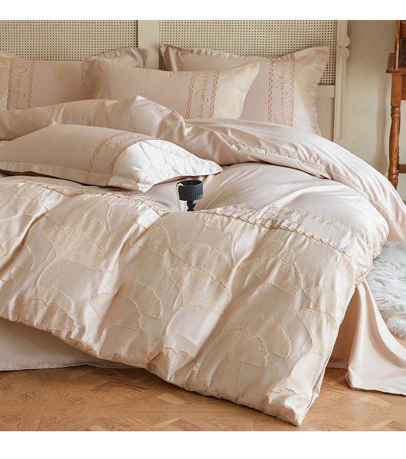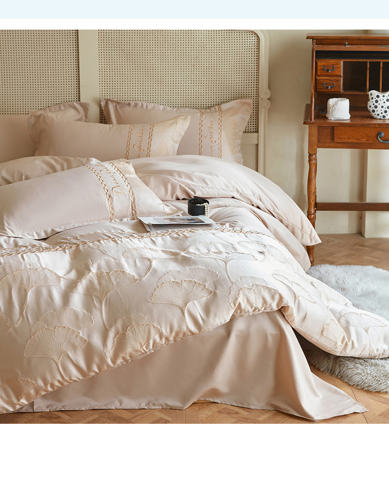 商品名称:菲儿2025新款冰丝浮雕提花绣花四件套 银杏叶-香槟