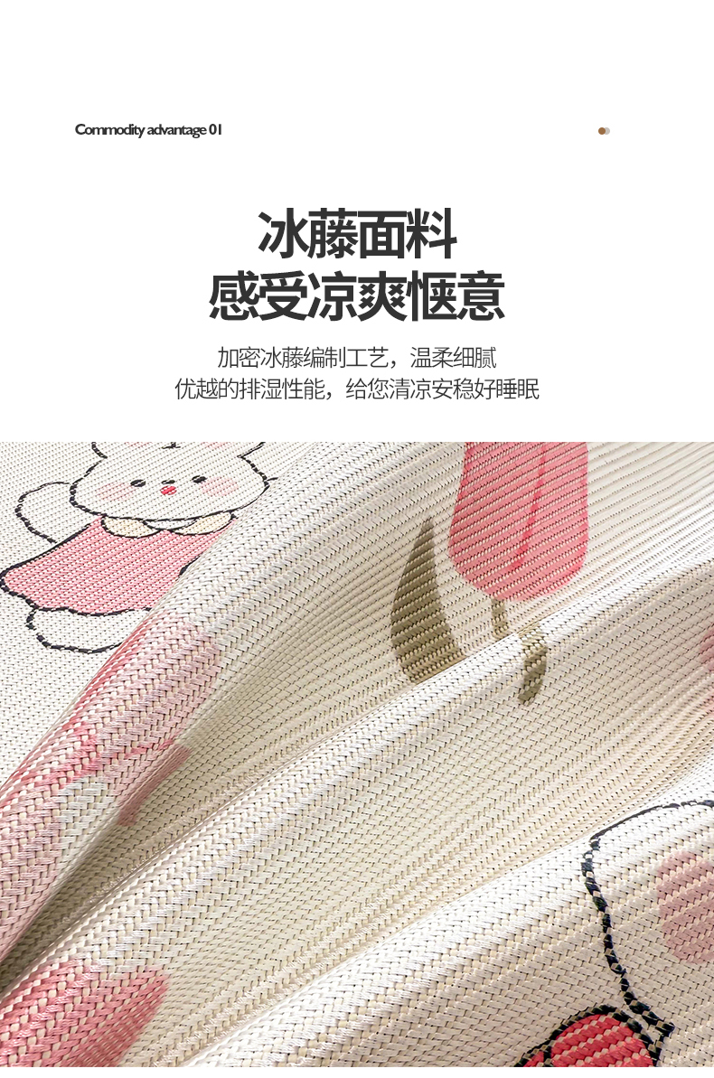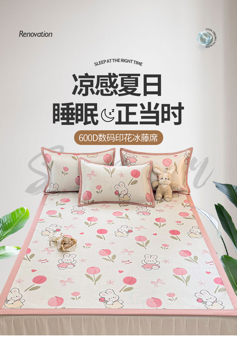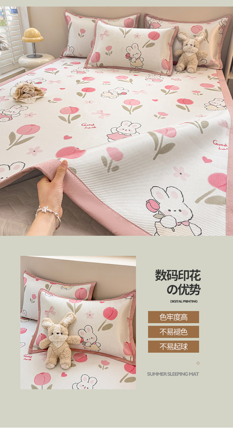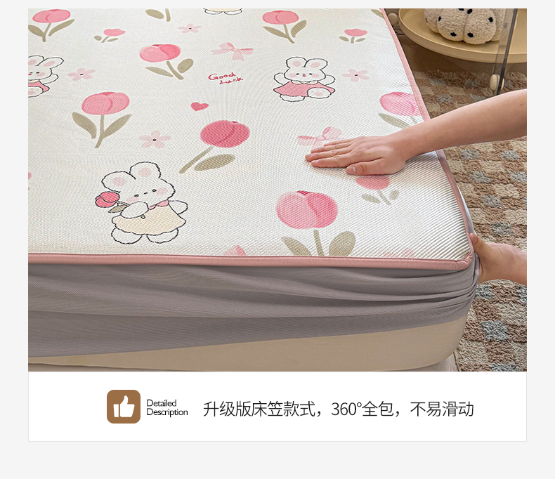 商品名称:典曼家纺 2025新款600D数码印花冰藤席席子凉席-床笠款 花朵粉兔-床笠款