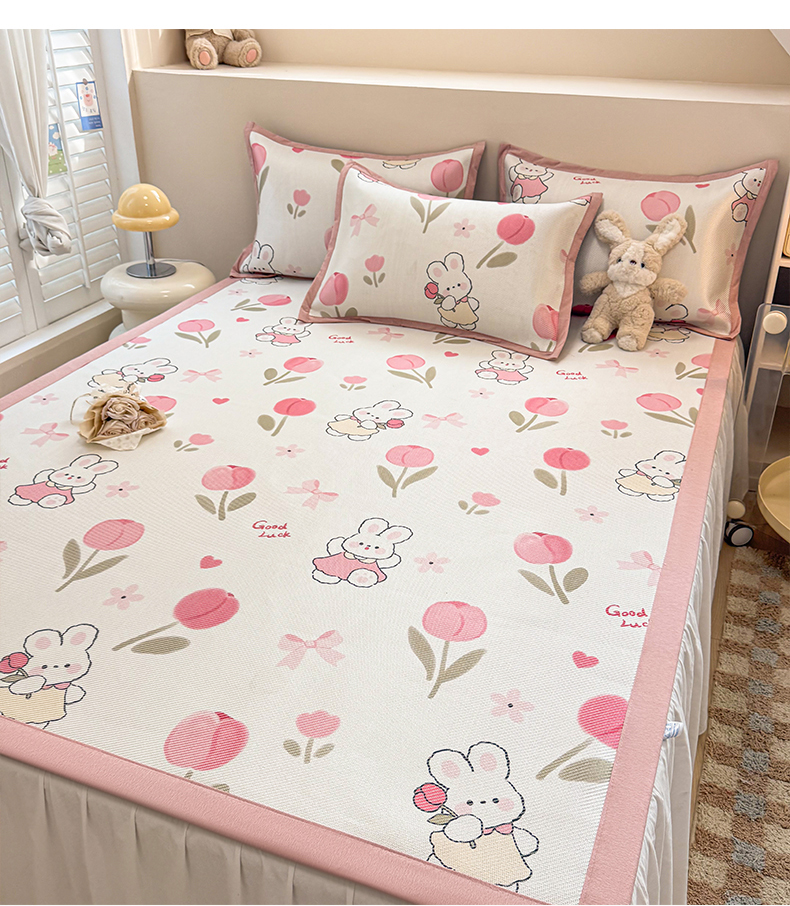典曼家纺 2025新款600D数码印花冰藤席席子凉席-床笠款 花朵粉兔-床笠款