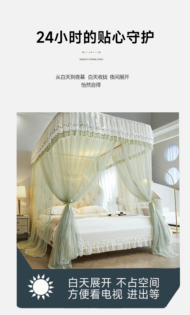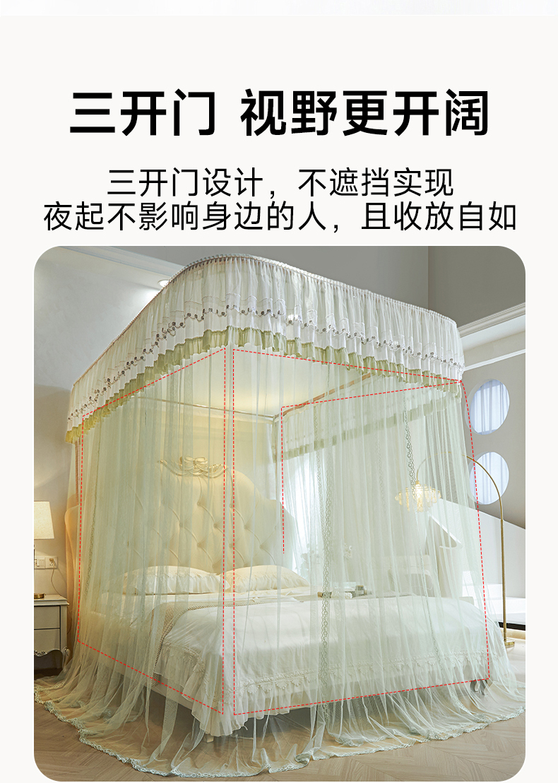 (总)2025新款双层花边全包围床笠款三开门蚊帐-幽梦星辰,奶黄,藕玉,颜淡蓝