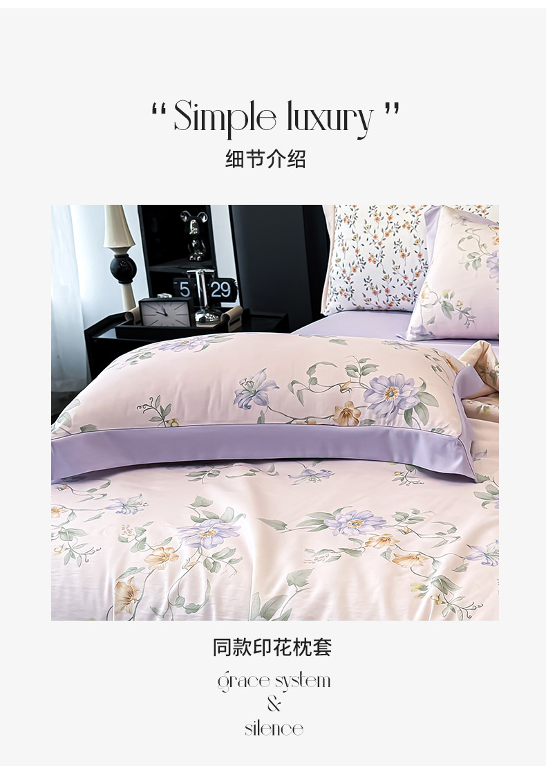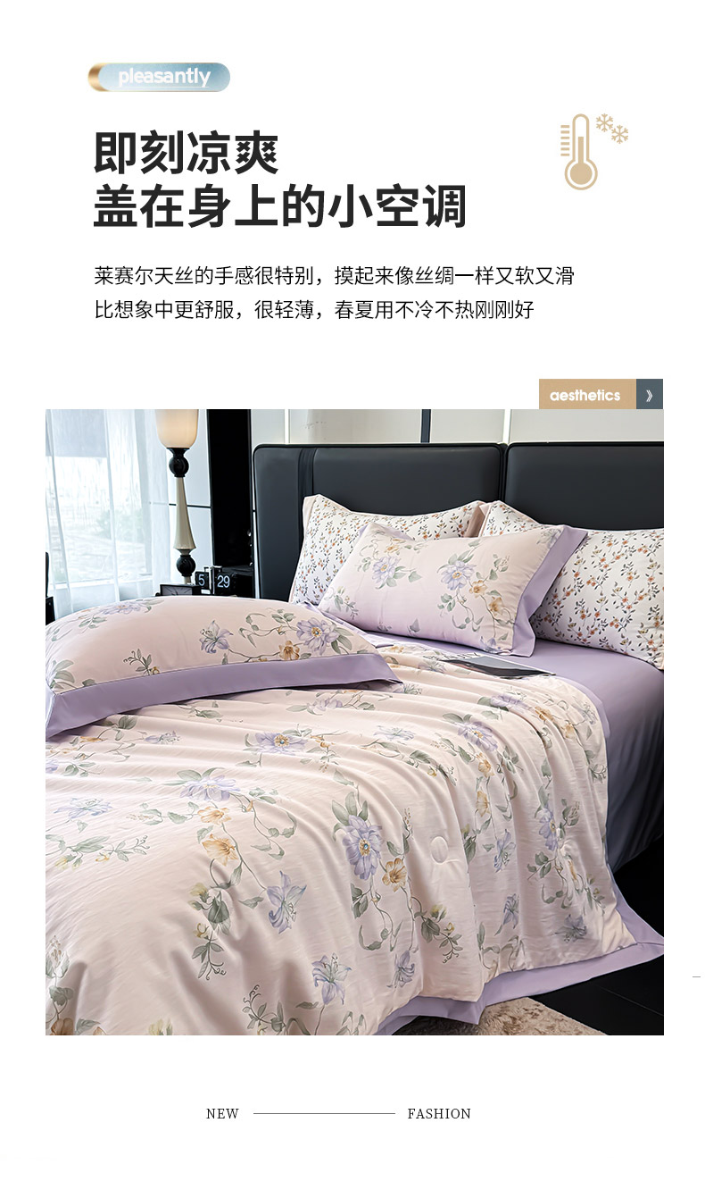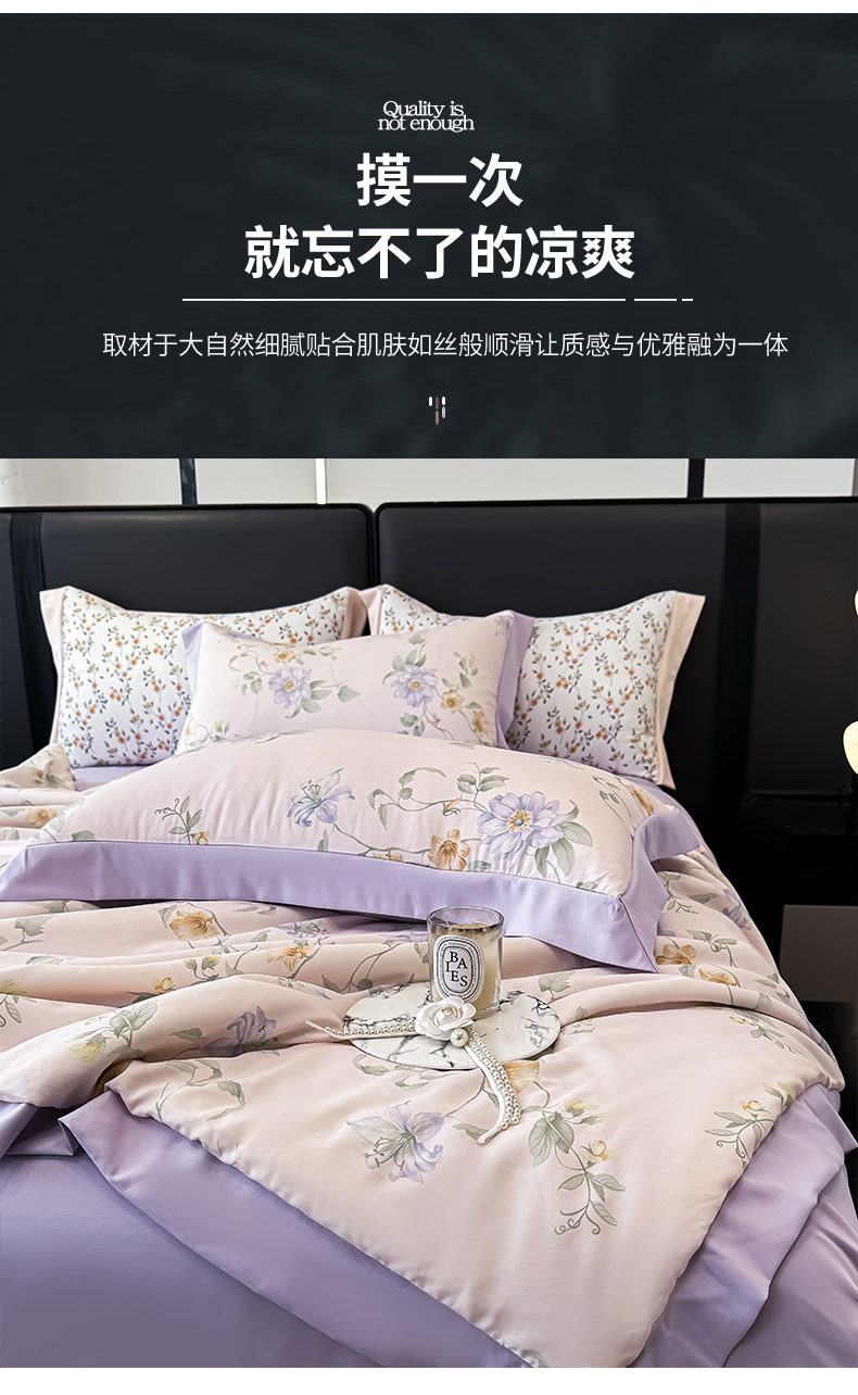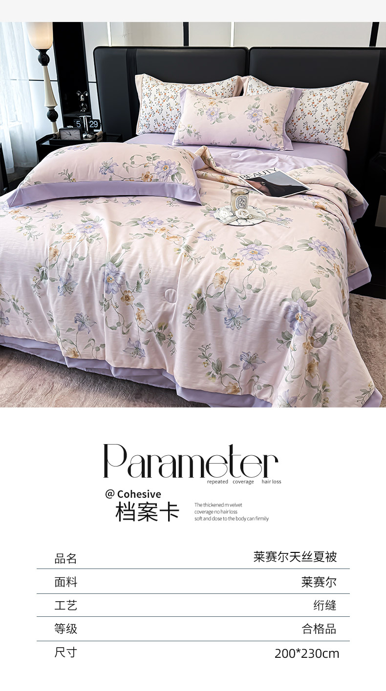 商品名称:合欢(原天一阁)2025新款莱赛尔拼角工艺款天丝夏被四件套 花梦-紫
