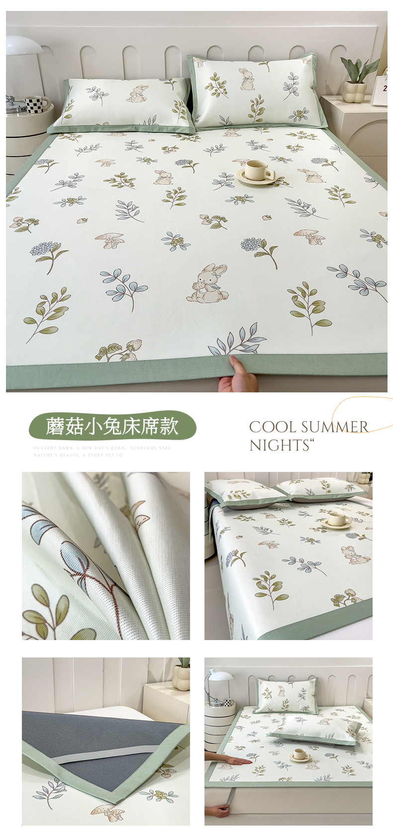 商品名称:倾慕家纺 2025年新款600D丝滑冰丝凉席-床席款 蘑菇小兔