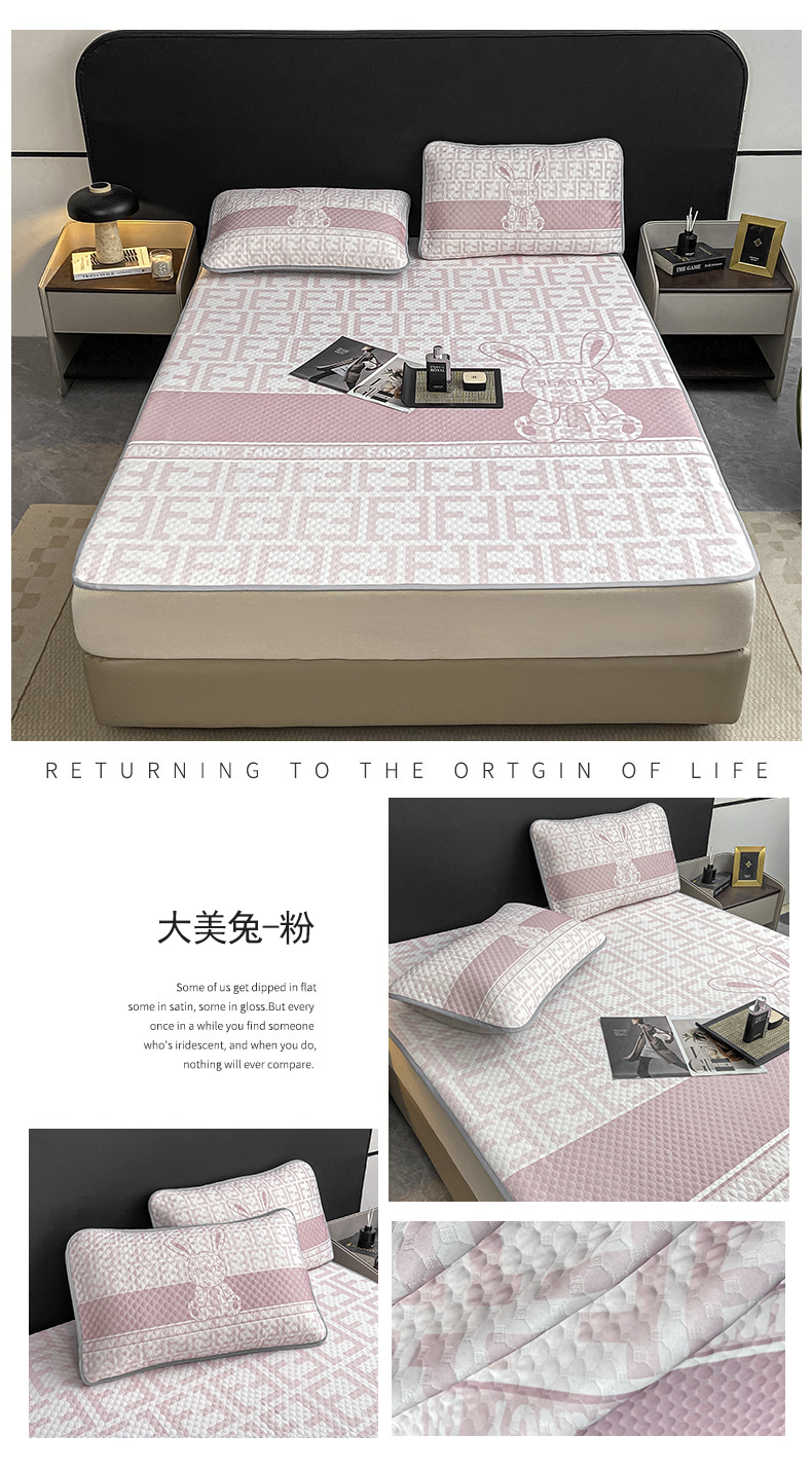 • 91家纺网 家纺一手货源 找家纺 慕梵家居 2025新款大版印花冰豆豆凉席席子三件套 繁花-粉