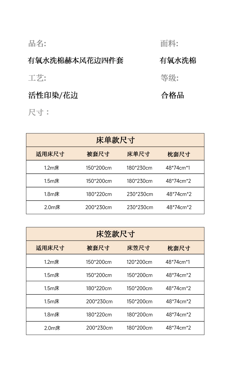 2.0m床笠四件套【被套200*230cm 床笠180*200cm 】 | ¥58.00 |