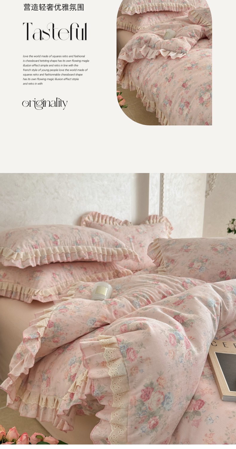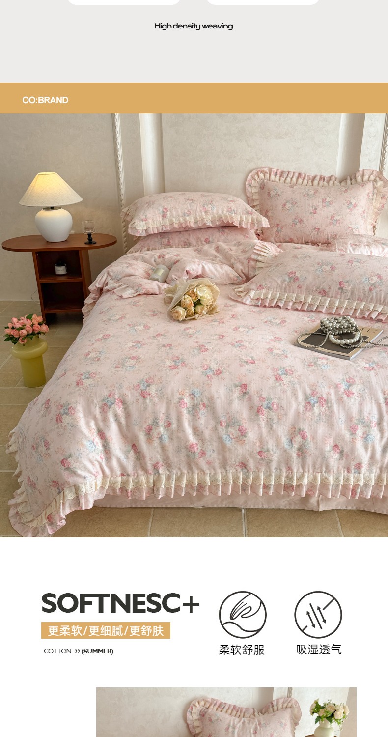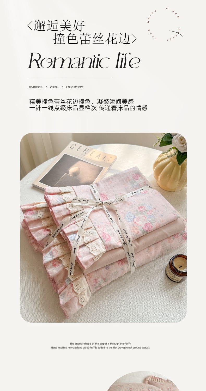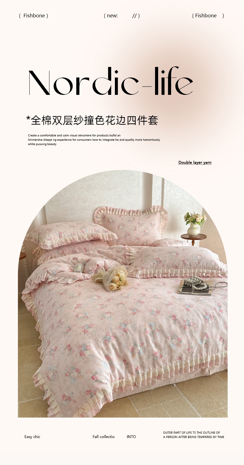 简宜家居(朝初家纺) 2025新款40s全棉纯棉双层纱撞色蕾丝花边四件套 牡丹恋梦-粉