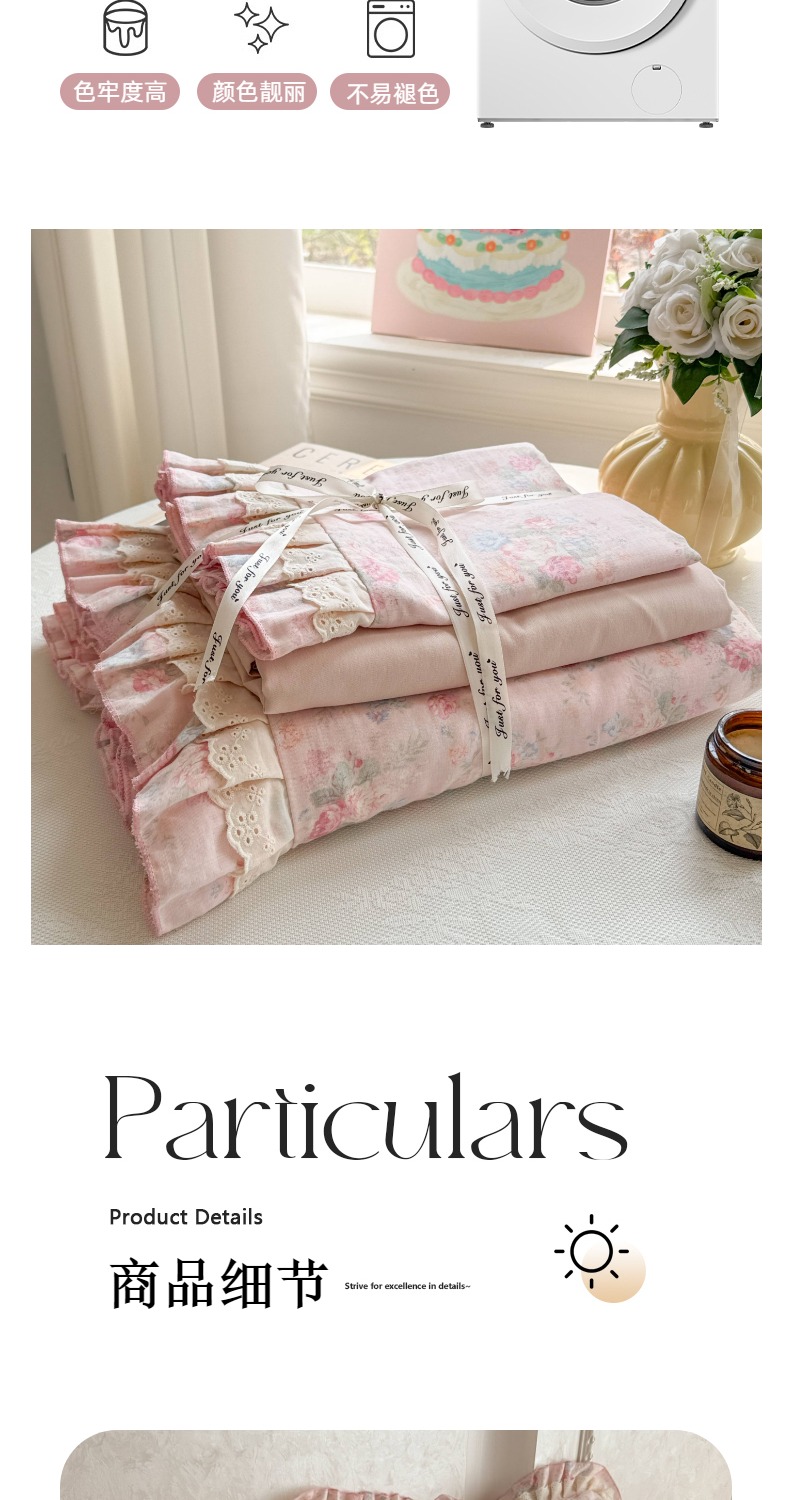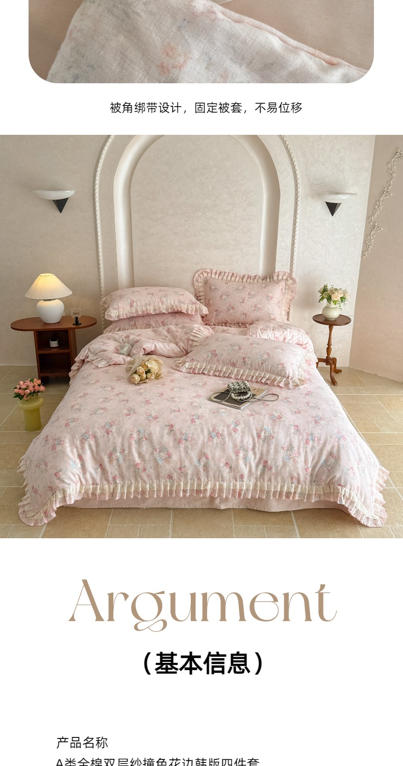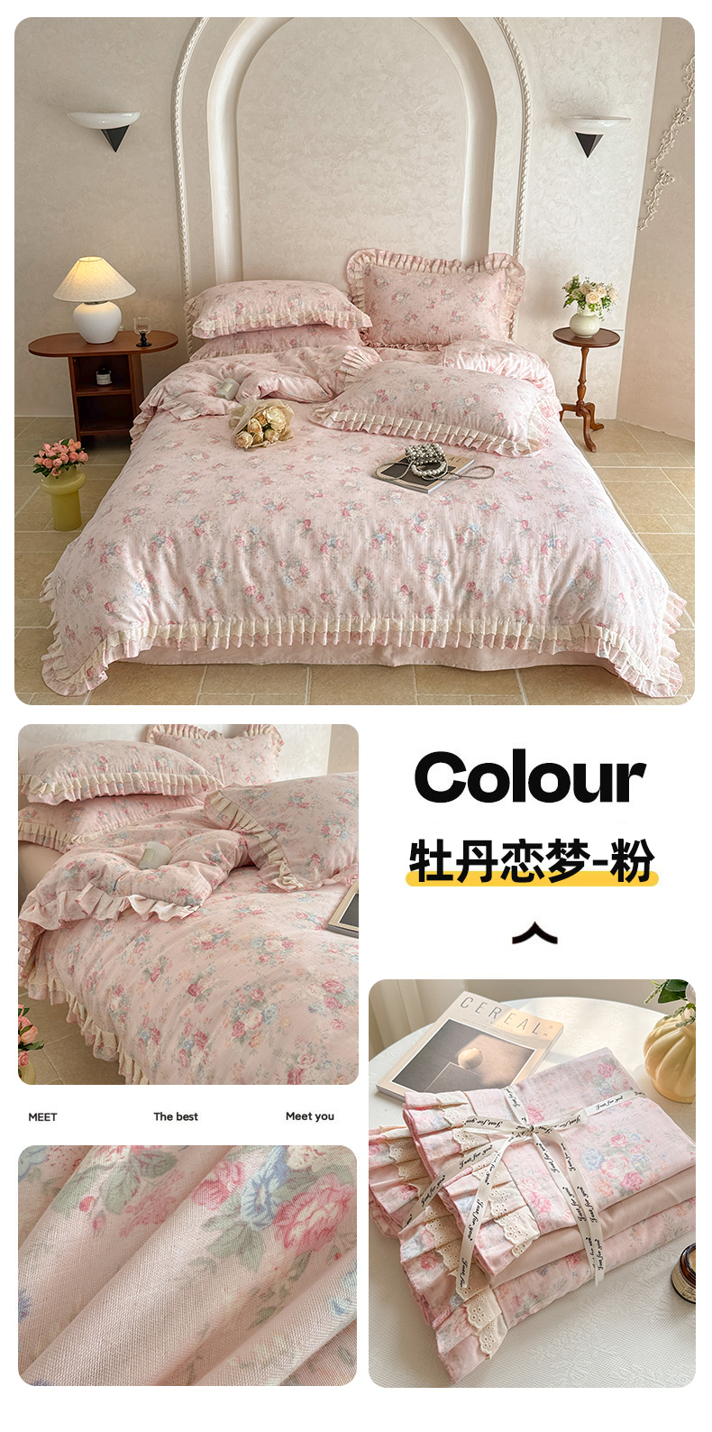 商品名称:简宜家居(朝初家纺) 2025新款40s全棉纯棉双层纱撞色蕾丝花边四件套 牡丹恋梦-粉