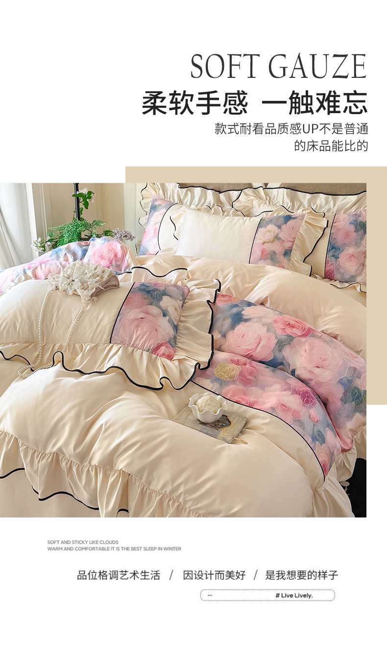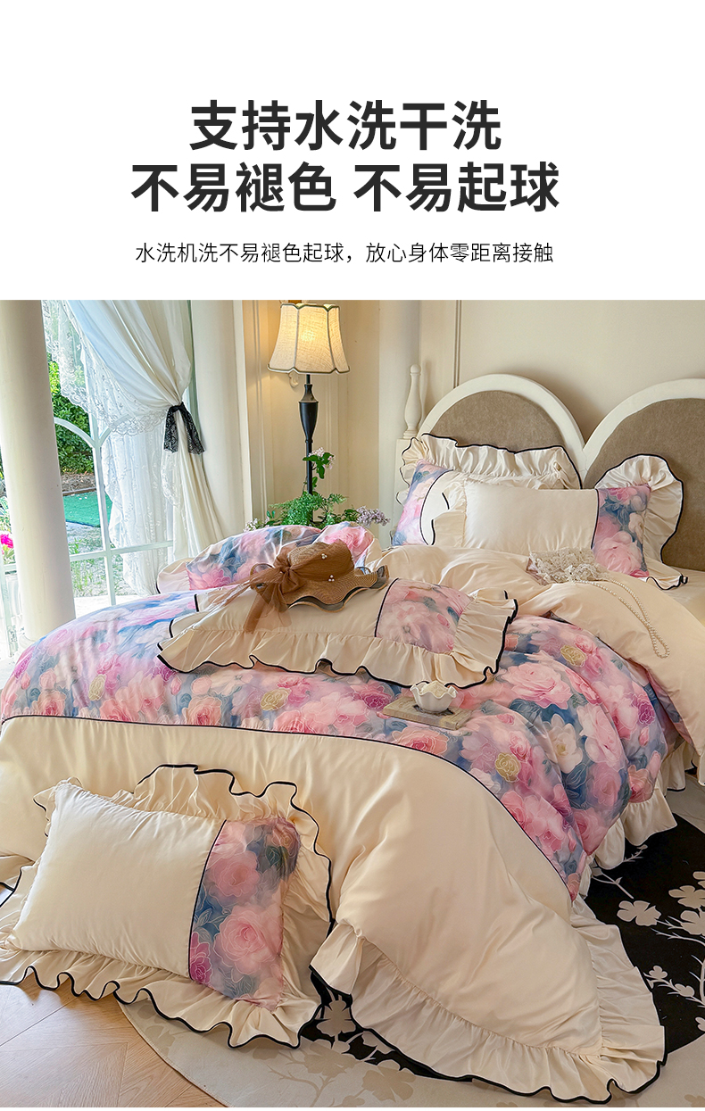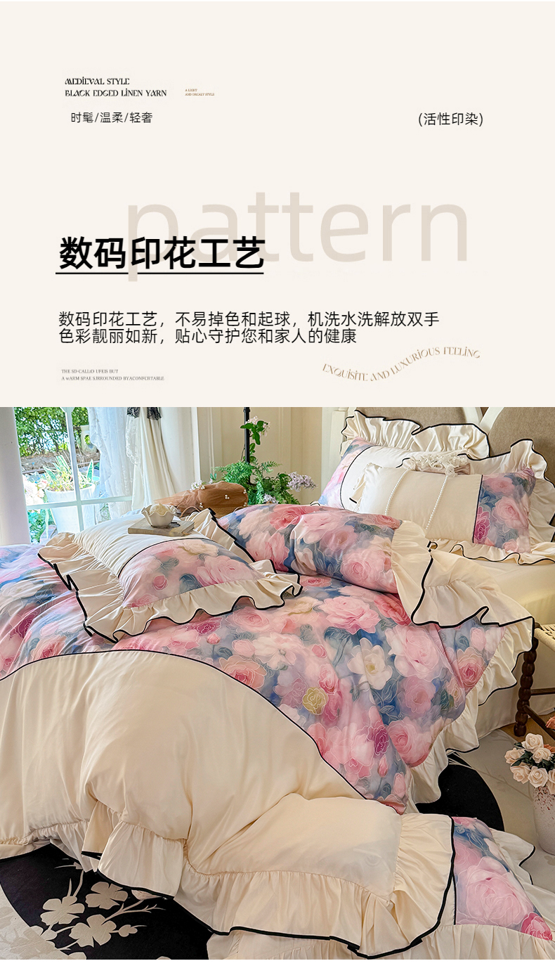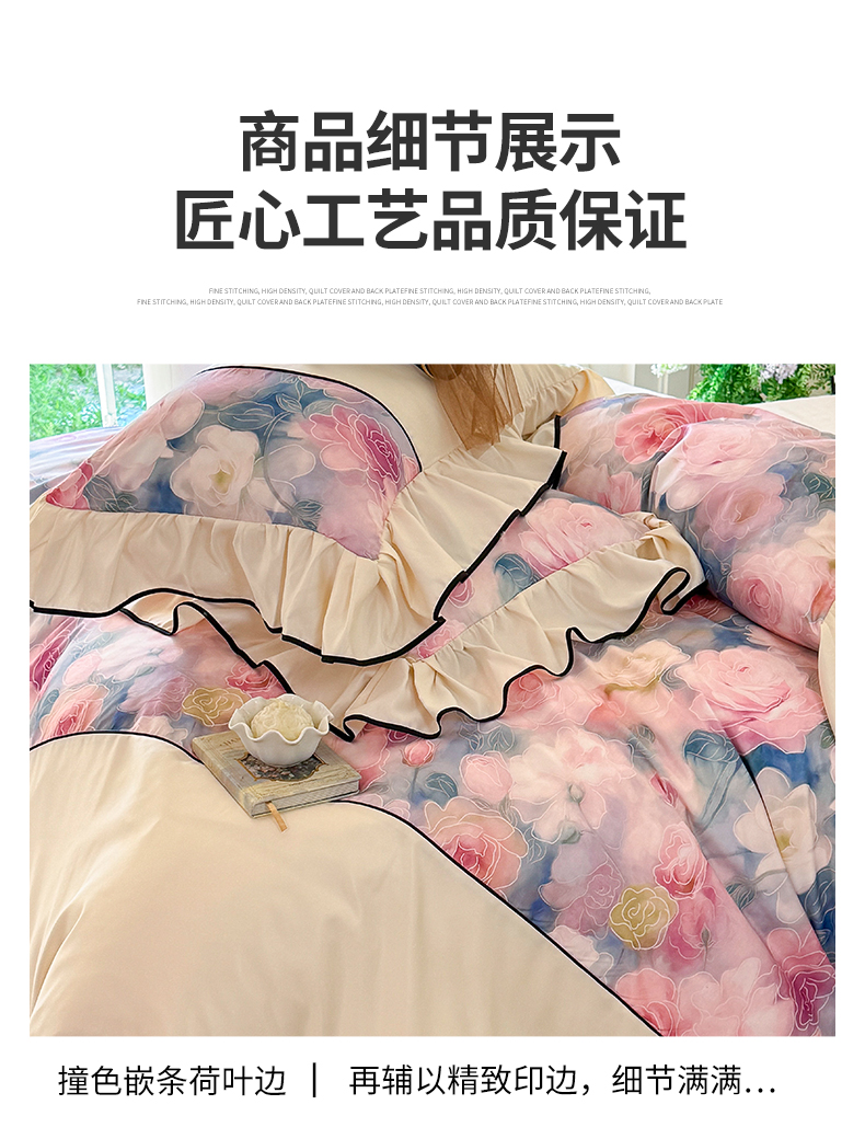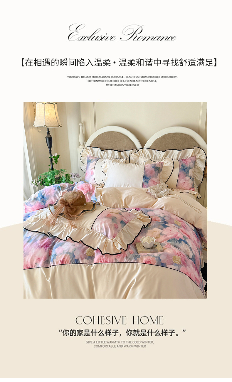 商品名称:宅家居 2025新款A类水洗亲肤棉磨毛法式拼接数码印花奶油韩式花边款四件套 暖暖花香