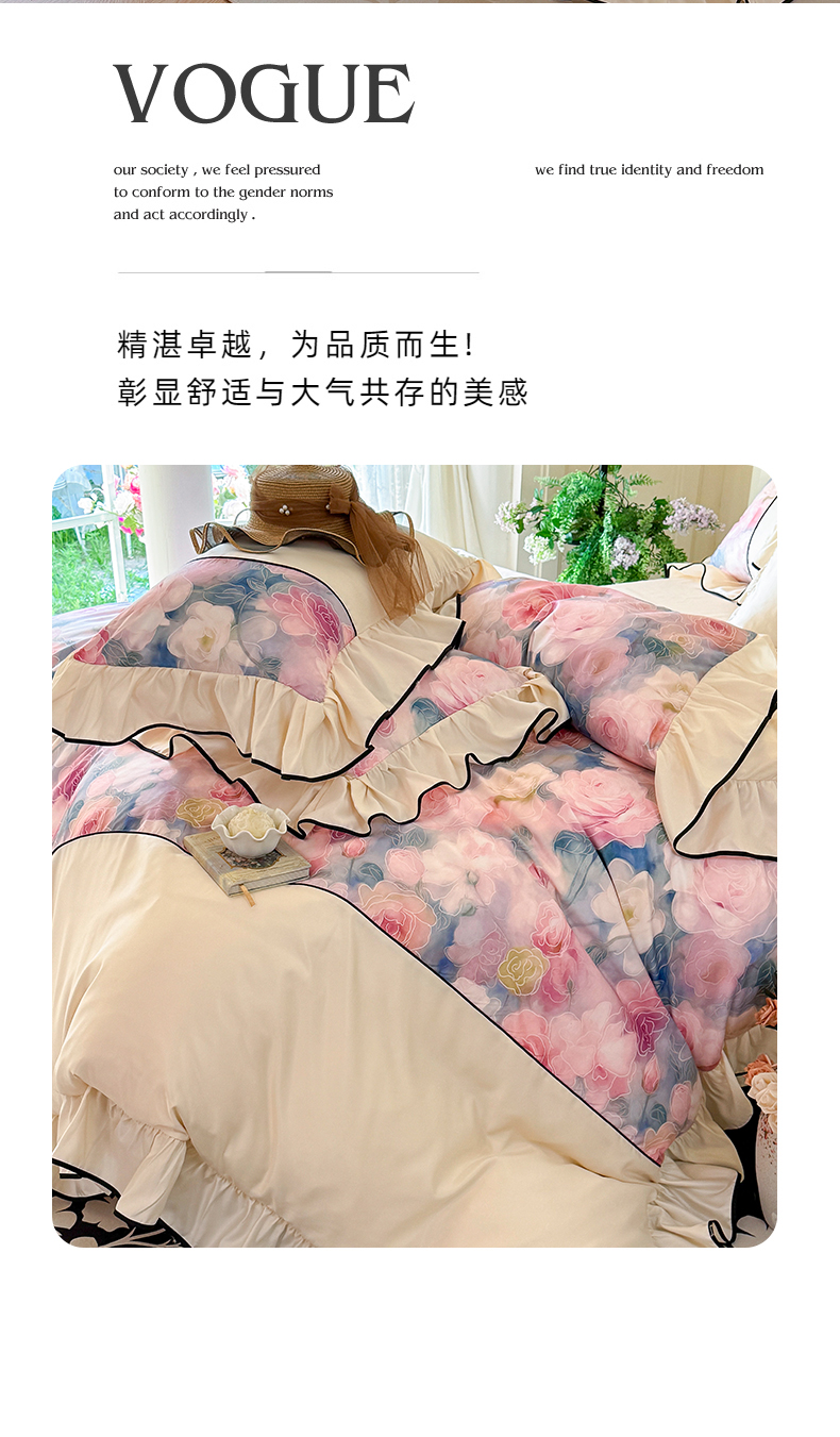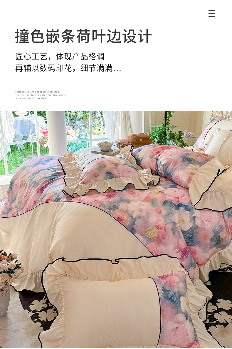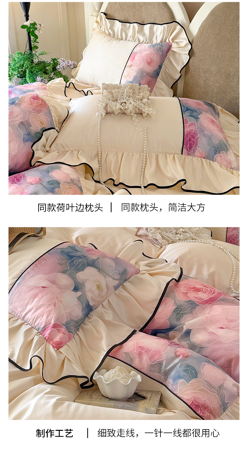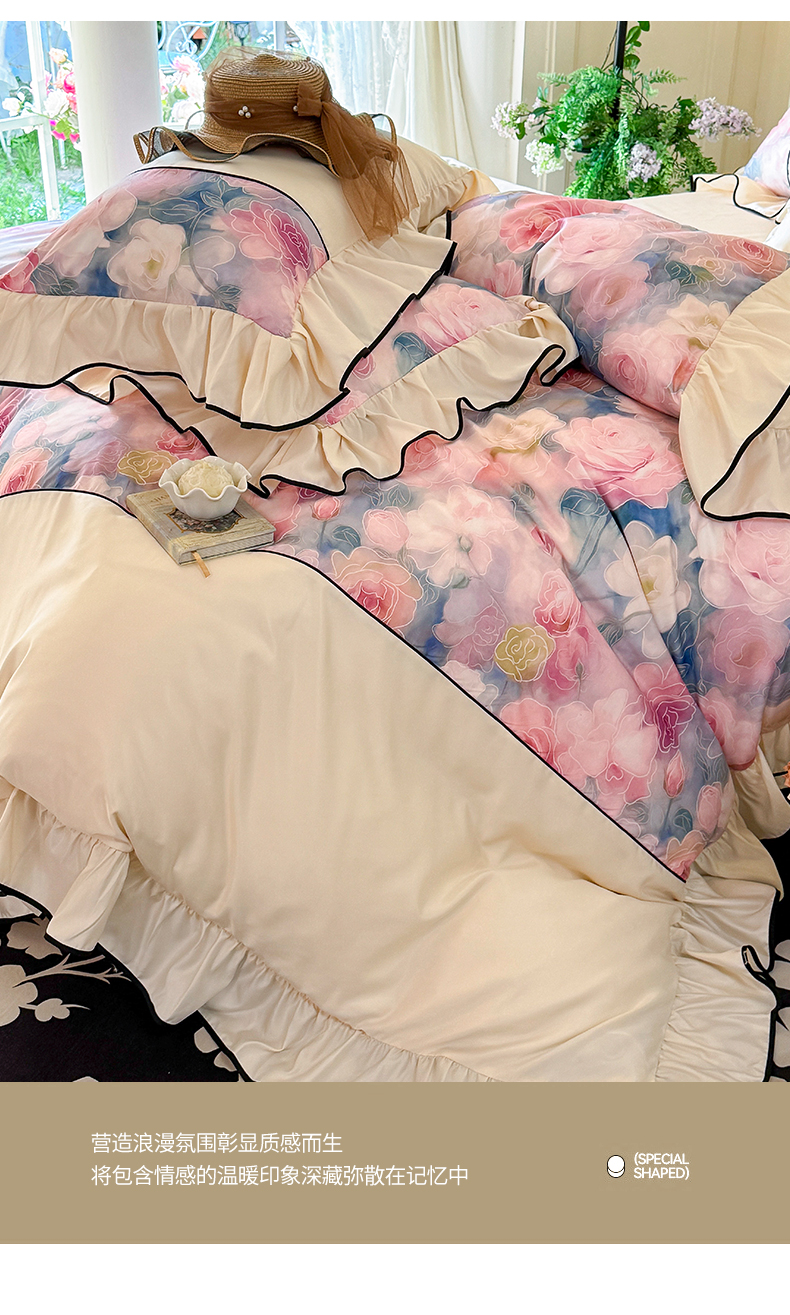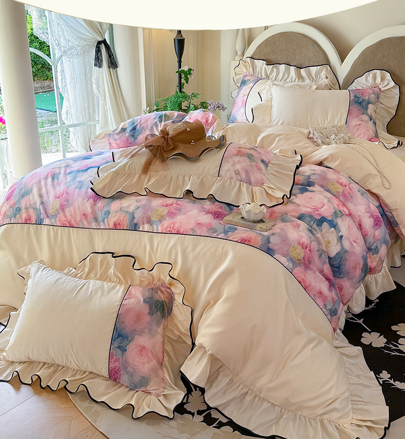 商品名称:宅家居 2025新款A类水洗亲肤棉磨毛法式拼接数码印花奶油韩式花边款四件套 暖暖花香
