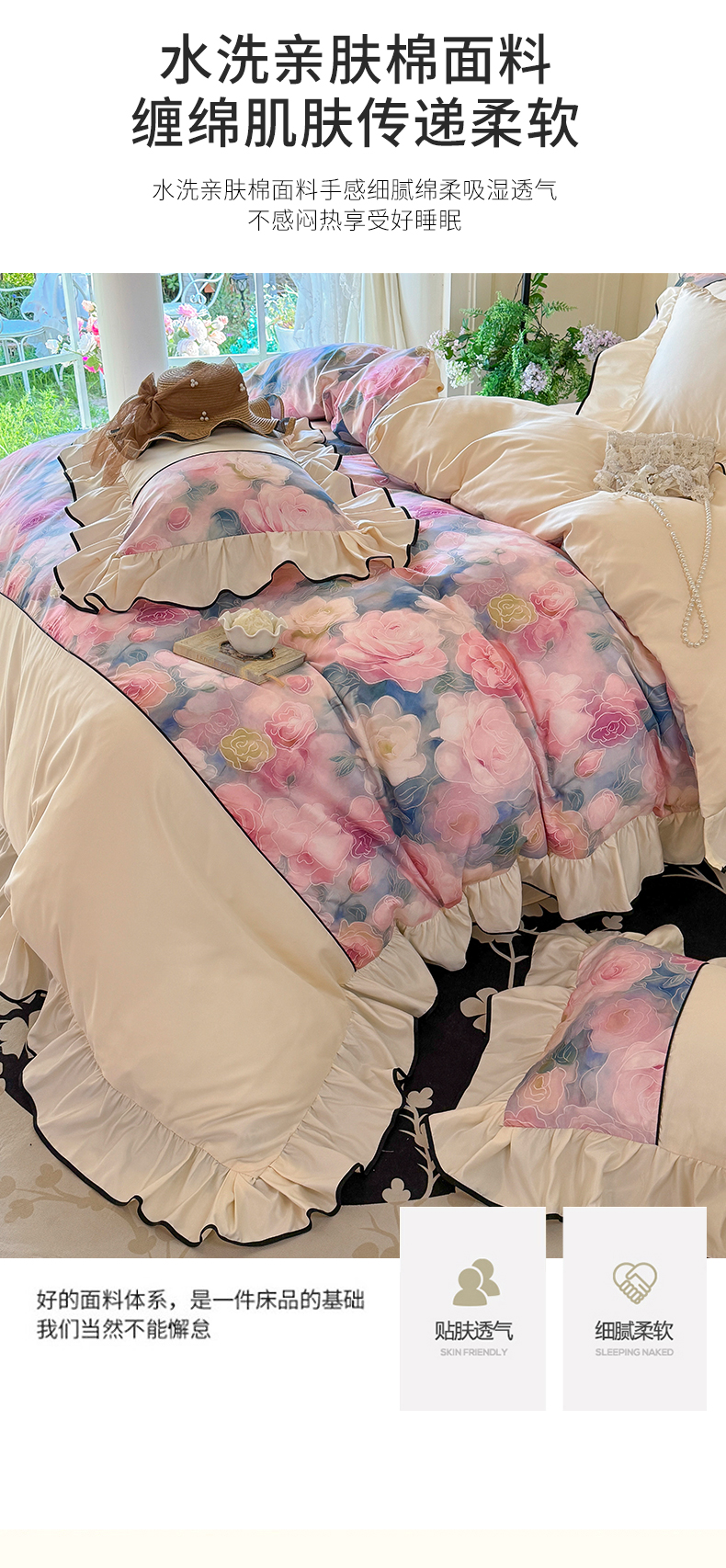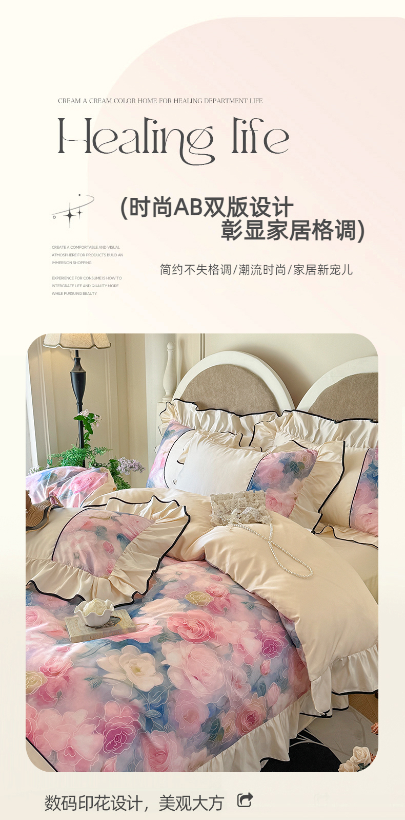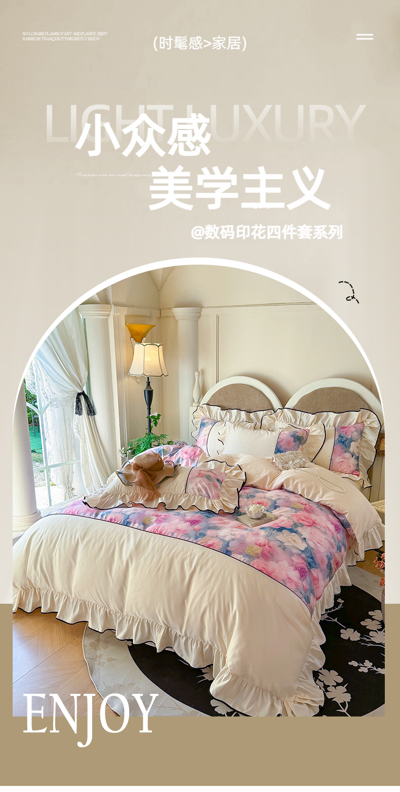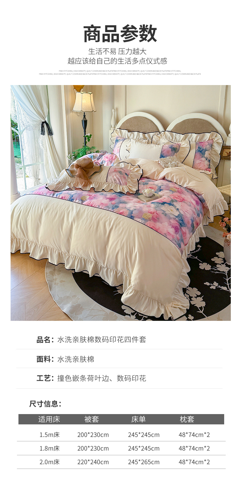 商品名称:宅家居 2025新款A类水洗亲肤棉磨毛法式拼接数码印花奶油韩式花边款四件套 暖暖花香