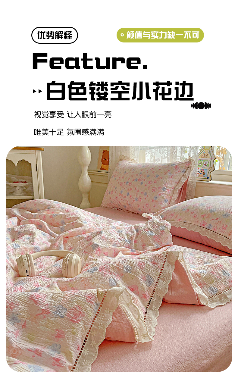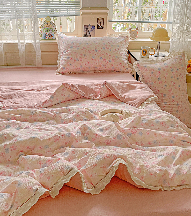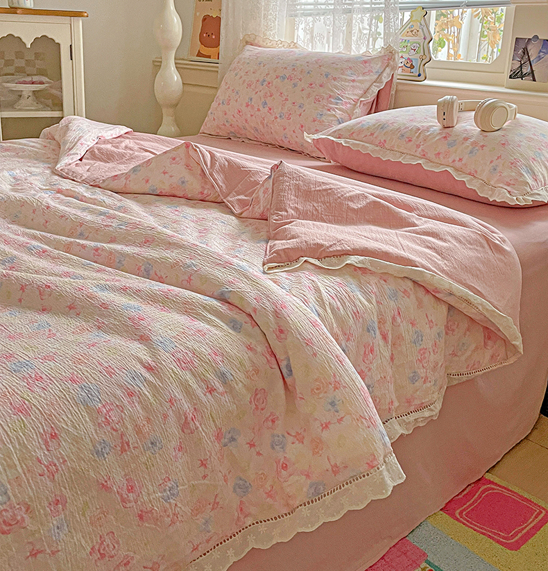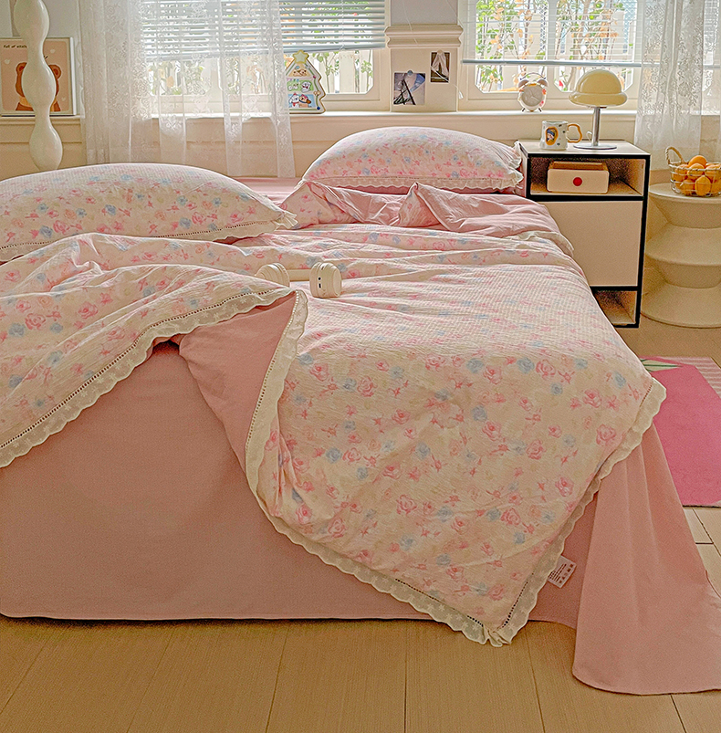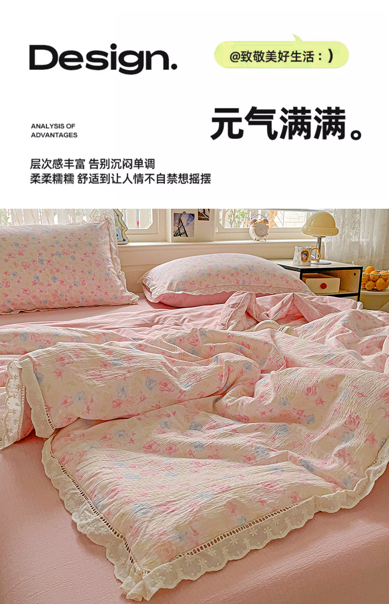 暖芯优选 2025新款皱皱双层纱全棉花边夏被夏凉被空调被三件套 花涧