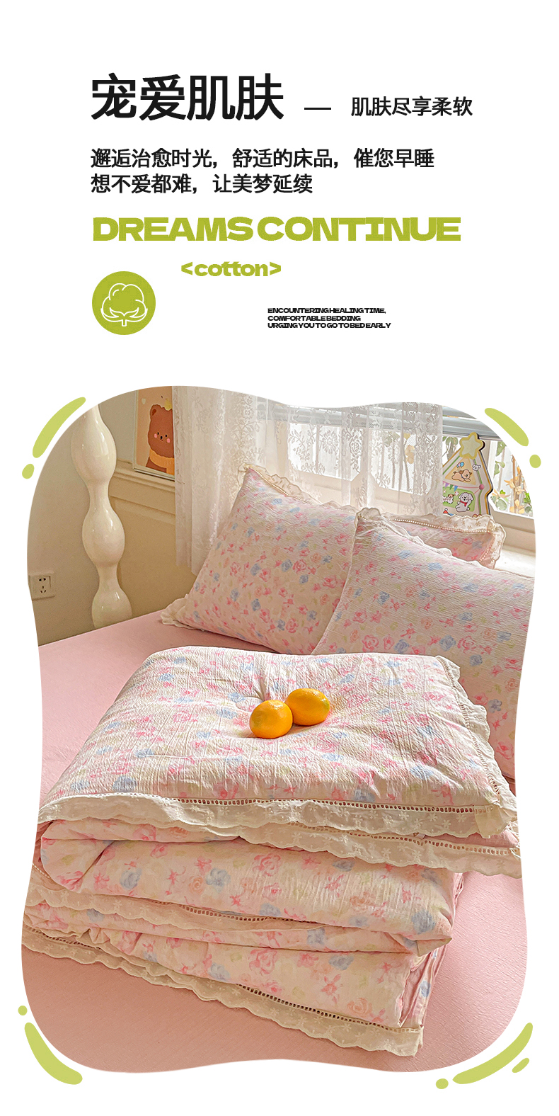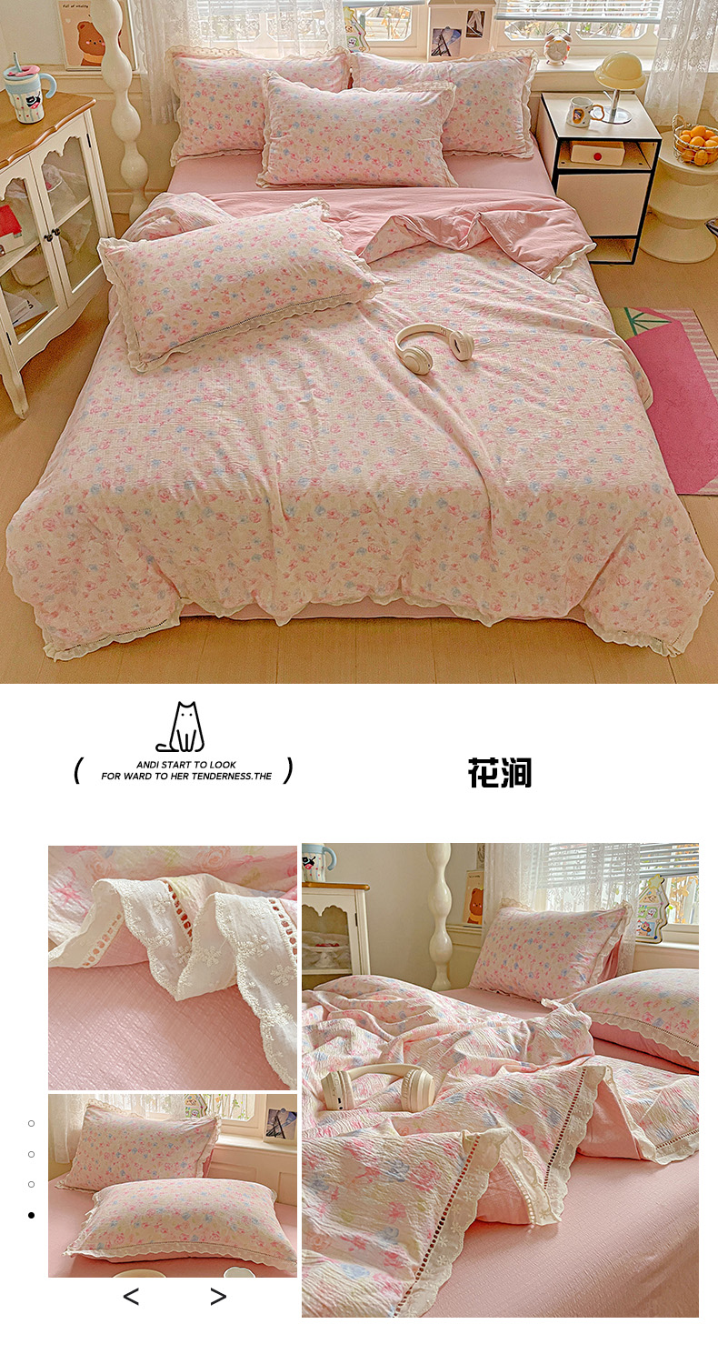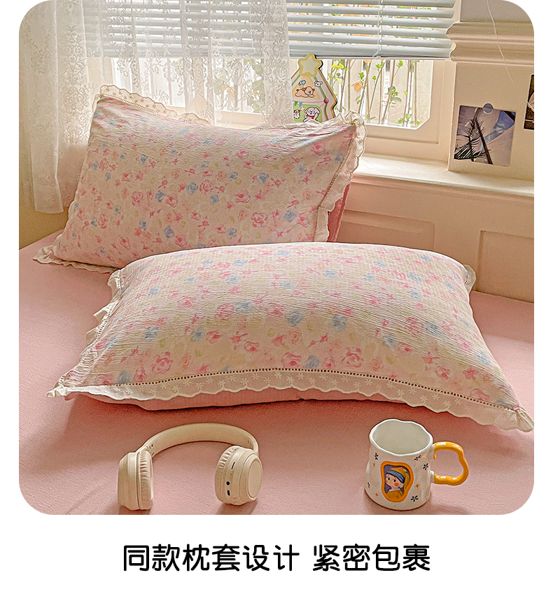 暖芯优选 2025新款皱皱双层纱全棉花边夏被夏凉被空调被三件套 花涧