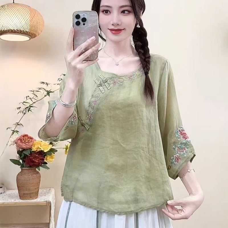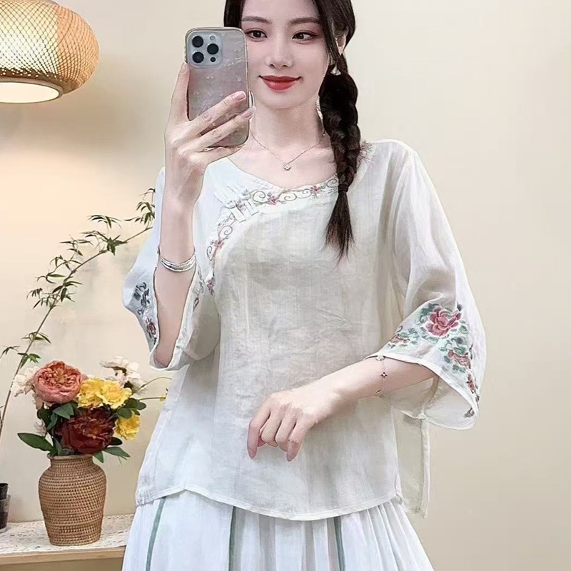 洛兰沙家居馆【只代发】【只代发】 2025新款国风夏季棉麻斜襟绣花上衣盘扣文艺中国民族刺绣复古茶服衬衫 白色
