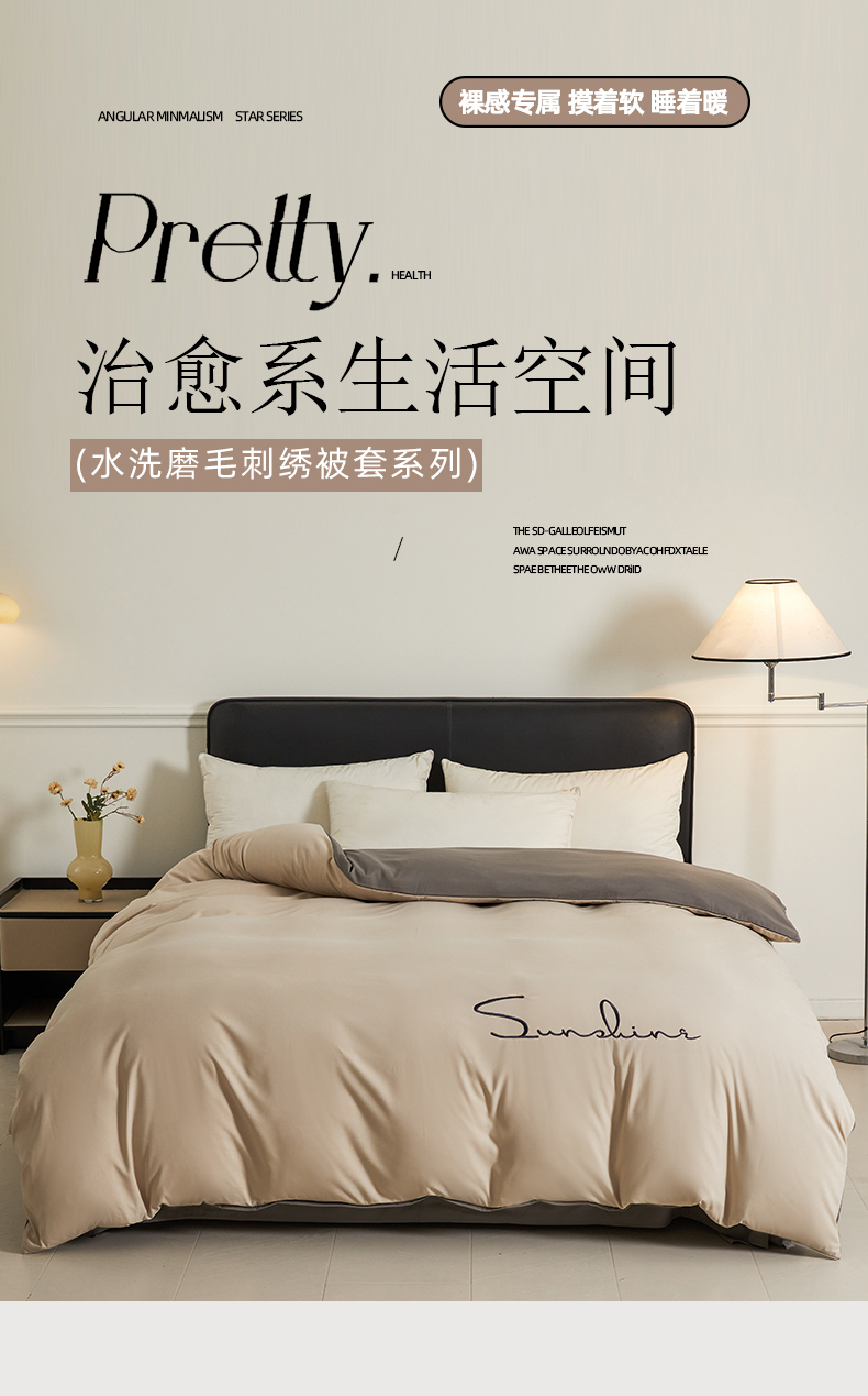 七仙女家纺 2025新款水洗磨毛刺绣轻奢简约系列单被套单品被套被套单件 奶茶+浅灰