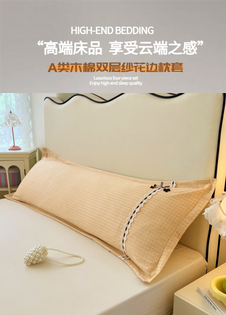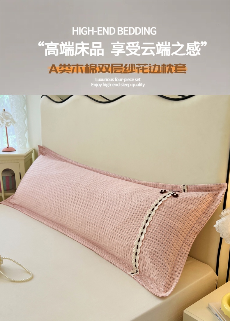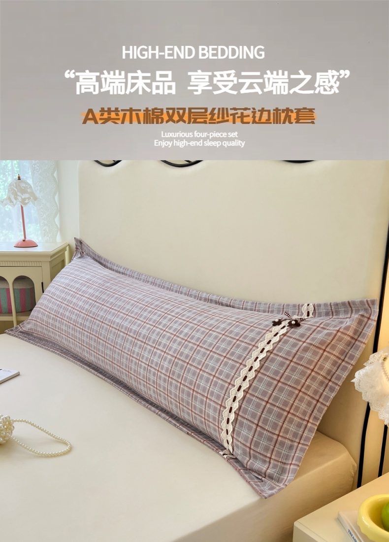 (总)梦舒羽 2025新款双层纱蕾丝花边格子枕套宿舍双人情侣1.8m枕芯套1.5米内胆套