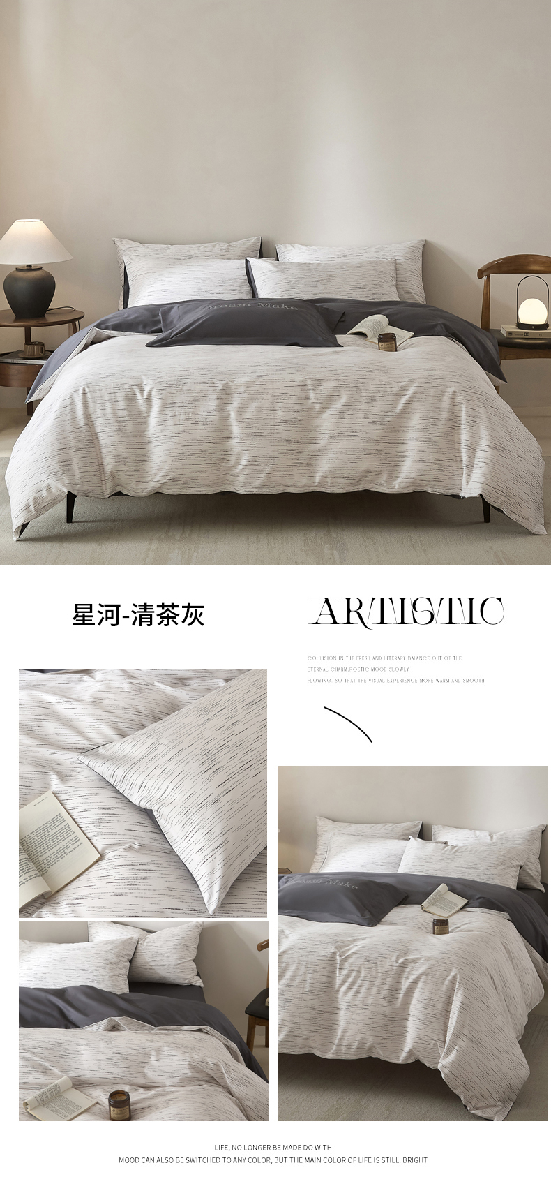 商品名称:ONE TWO ONE 121 2025新款高端贡缎高支高密数码印花四件套-星河(平台控价券后不得低于318/338元) 星河-清茶灰