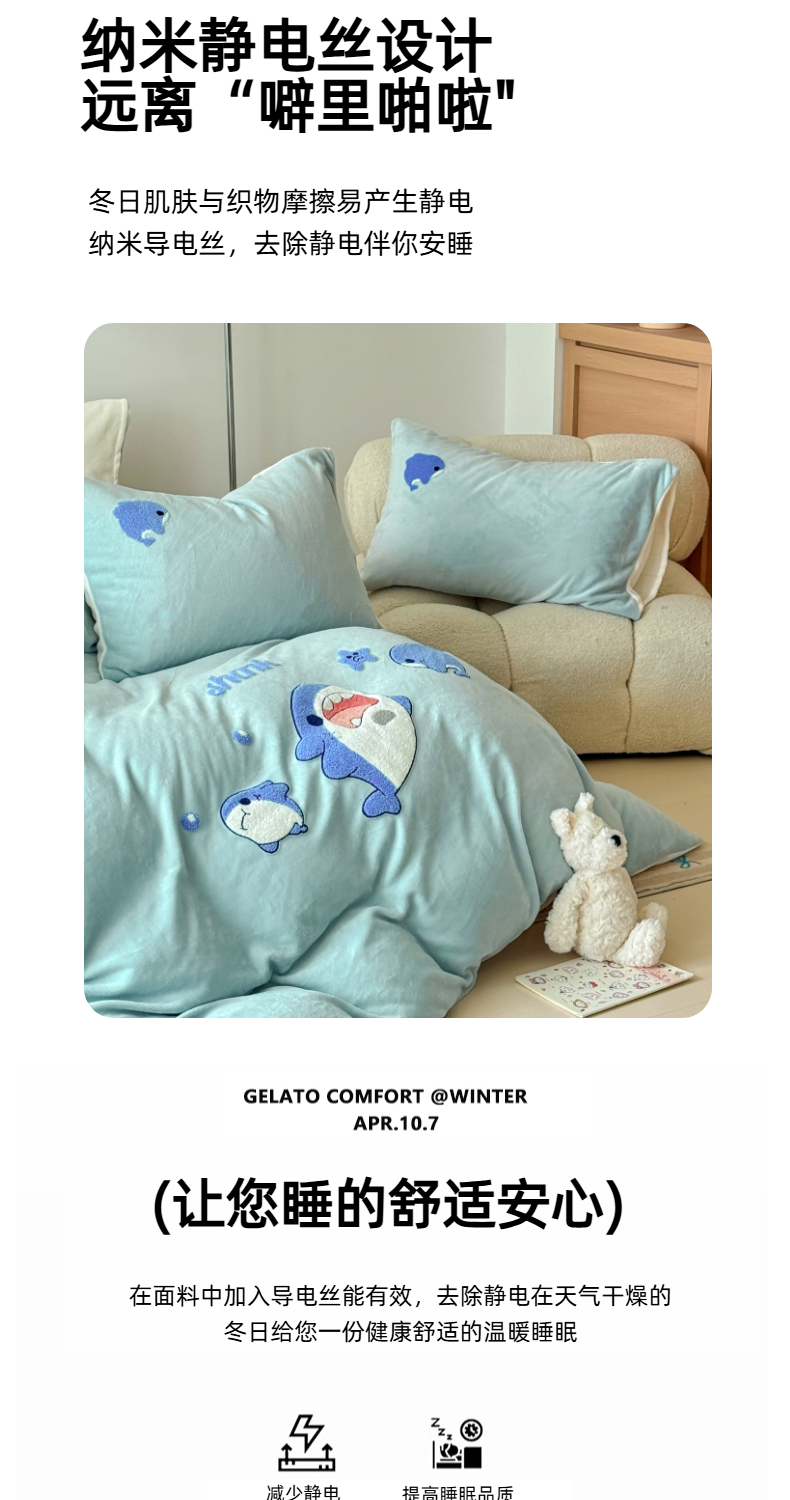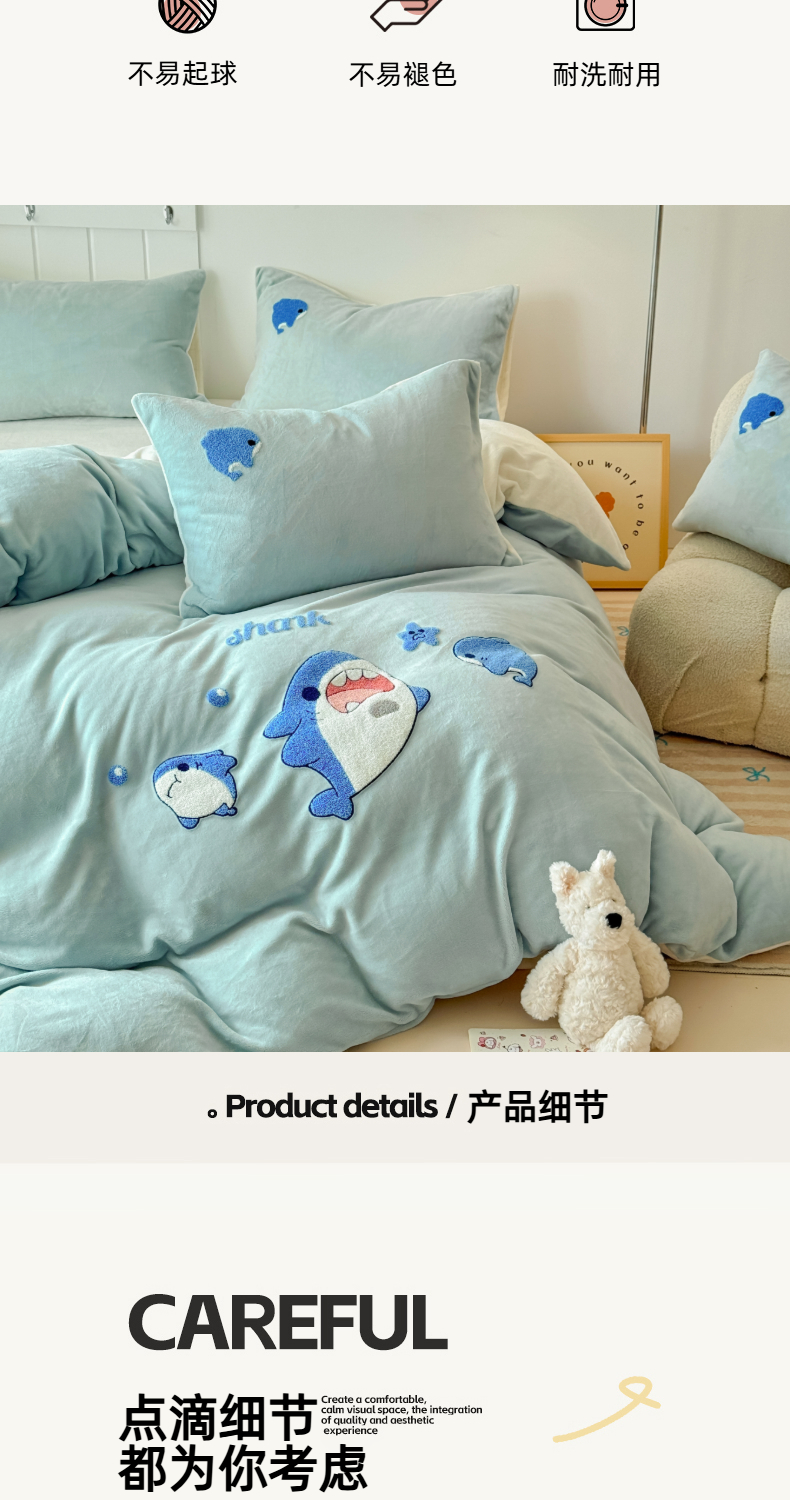 商品名称:莱凯家纺 2025新款毛巾绣牛奶绒四件套 鲨鱼宝宝