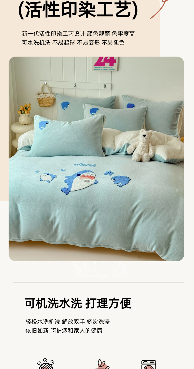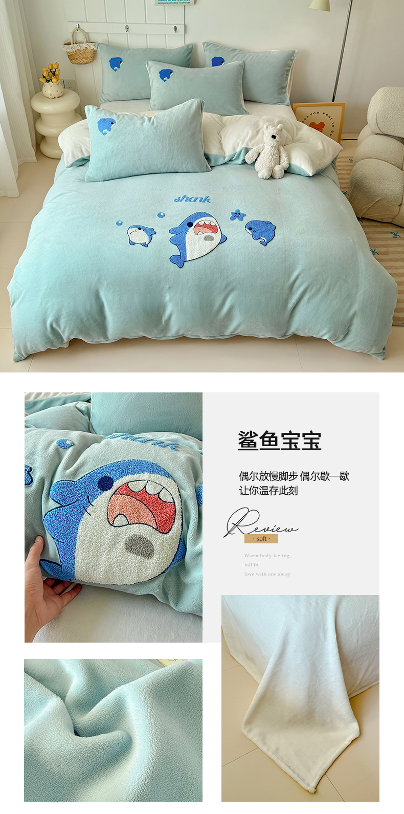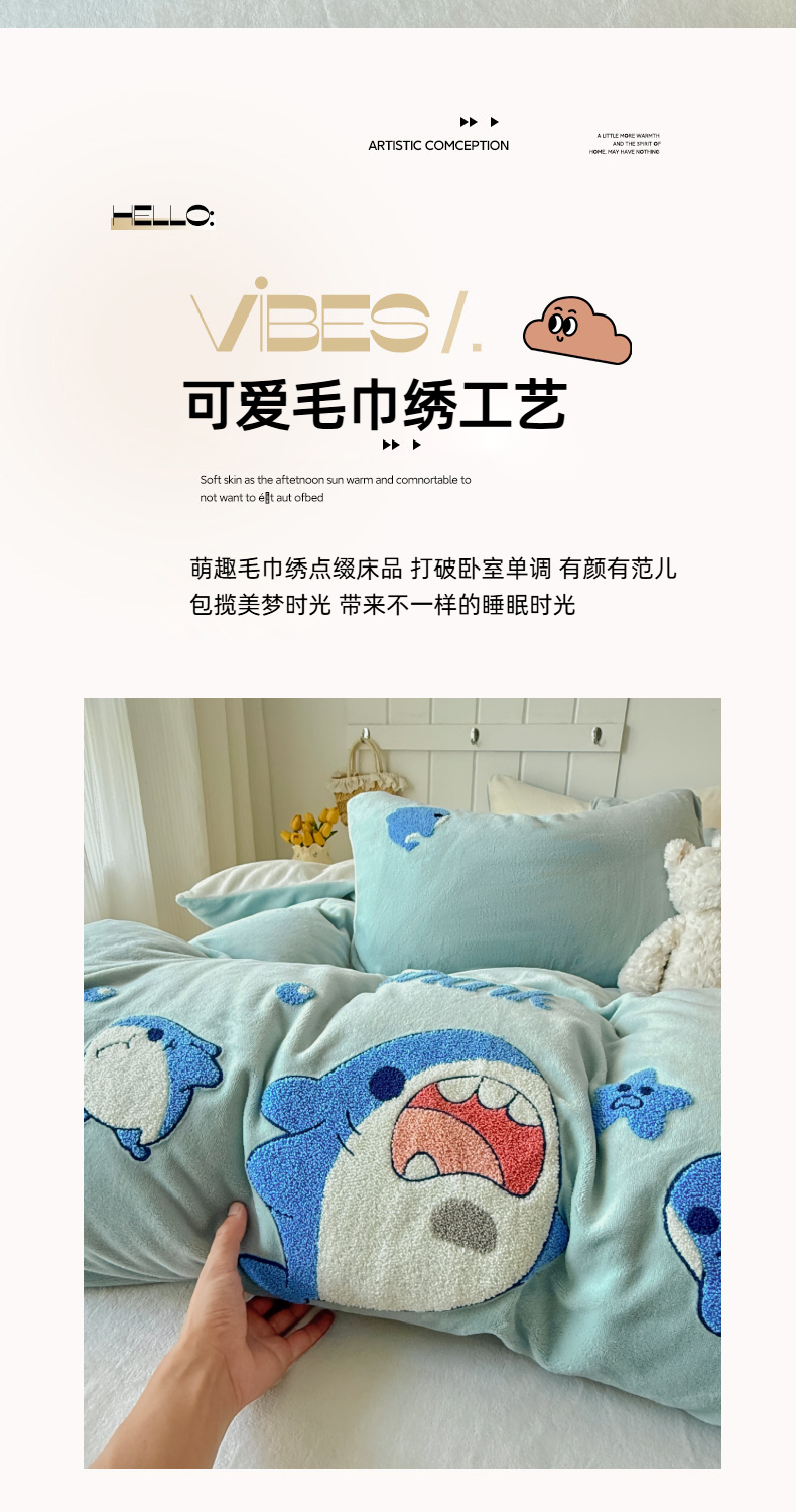 莱凯家纺 2025新款毛巾绣牛奶绒四件套 鲨鱼宝宝
