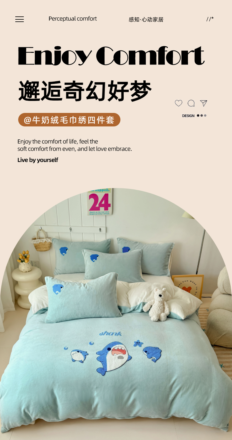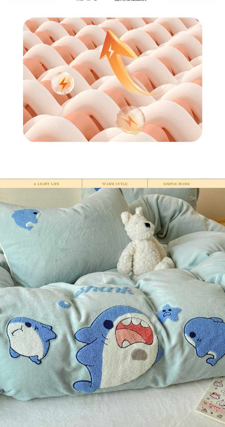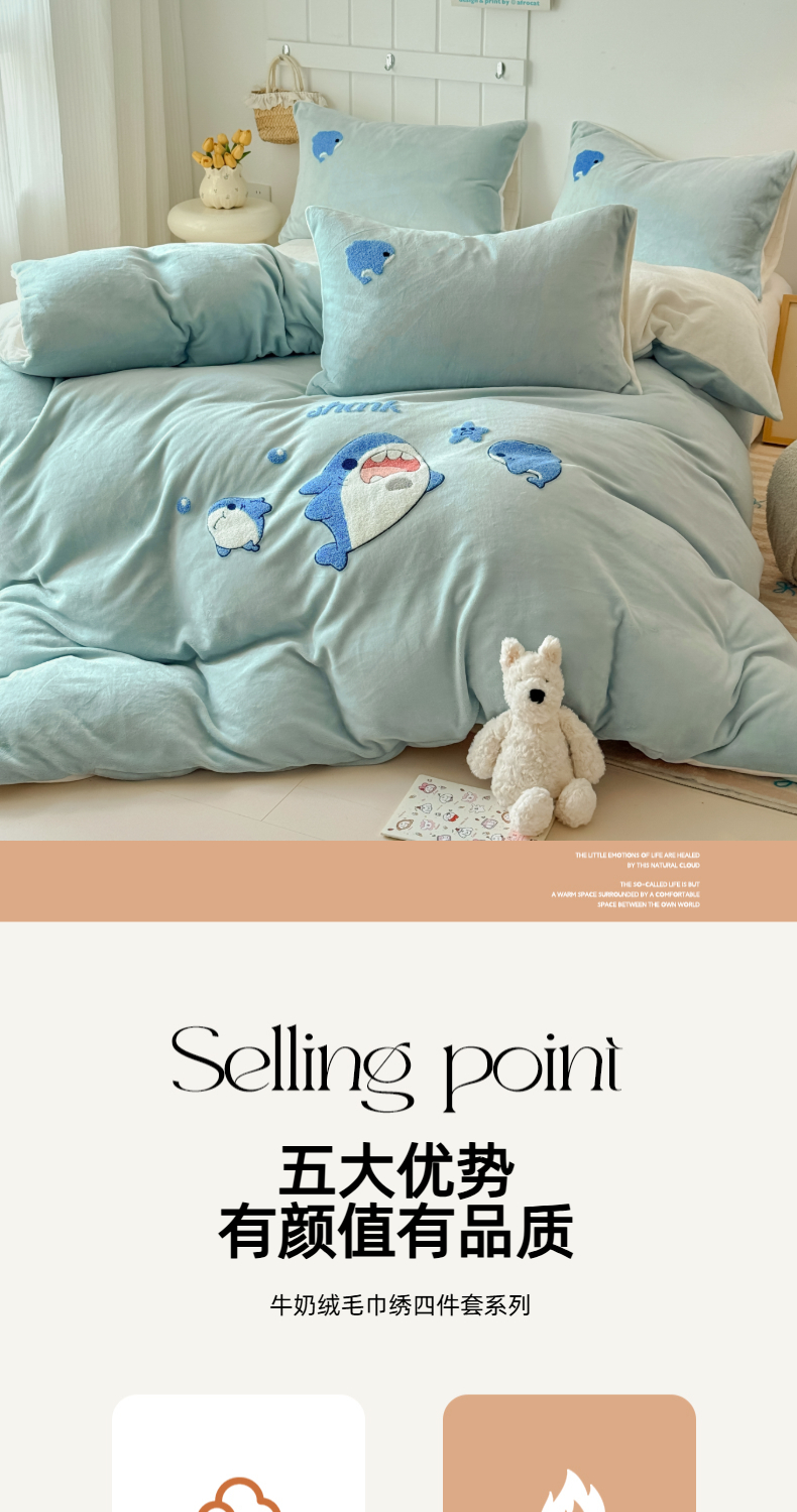 莱凯家纺 2025新款毛巾绣牛奶绒四件套 鲨鱼宝宝