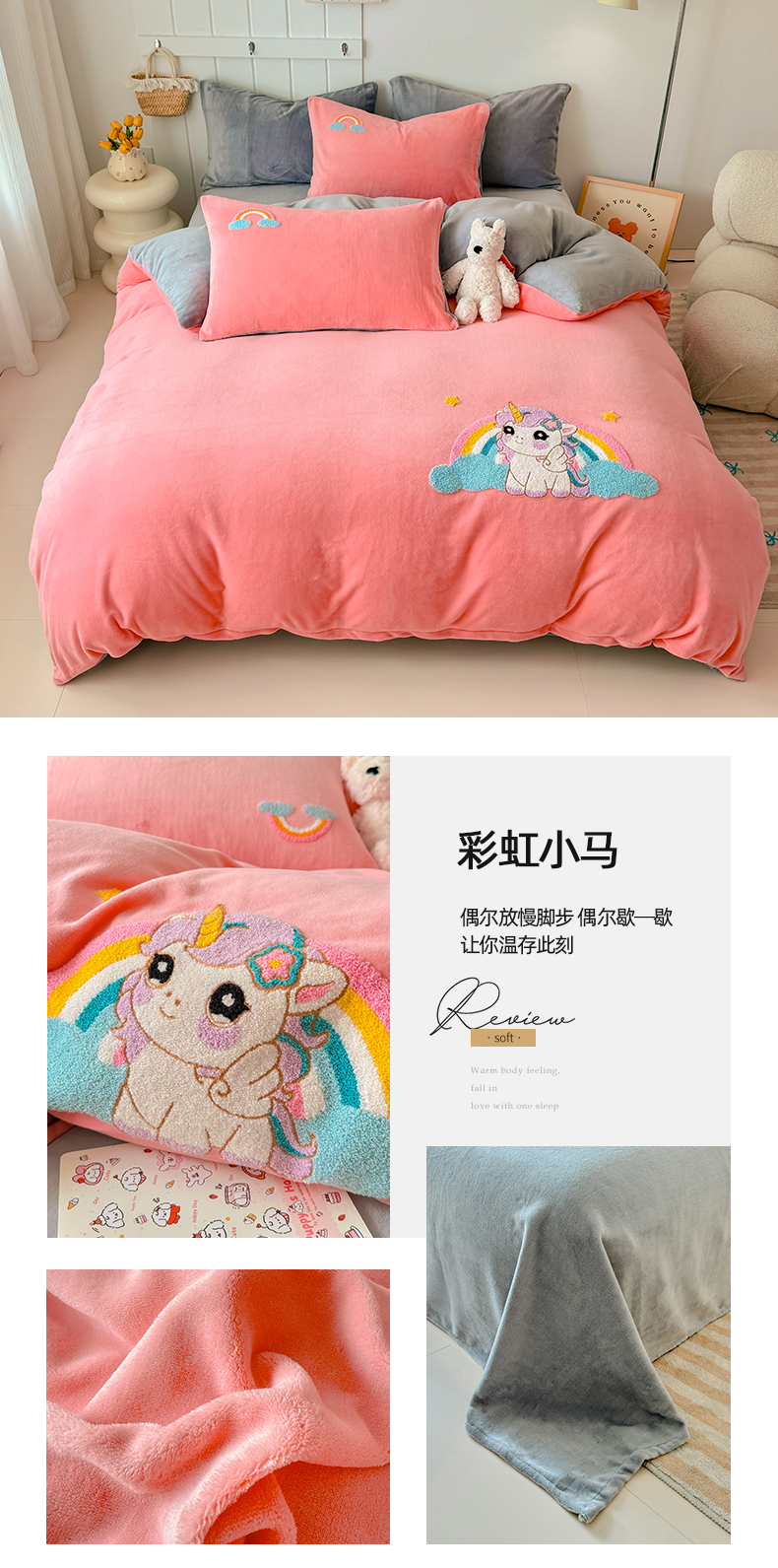 (总)莱凯家纺 2025新款毛巾绣牛奶绒四件套,遨游太空,彩虹小马,腊肠萌犬,苹果猫,鲨鱼宝宝,熊猫派对,音乐考拉