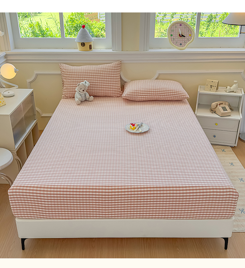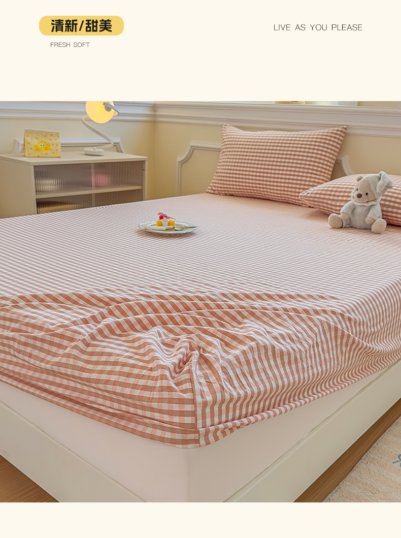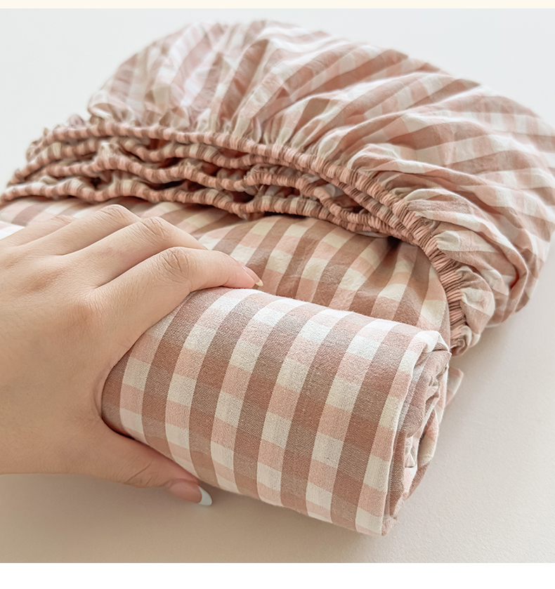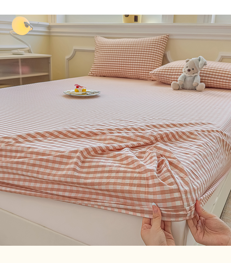 菡宝 2025新款全棉纯棉色织水洗棉单单床笠 粉小格