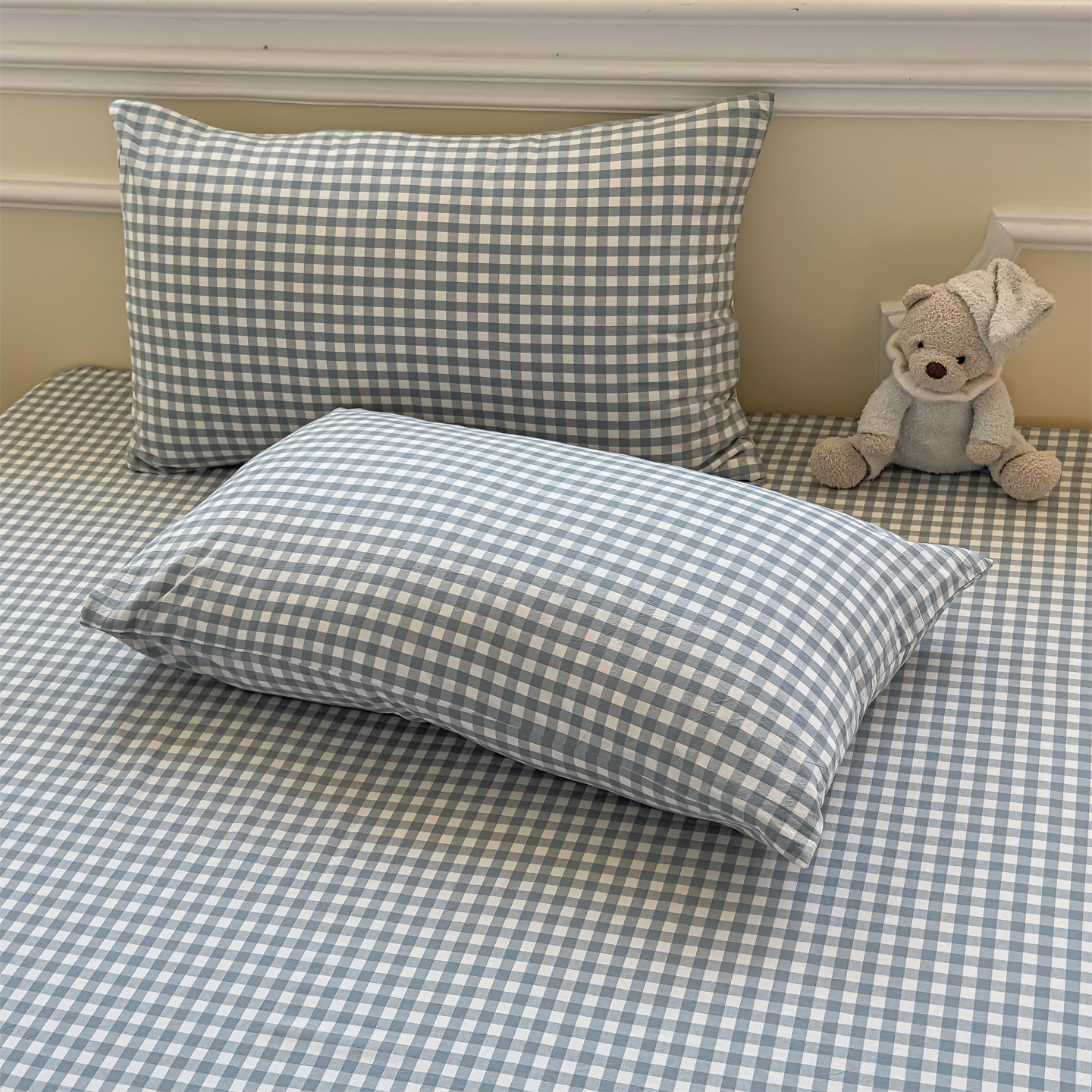 (总)菡宝 2025新款全棉纯棉色织小提花四件套支持定制定做尺寸,暴力熊卡其,暴力熊绿,大方块灰,大方块紫,千鸟格白,千鸟格灰,千鸟格绿,四叶草卡其