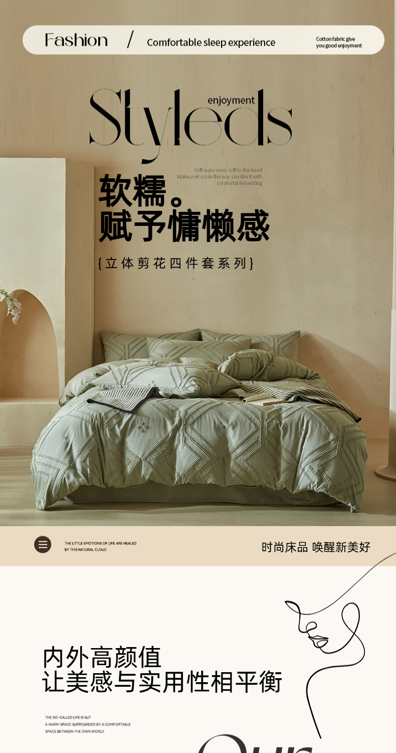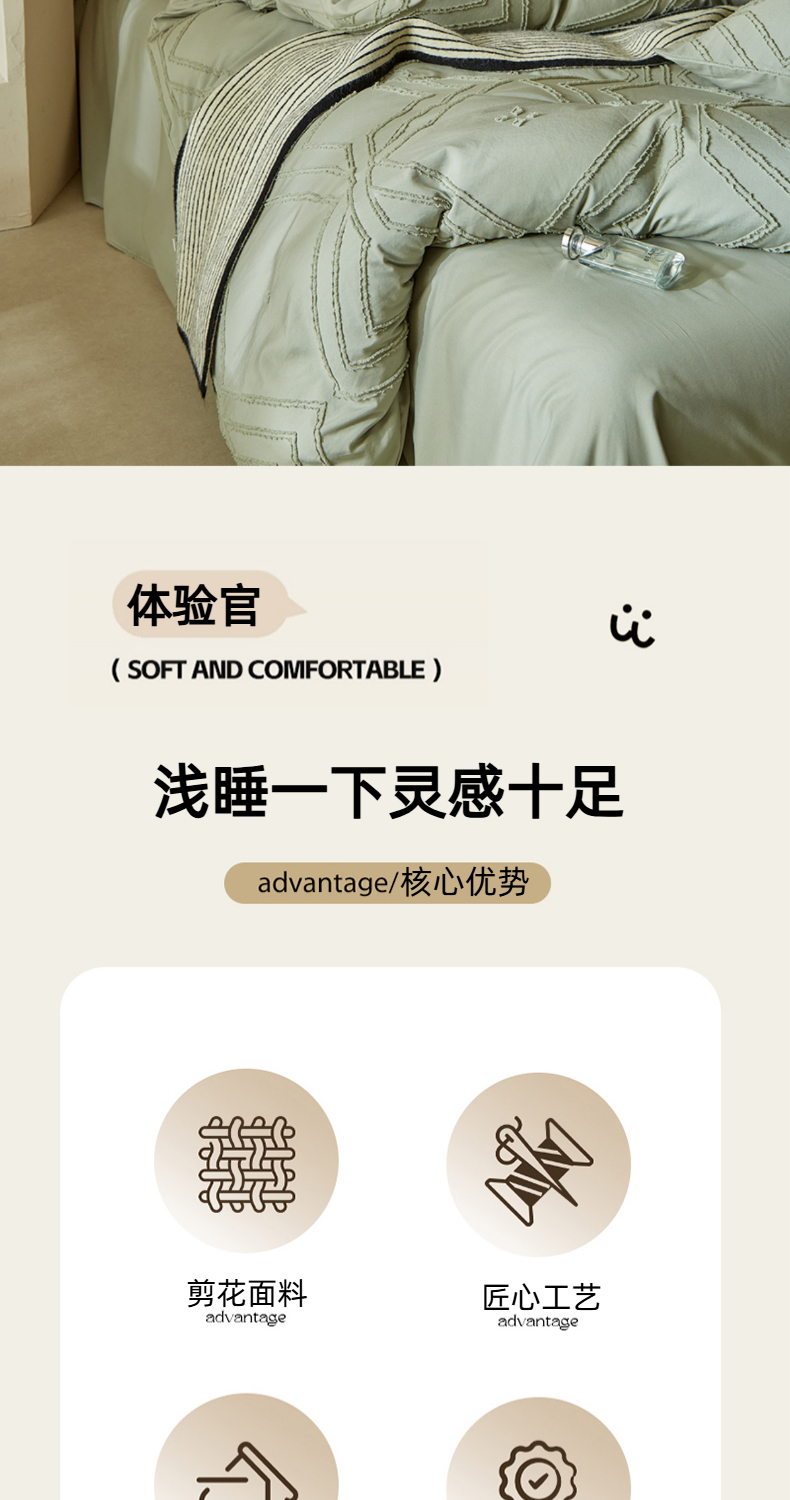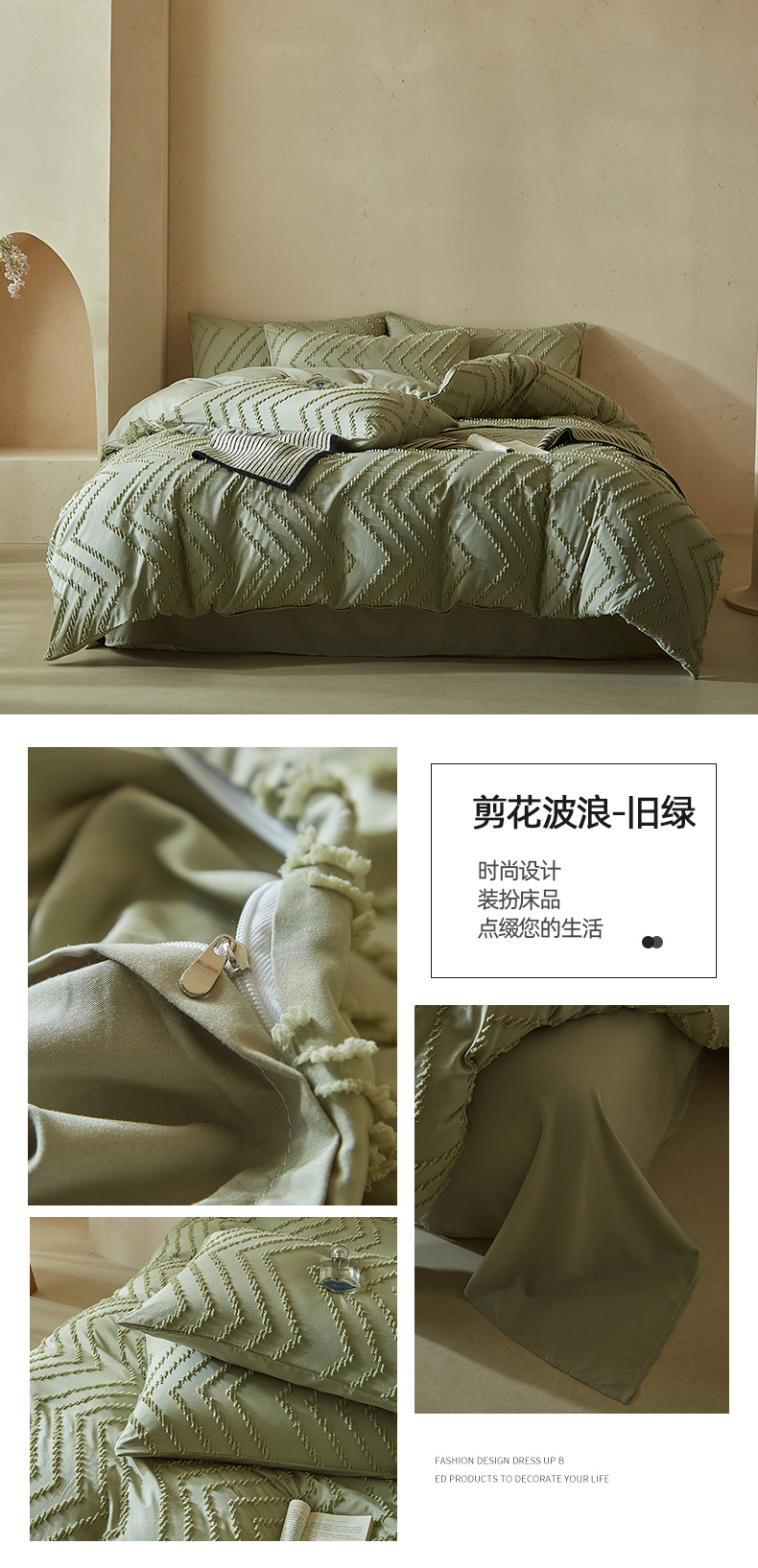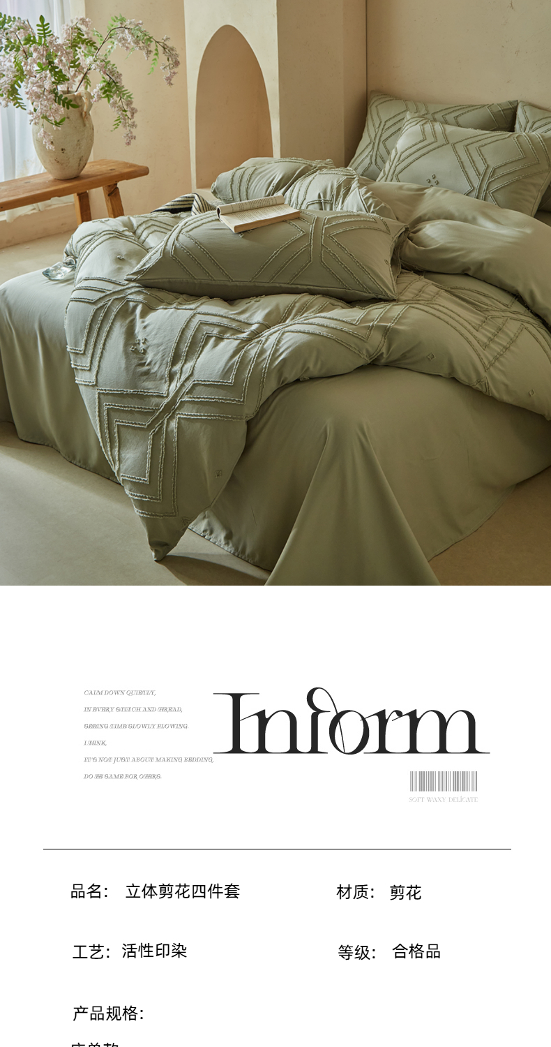 当前位置: 91家纺网 > 商品网购 > 床品套件 > 四件套 > 其它四件套 > 缘生活 2025新款立体剪花A面剪花面料B面加厚磨毛布料四件套 剪花方格-旧绿
