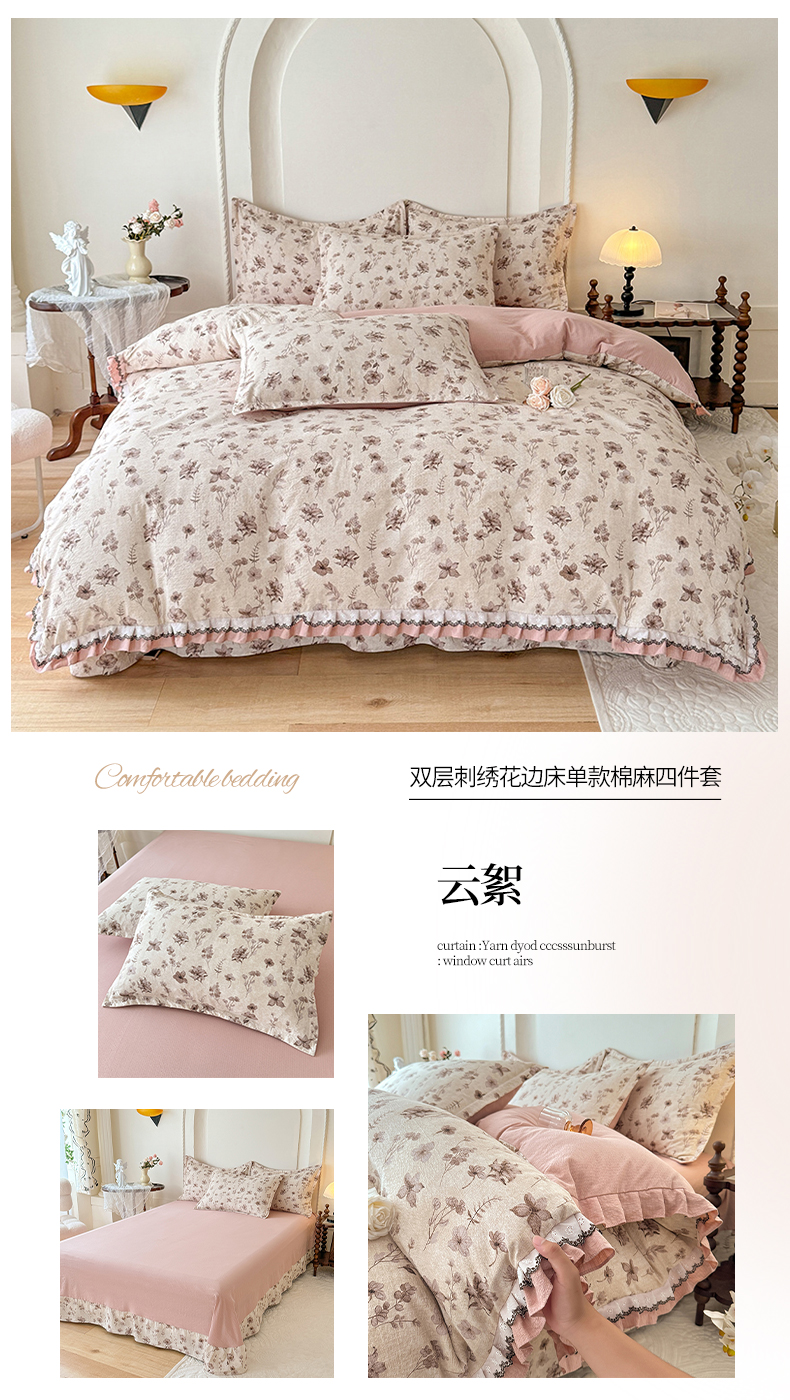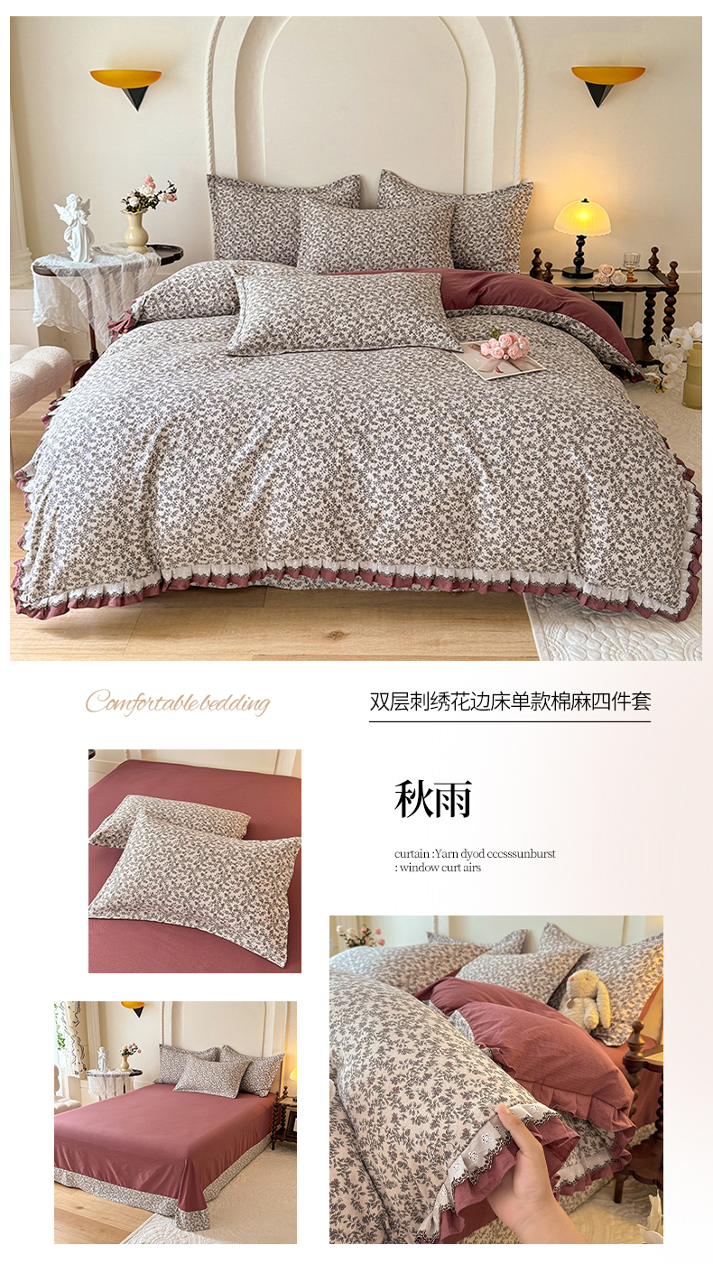 商品名称:韩约家纺 2025秋冬加厚1双层刺绣花边床单款棉麻四件套 秋雨