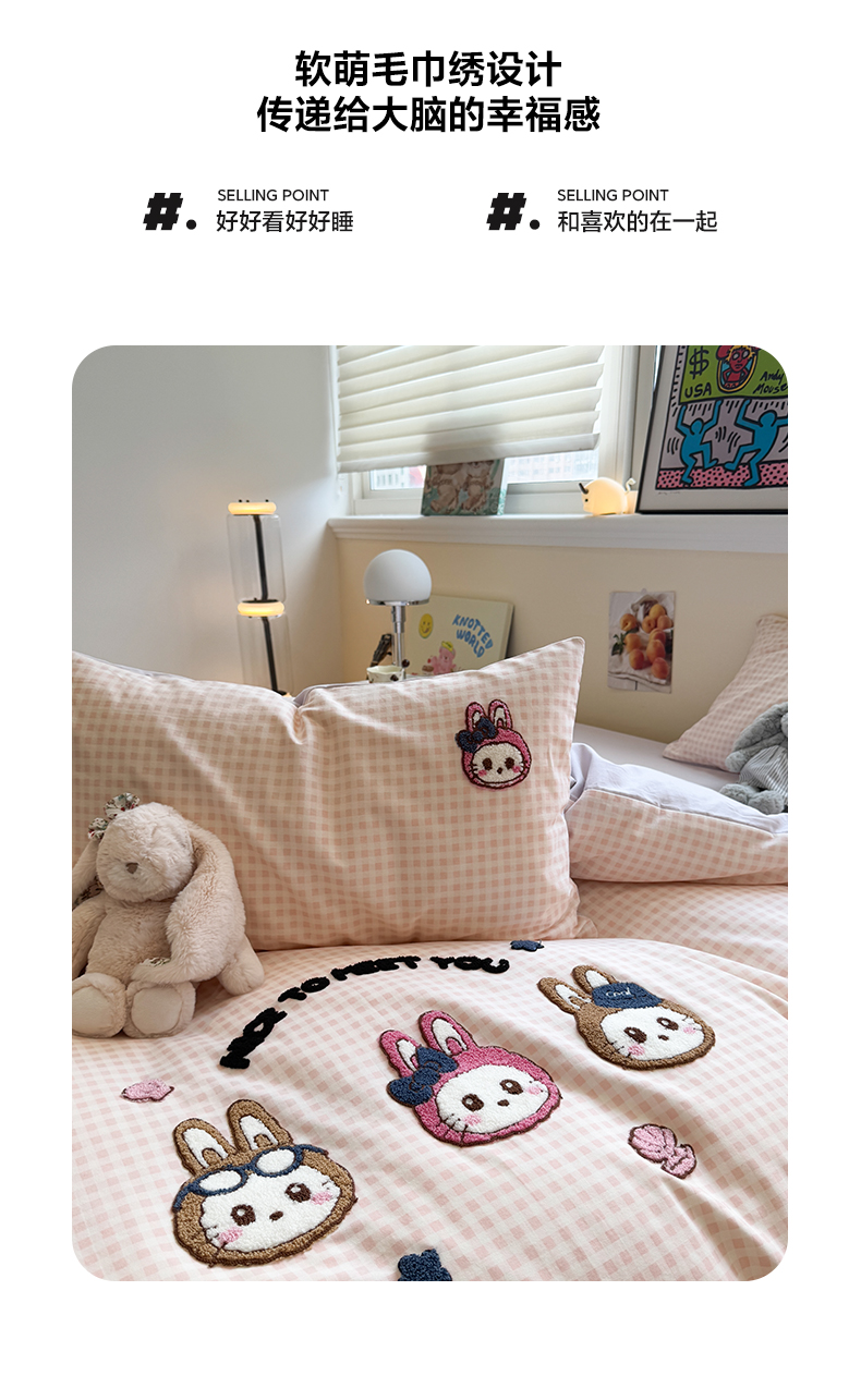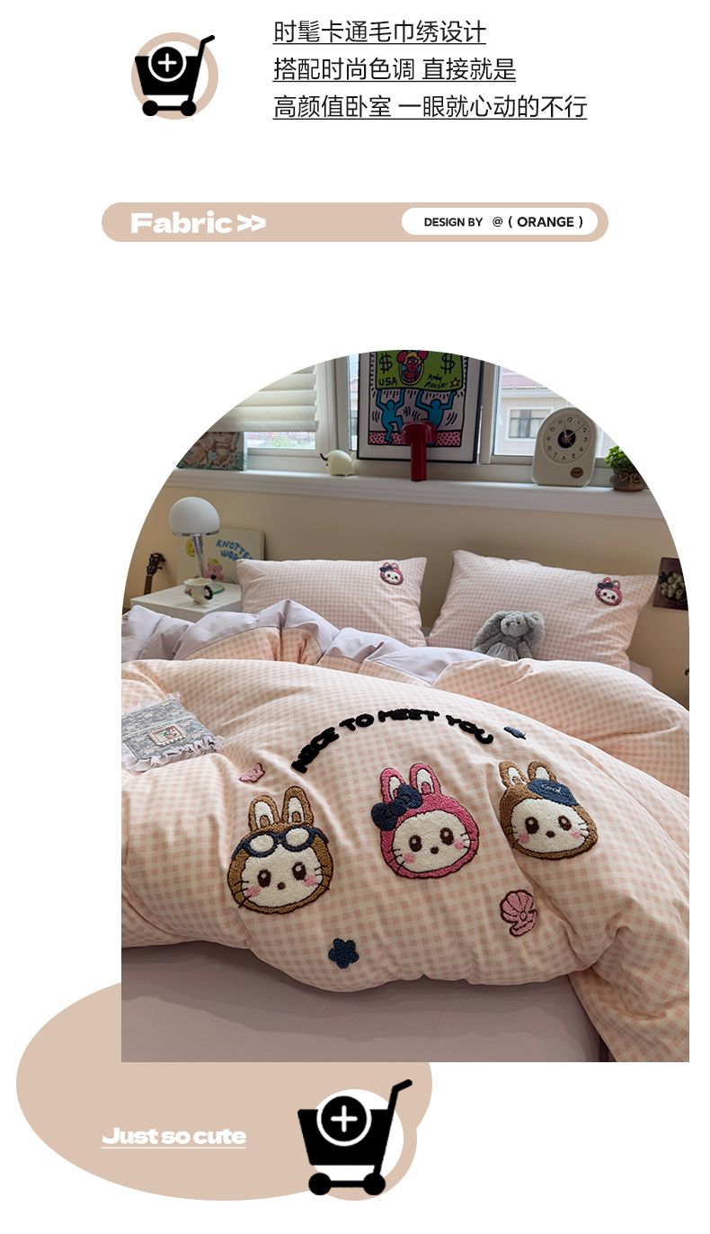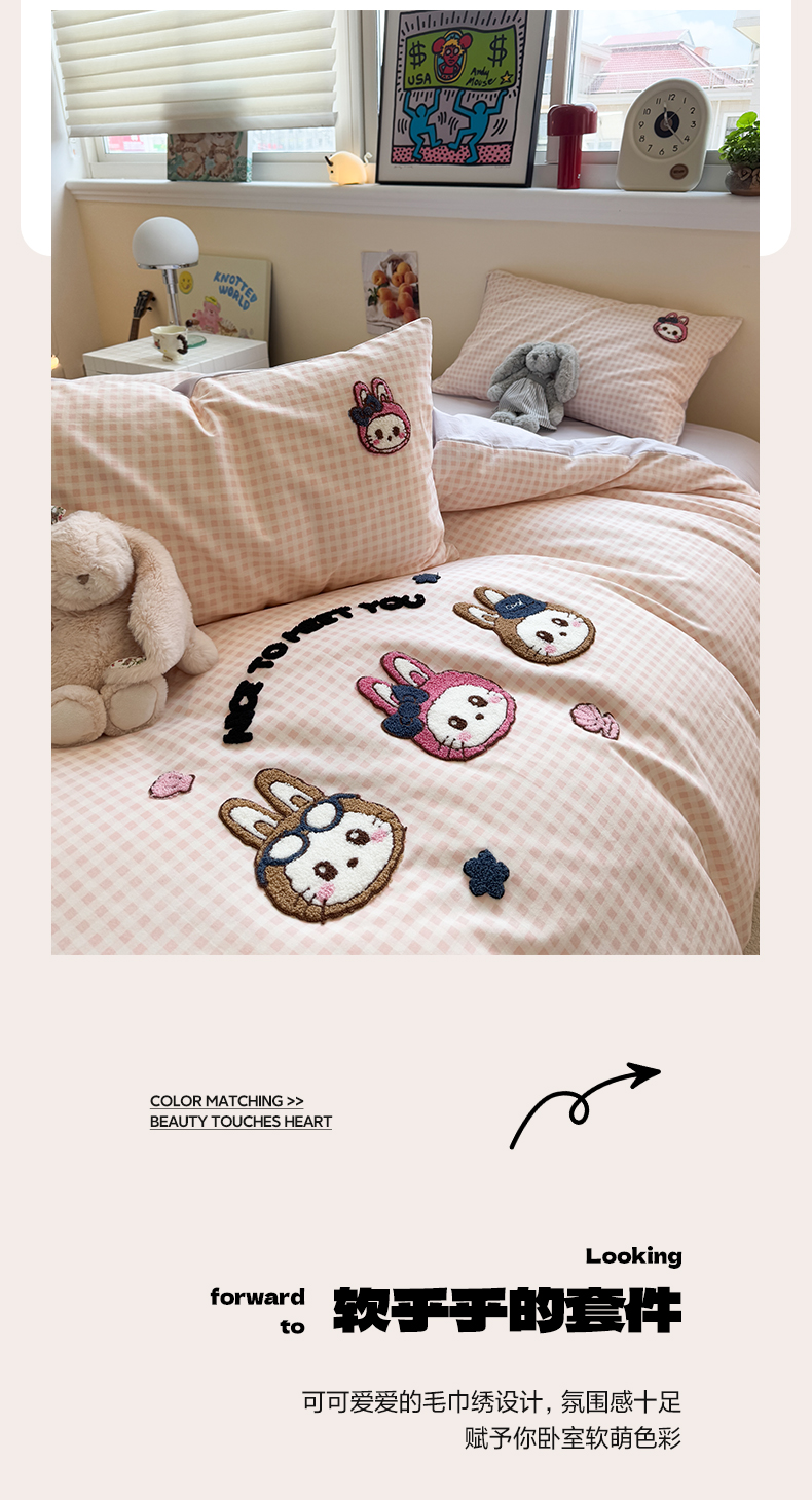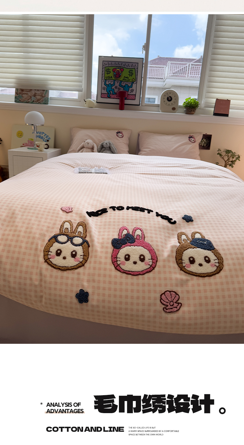 当前位置: 91家纺网 > 商品网购 > 床品套件 > 四件套 > 全棉普通四件套 > 雅居纺家纺 2025新款全棉纯棉磨毛毛巾绣四件套 奶萌兔兔