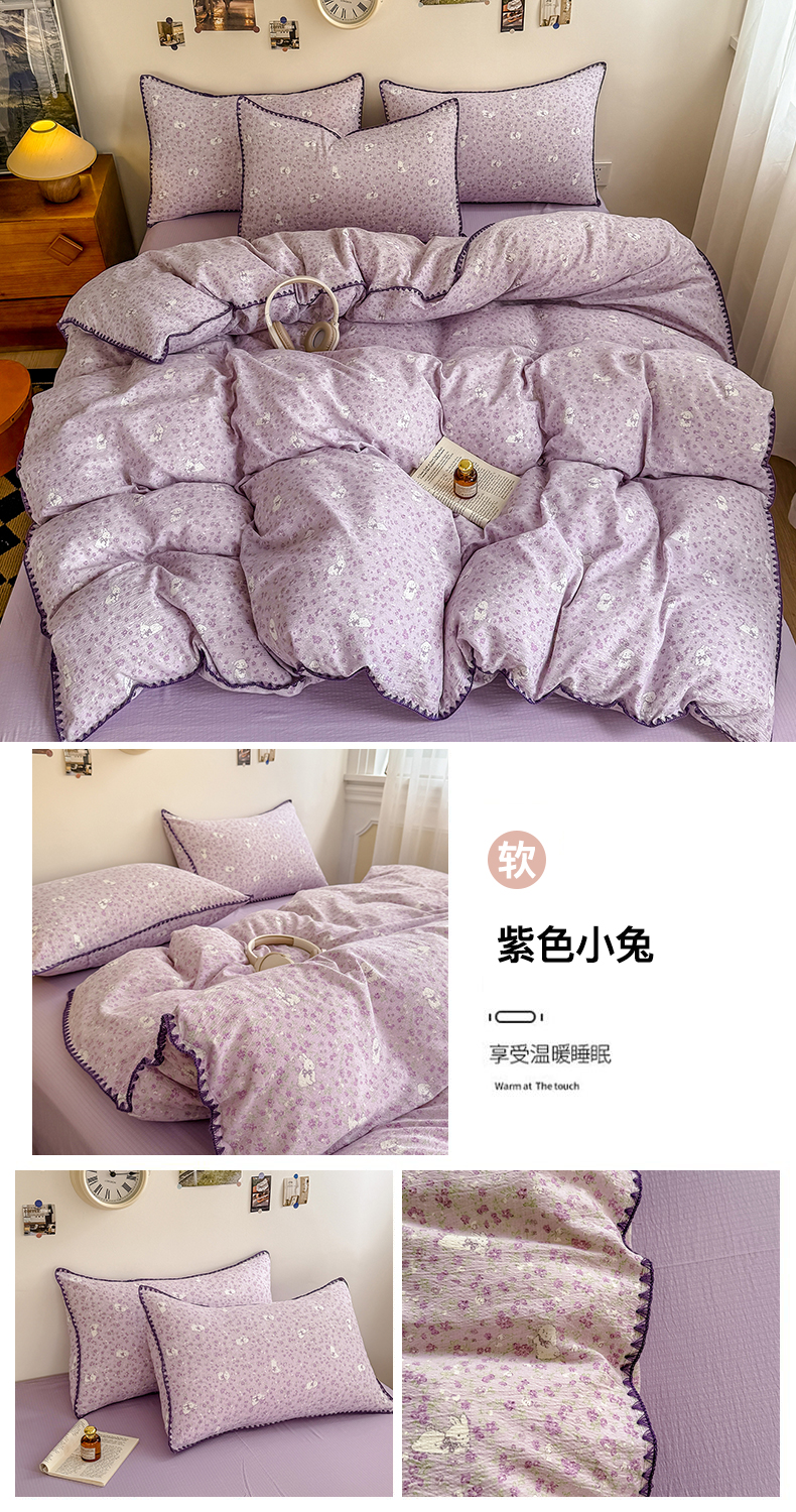 (总)晚爱家纺(原晚安家居) 2025新款云感双层纱贝壳边三角针工艺卡通小清新小碎花四件套,爱如星辰,波点黄,草莓甜心,粉色玫瑰,风铃,海象森林,花语蓝,兰亭序,蓝色蝴蝶结,玫瑰情书,奇妙小熊,倾心咖,小爱心,紫菊梗,紫色小兔