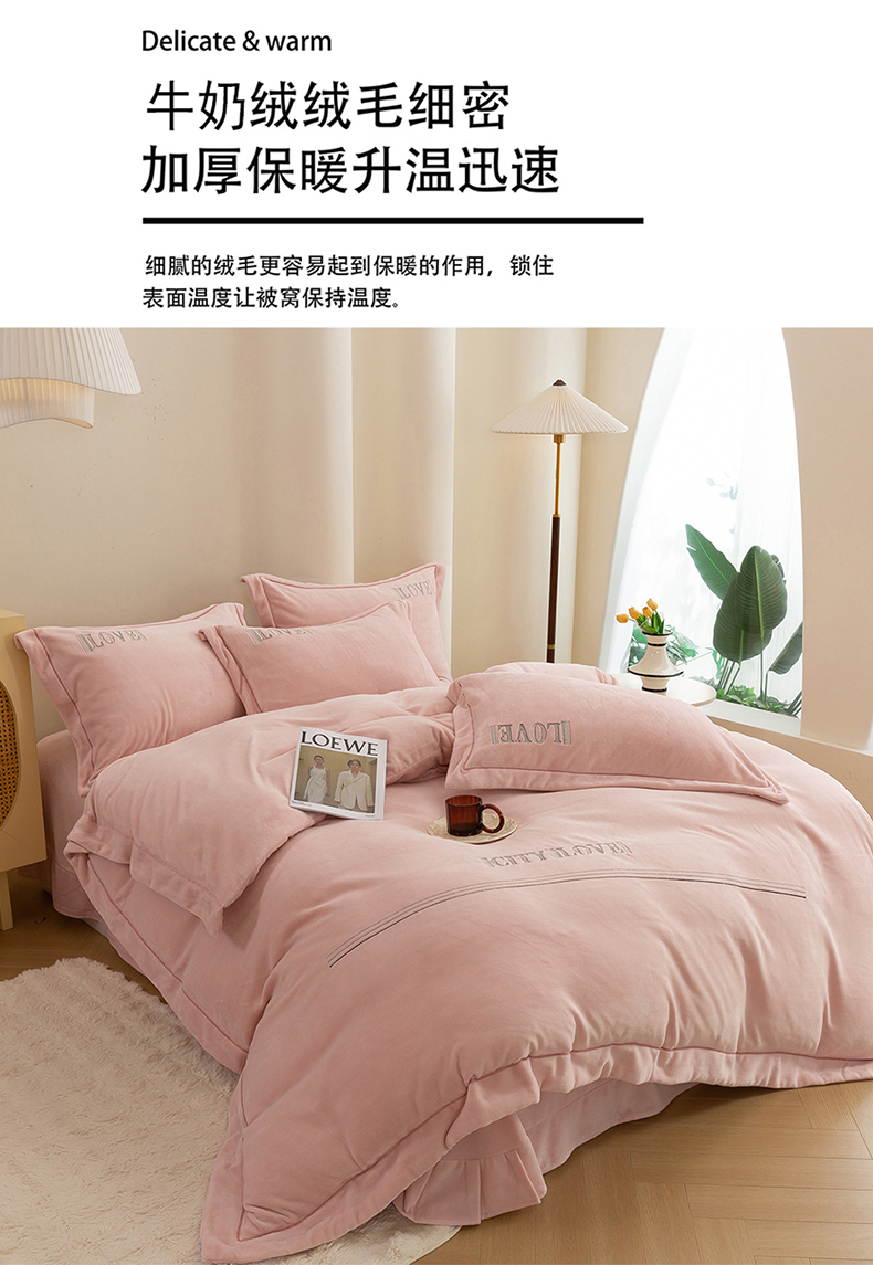 (总)绒博士 2025新款270克牛奶绒双拼角刺绣宽边款四件套--维也纳系列,维也纳-粉豆沙,维也纳-果绿,维也纳-浅咖,维也纳-浅蓝