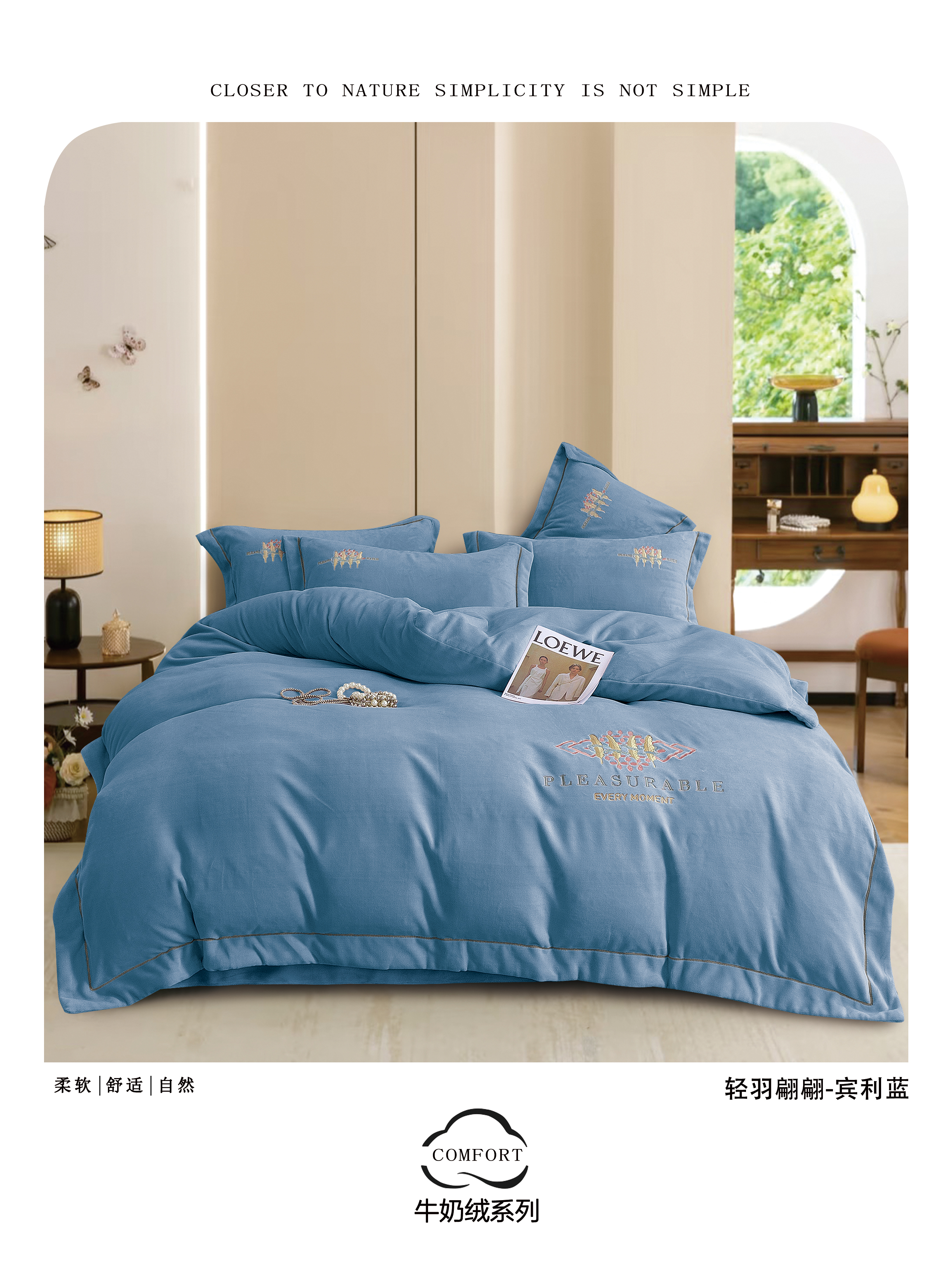 (总)绒博士 2025新款220克牛奶绒刺绣宽边款四件套--轻羽翩翩系列