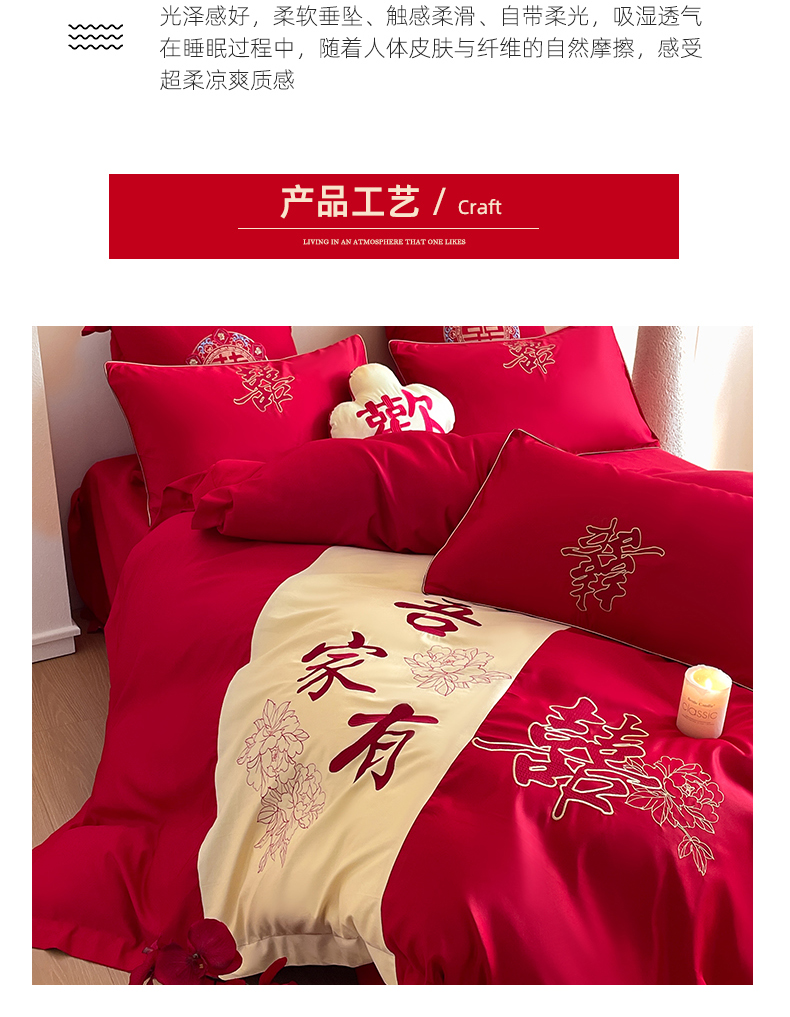 当前位置: 91家纺网 > 商品网购 > 床品套件 > 四件套 > 婚庆四件套 > 玉雅家纺 2025新款丝缎亮面刺绣婚庆四件套 喜至