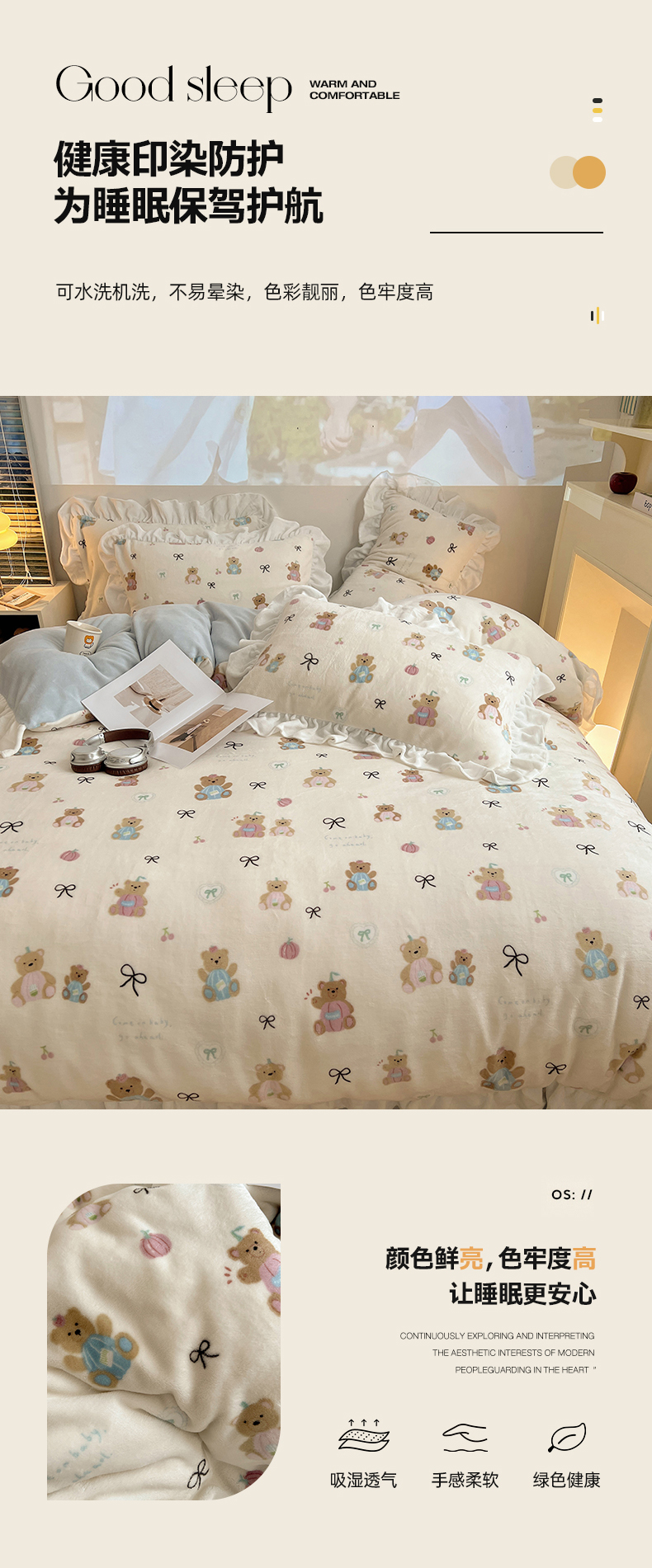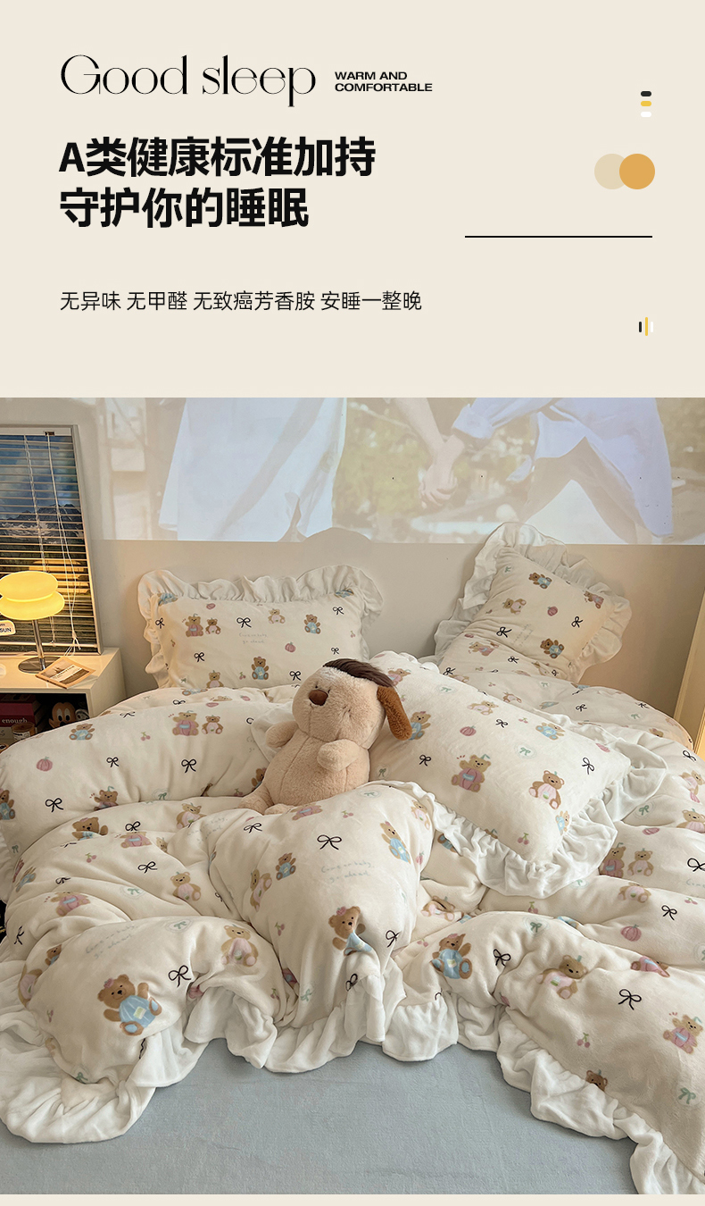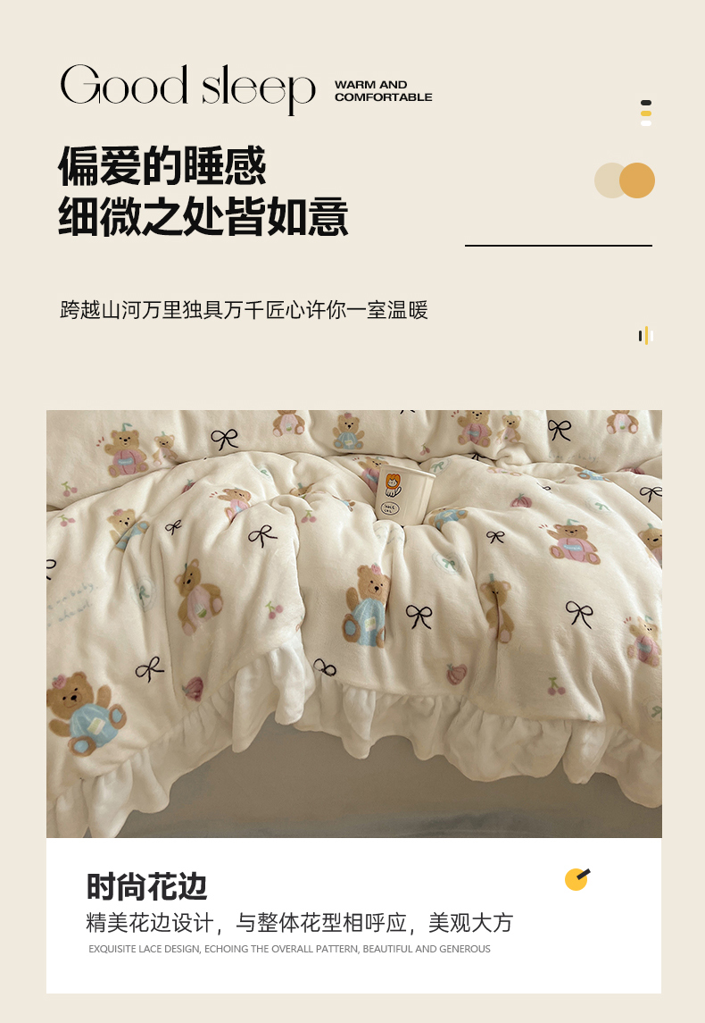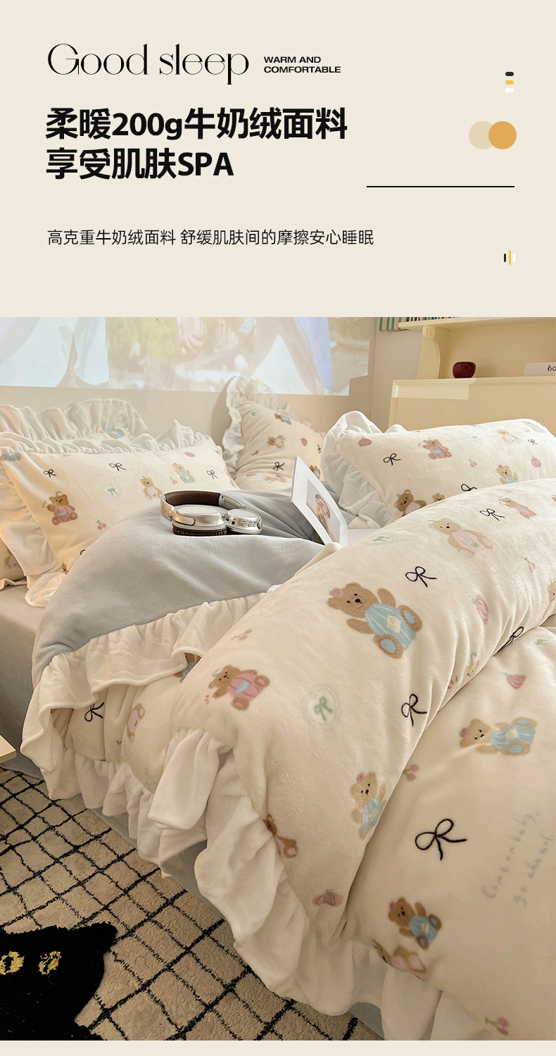 当前位置: 91家纺网 > 商品网购 > 床品套件 > 四件套 > 牛奶绒四件套 > 六巷胡同 2025新款韩版INS卡通花边款A类牛奶绒四件套 花边南瓜抱抱熊