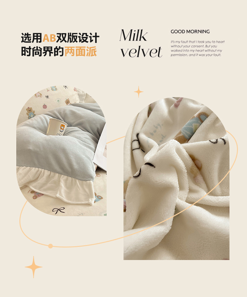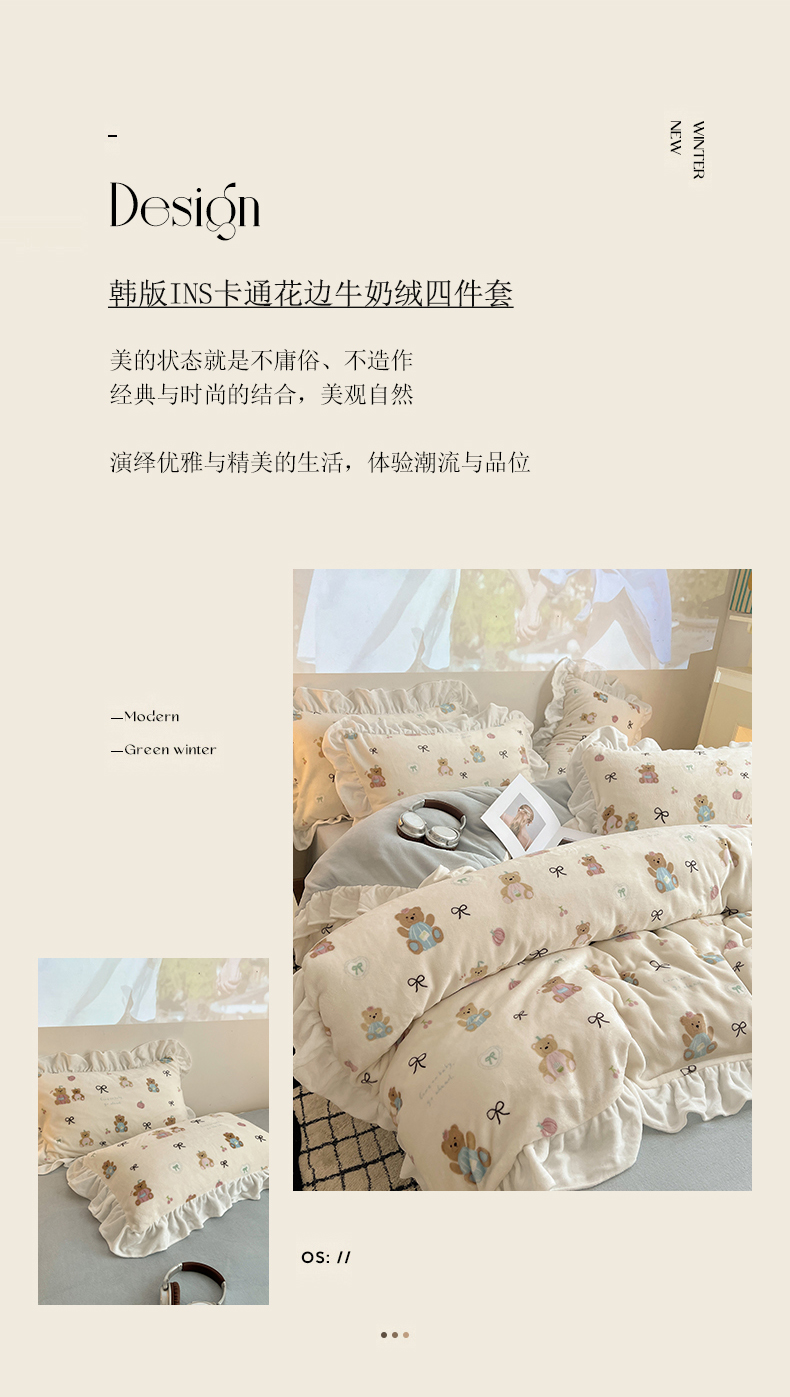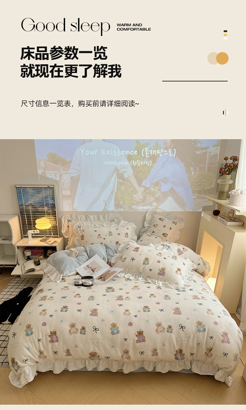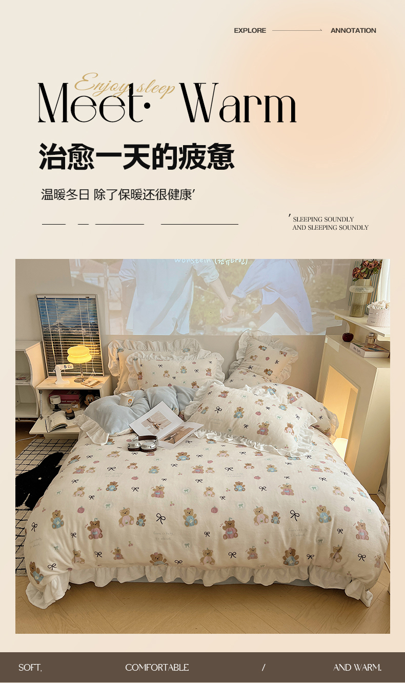 当前位置: 91家纺网 > 商品网购 > 床品套件 > 四件套 > 牛奶绒四件套 > 六巷胡同 2025新款韩版INS卡通花边款A类牛奶绒四件套 花边南瓜抱抱熊