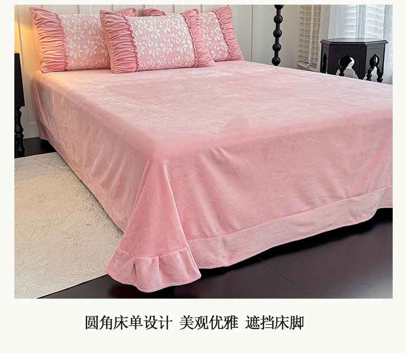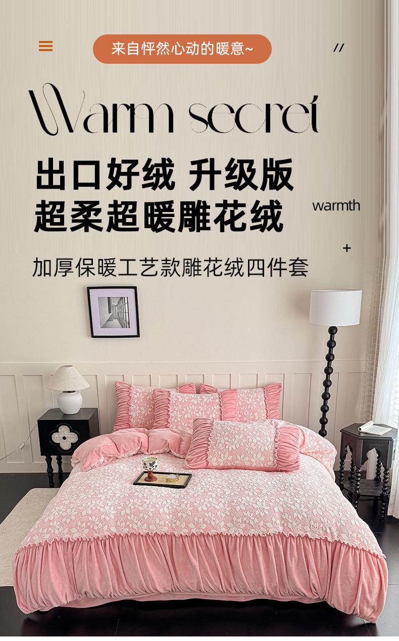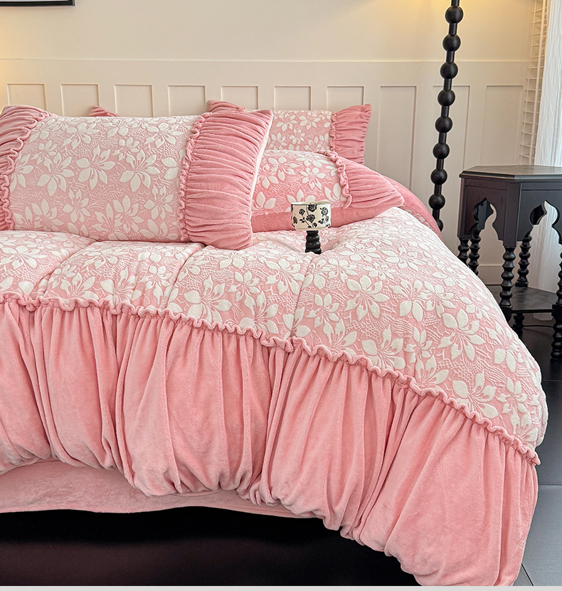 商品名称:【苏东来】2025高端加厚保暖纯色甜美公主赫本风法式工艺款雕花牛奶绒四件套清新少女婴儿法莱兔绒四件套
