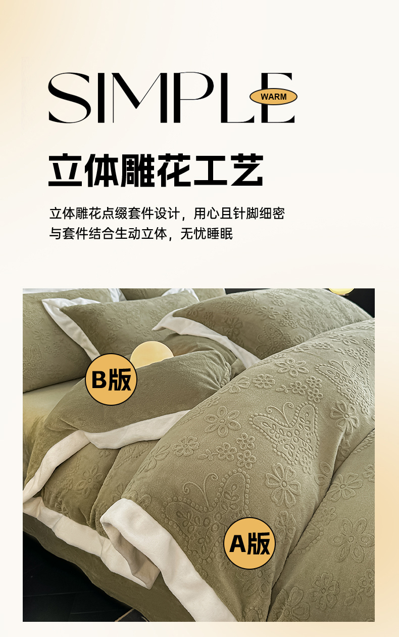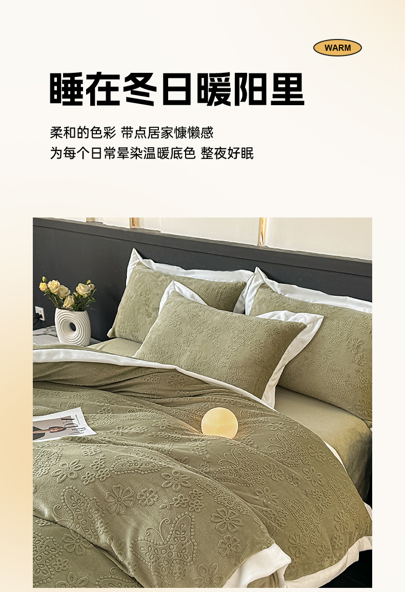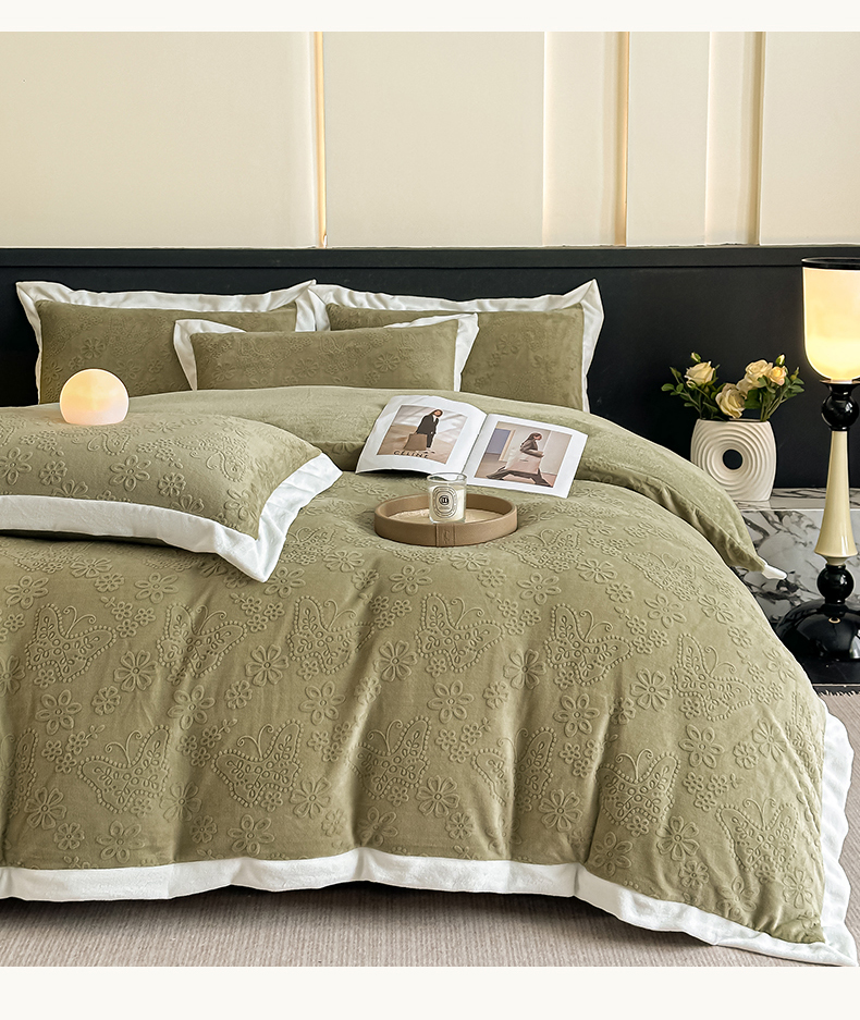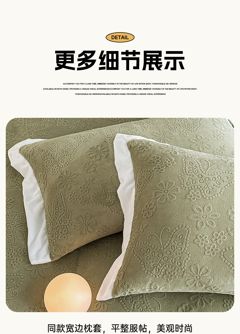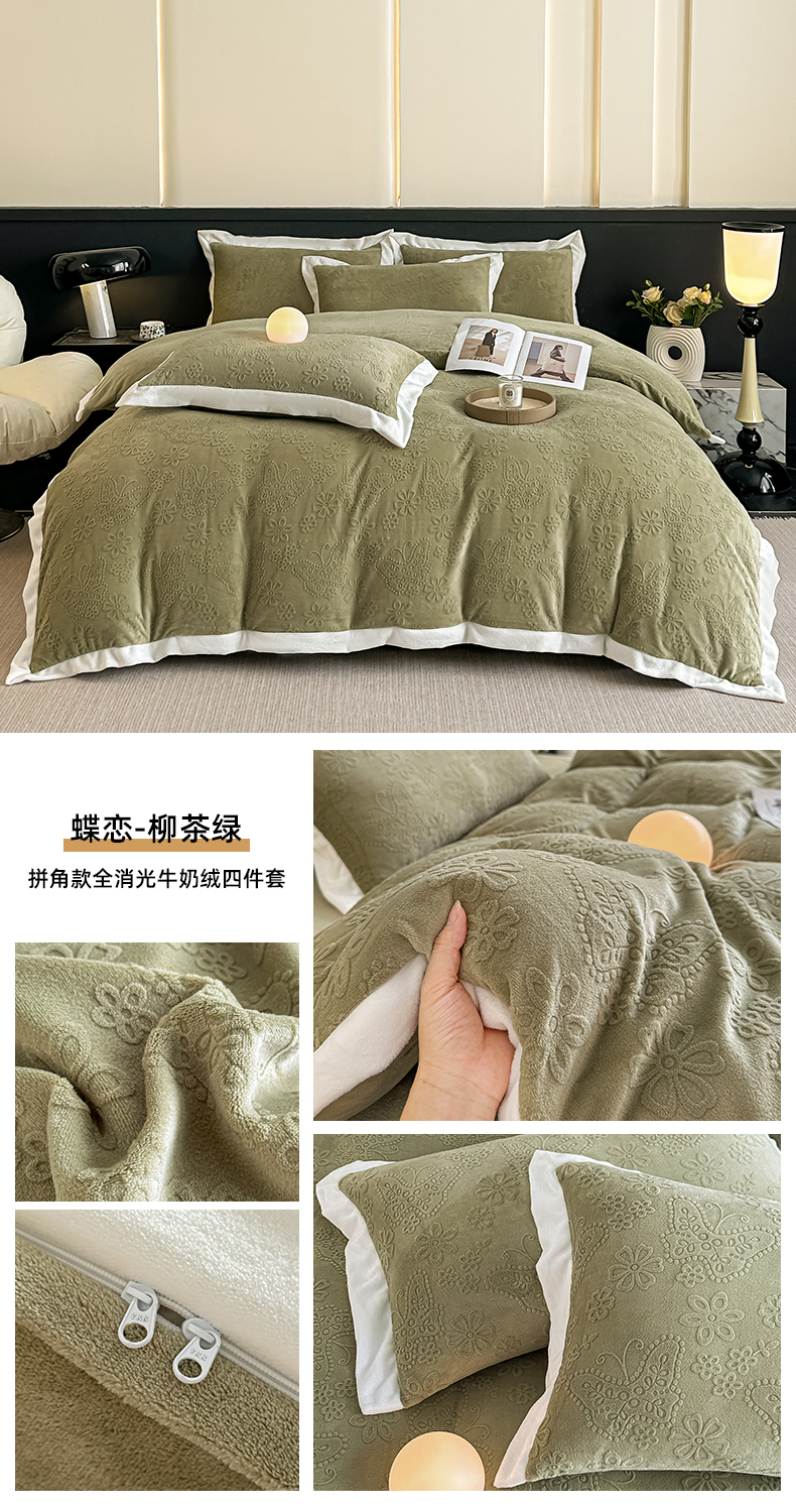 当前位置: 91家纺网 > 商品网购 > 床品套件 > 四件套 > 牛奶绒四件套 > 亿梵家居 2025秋冬新款-拼角款A类全消光牛奶绒立体5D雕花绒四件套 蝶恋-柳茶绿