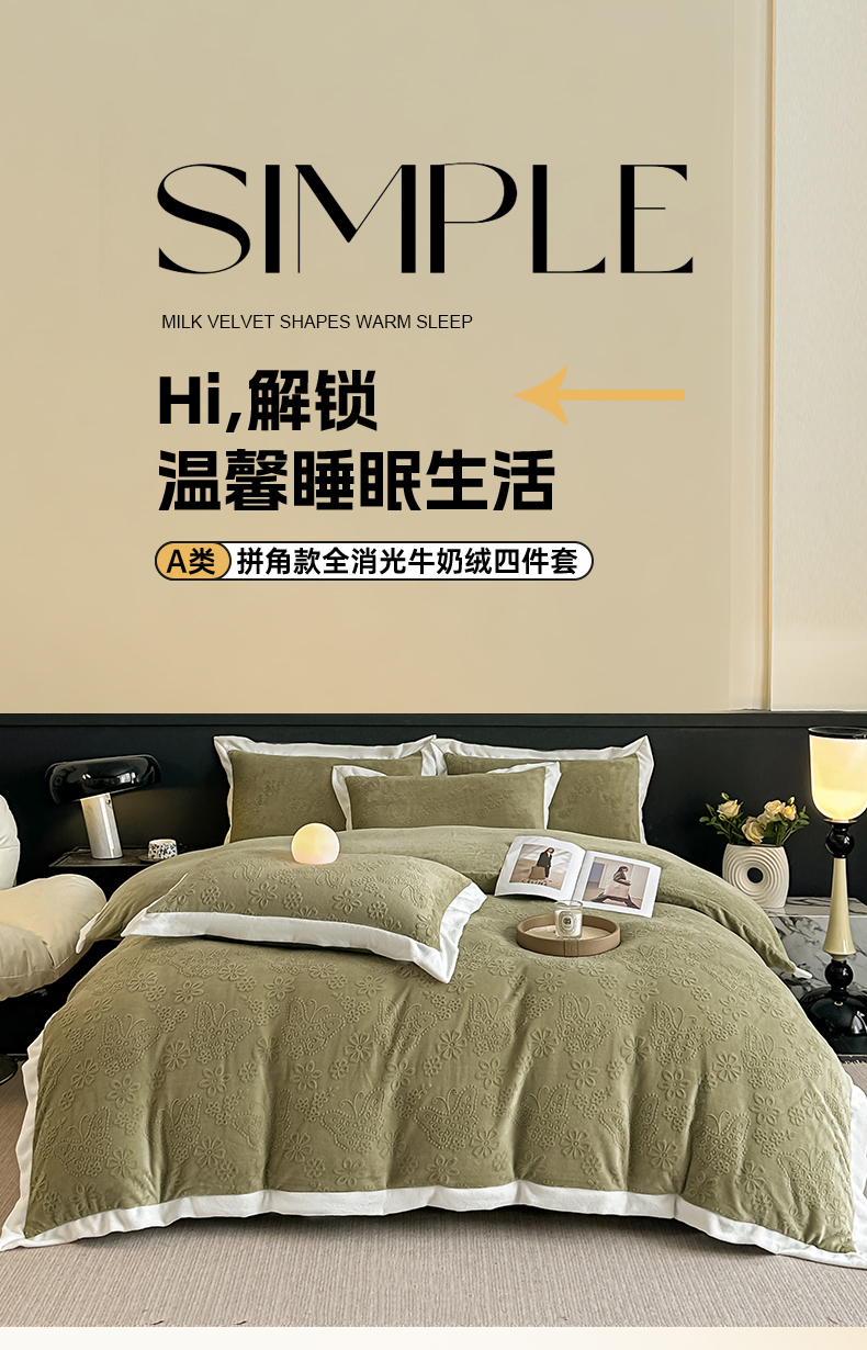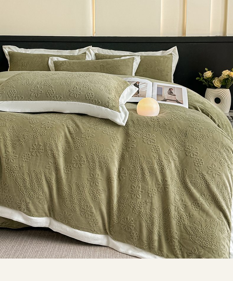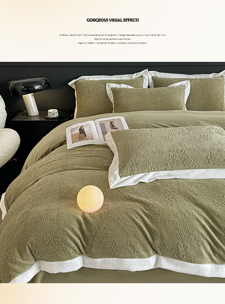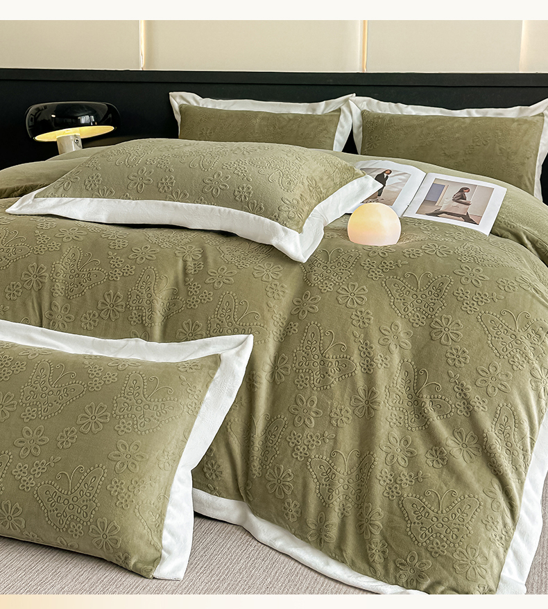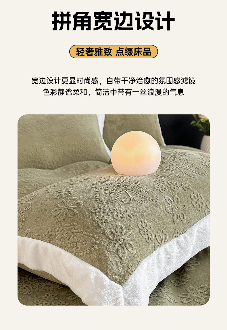 当前位置: 91家纺网 > 商品网购 > 床品套件 > 四件套 > 牛奶绒四件套 > 亿梵家居 2025秋冬新款-拼角款A类全消光牛奶绒立体5D雕花绒四件套 蝶恋-柳茶绿