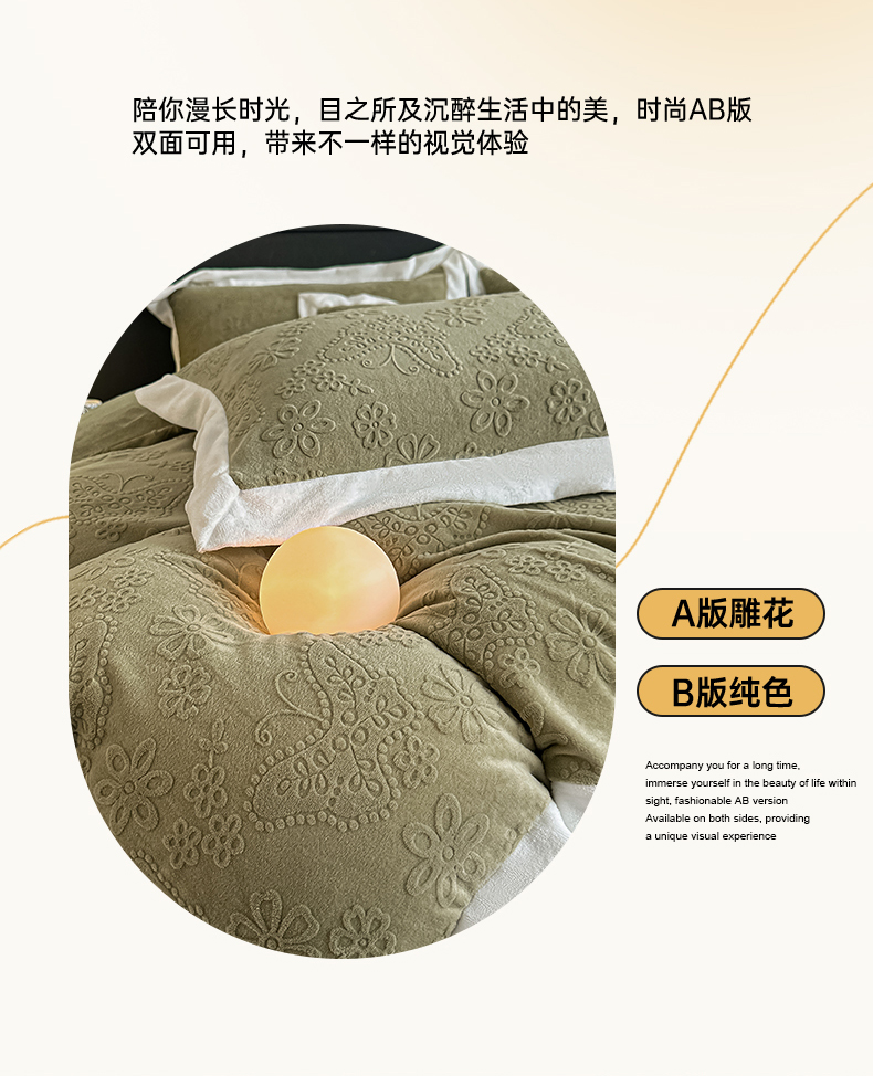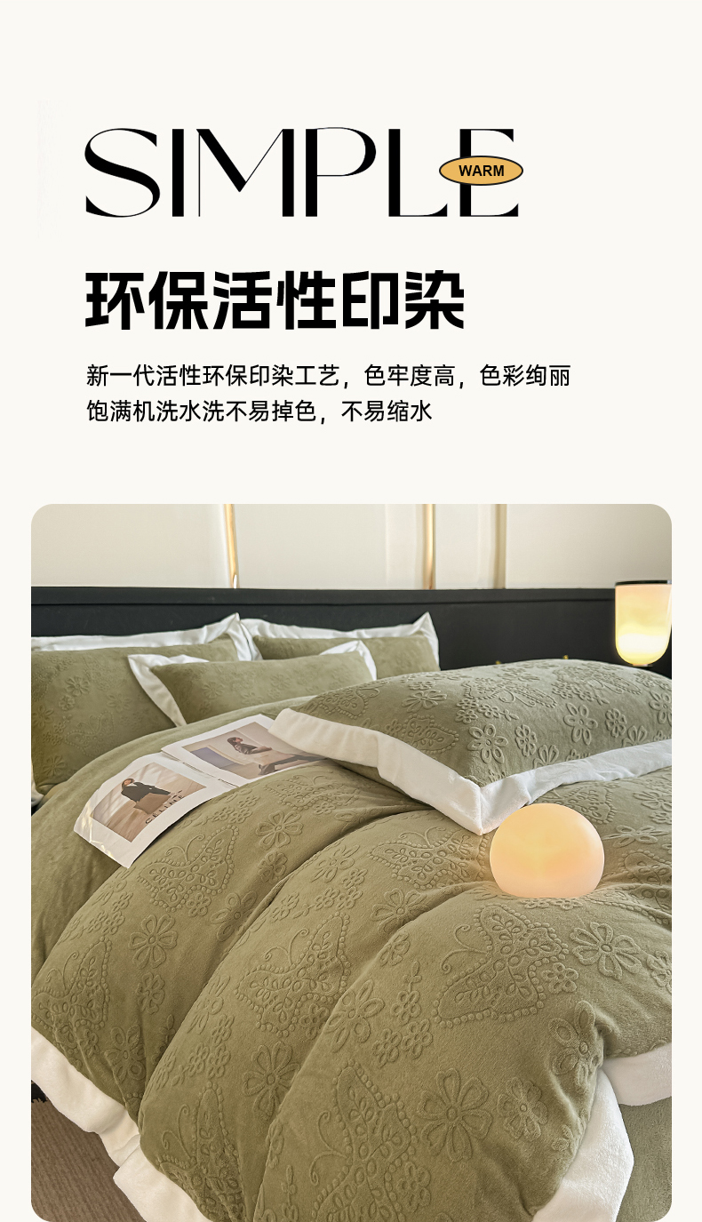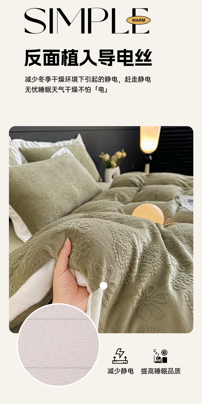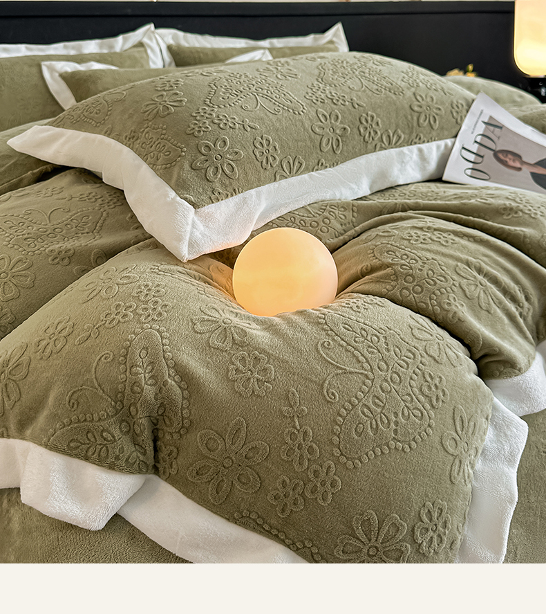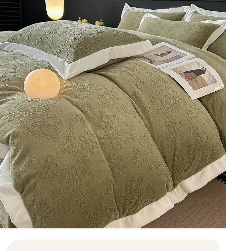当前位置: 91家纺网 > 商品网购 > 床品套件 > 四件套 > 牛奶绒四件套 > 亿梵家居 2025秋冬新款-拼角款A类全消光牛奶绒立体5D雕花绒四件套 蝶恋-柳茶绿