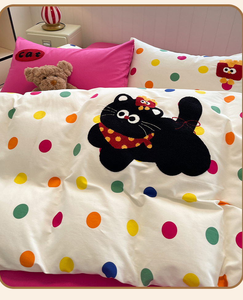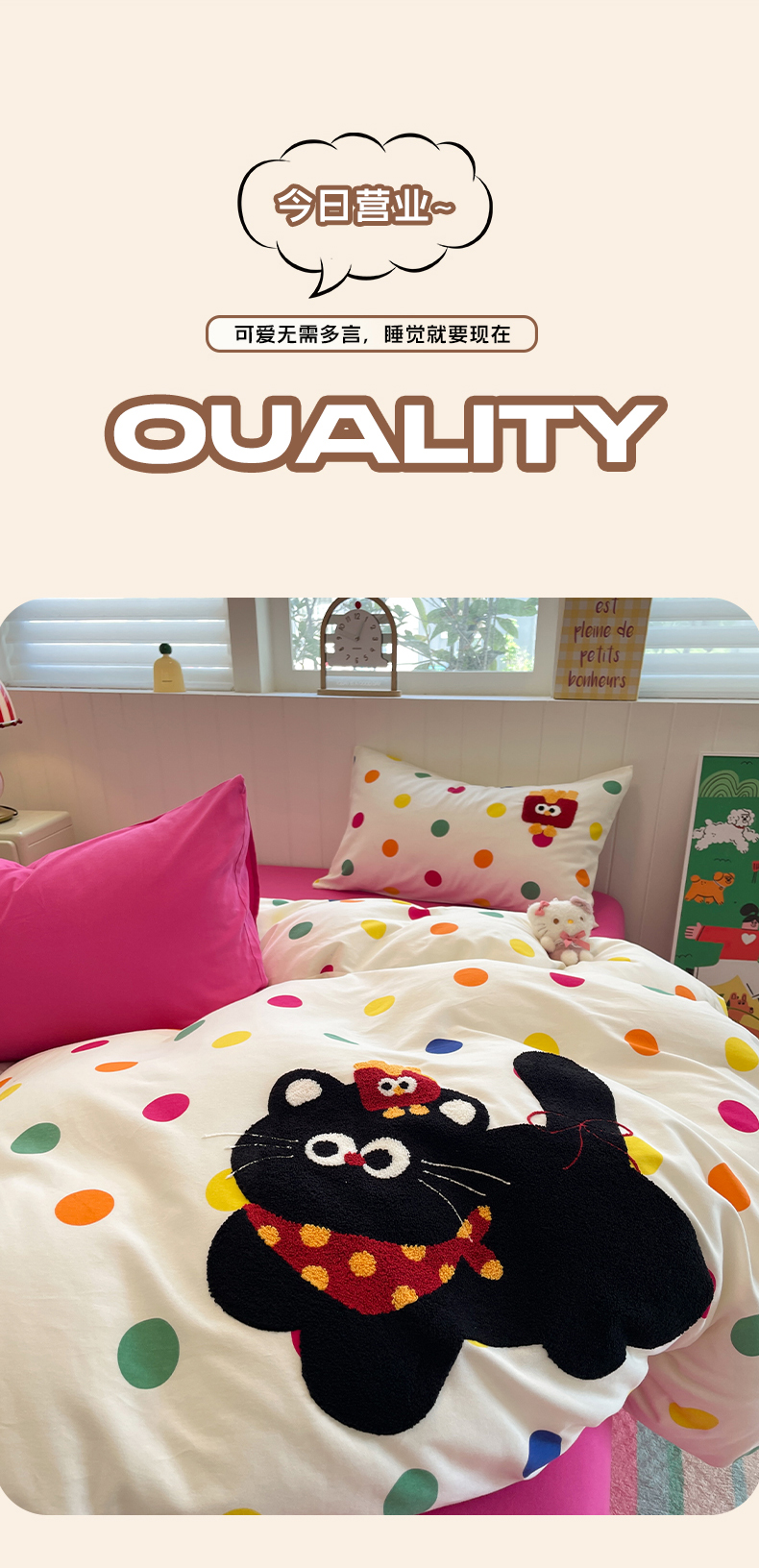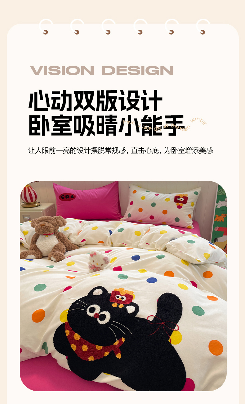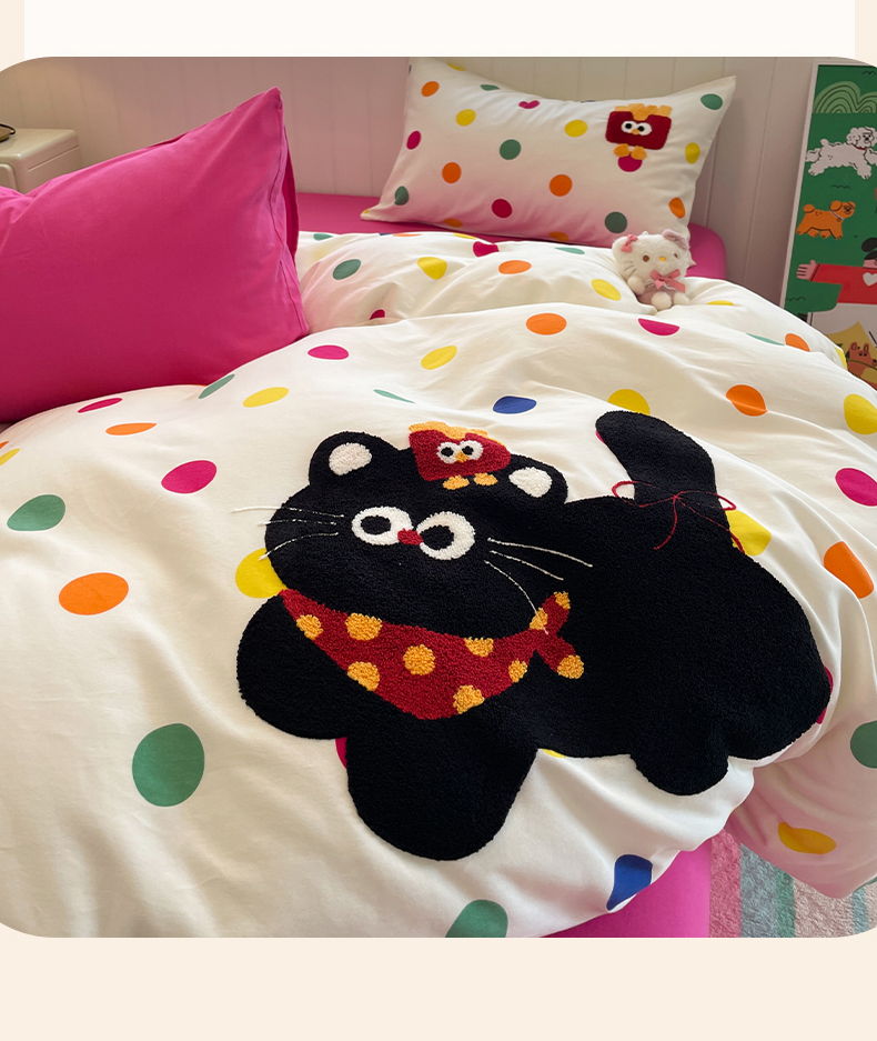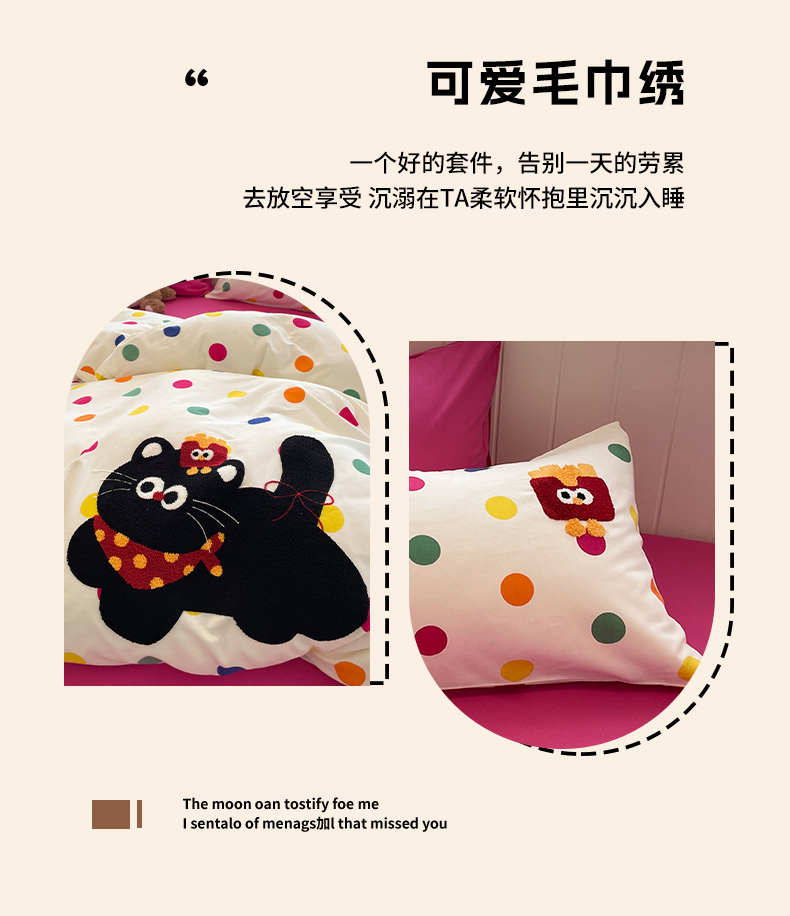 当前位置: 91家纺网 > 商品网购 > 床品套件 > 四件套 > 普通磨毛四件套 > 蓝邻家纺 2025新款全棉磨毛卡通刺绣款四件套--毛巾绣系列 炫彩猫