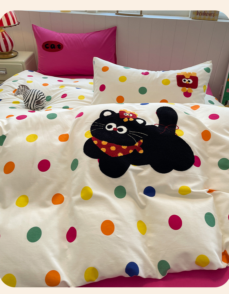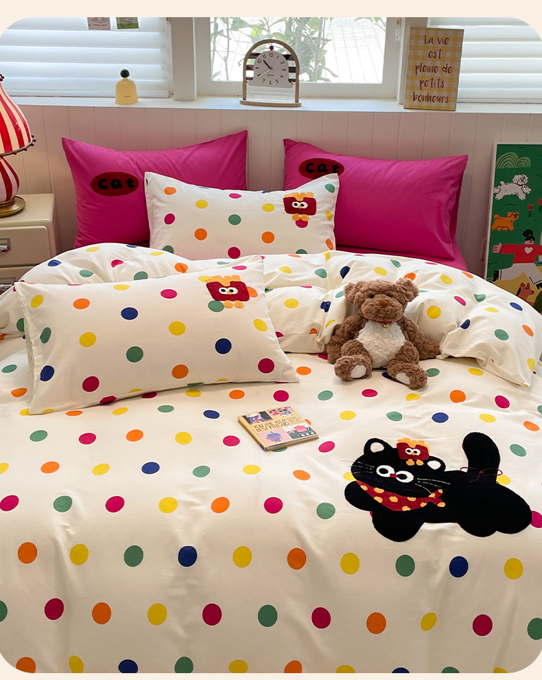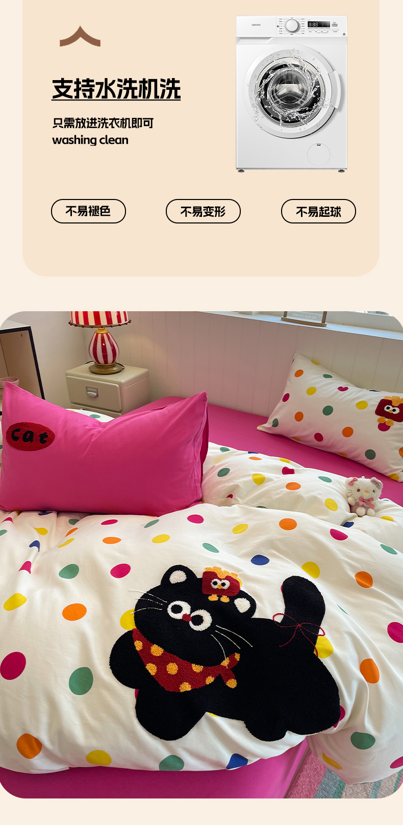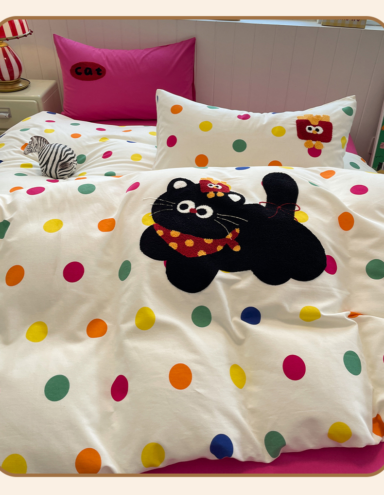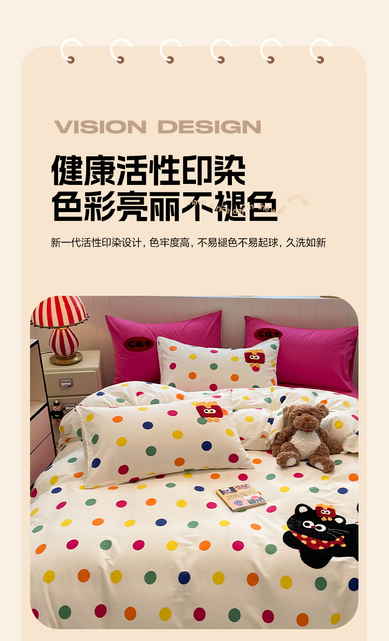 当前位置: 91家纺网 > 商品网购 > 床品套件 > 四件套 > 普通磨毛四件套 > 蓝邻家纺 2025新款全棉磨毛卡通刺绣款四件套--毛巾绣系列 炫彩猫