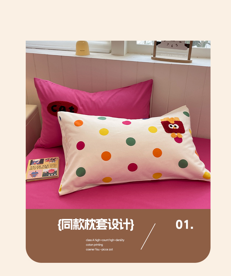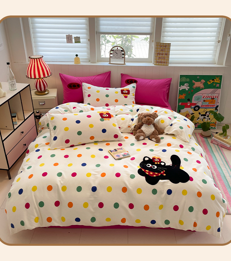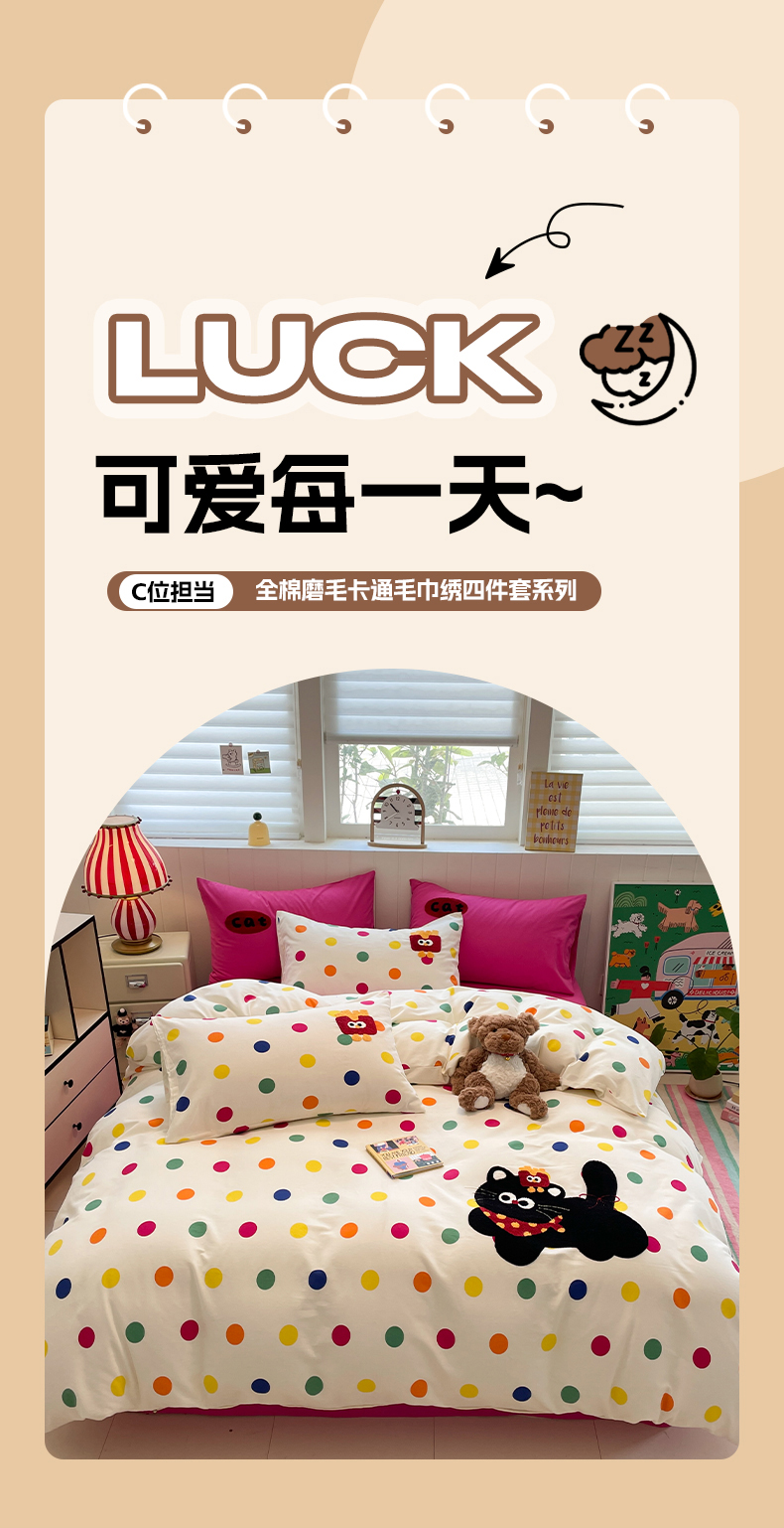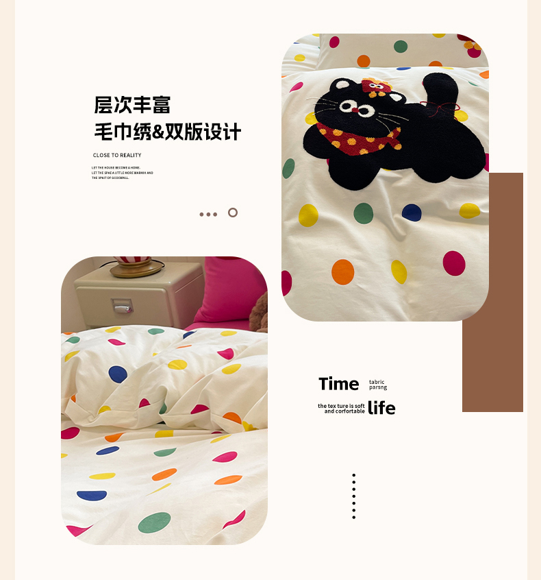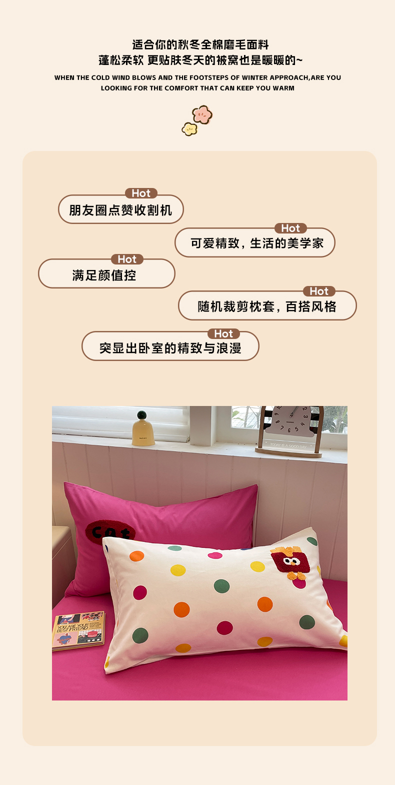 当前位置: 91家纺网 > 商品网购 > 床品套件 > 四件套 > 普通磨毛四件套 > 蓝邻家纺 2025新款全棉磨毛卡通刺绣款四件套--毛巾绣系列 炫彩猫