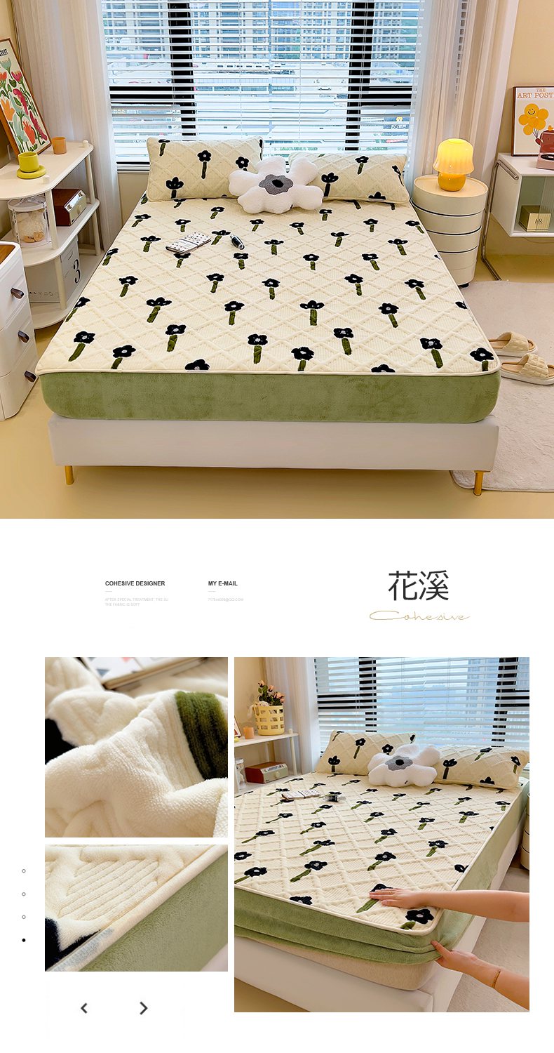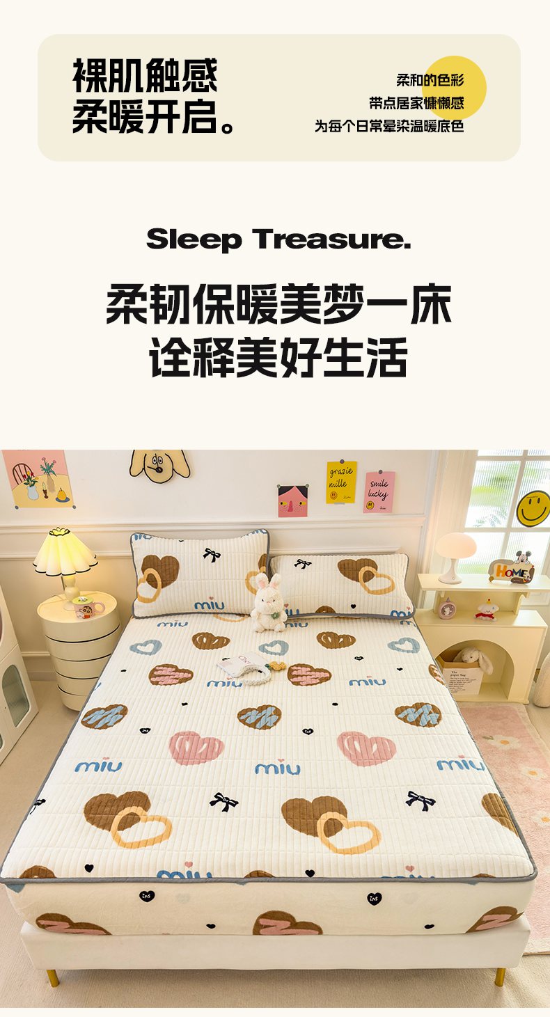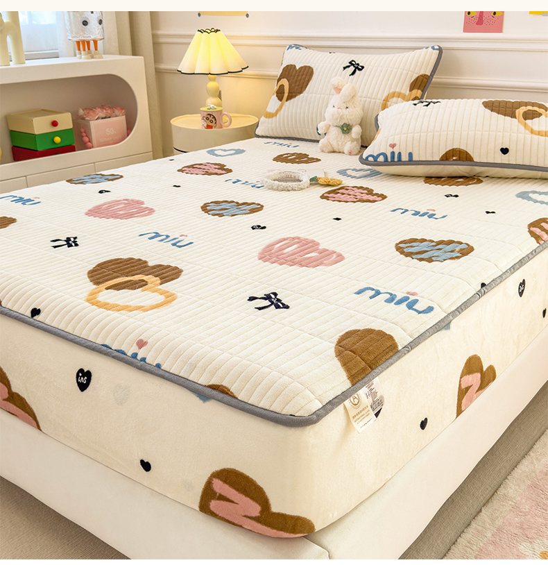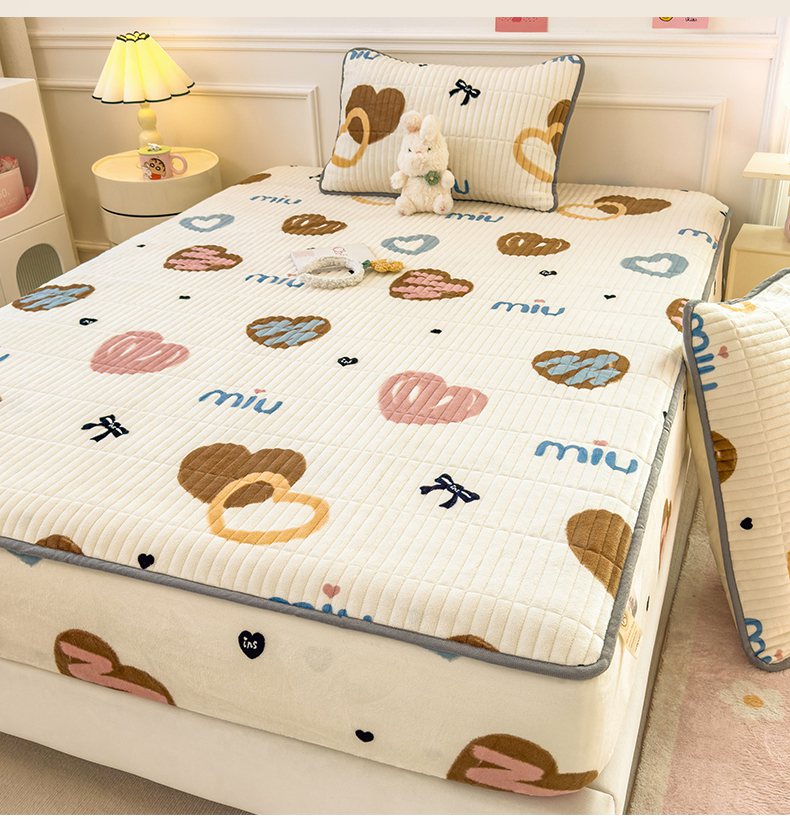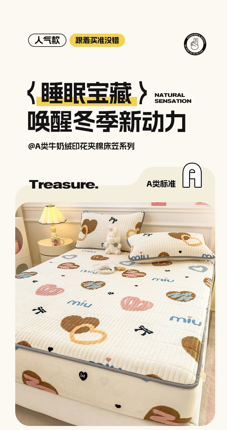 • 91家纺网 家纺一手货源 找家纺 摩妮卡 2025新款小清新系列印花牛奶绒夹棉床笠三件套 心元素