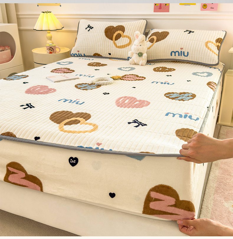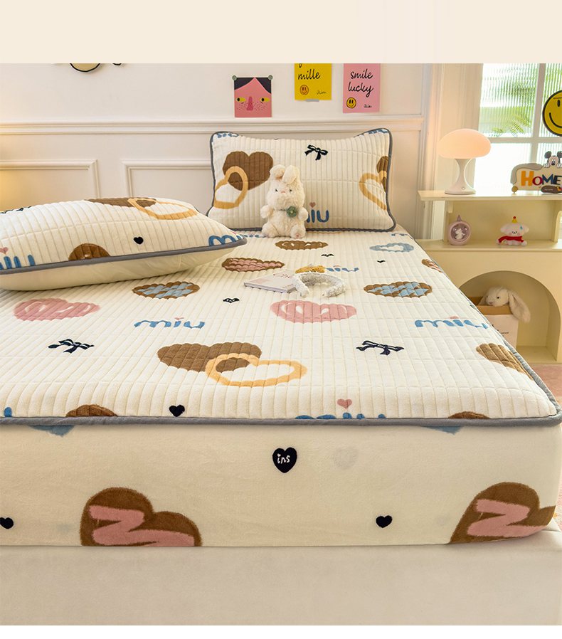 摩妮卡 2025新款小清新系列印花牛奶绒夹棉床笠三件套 心元素