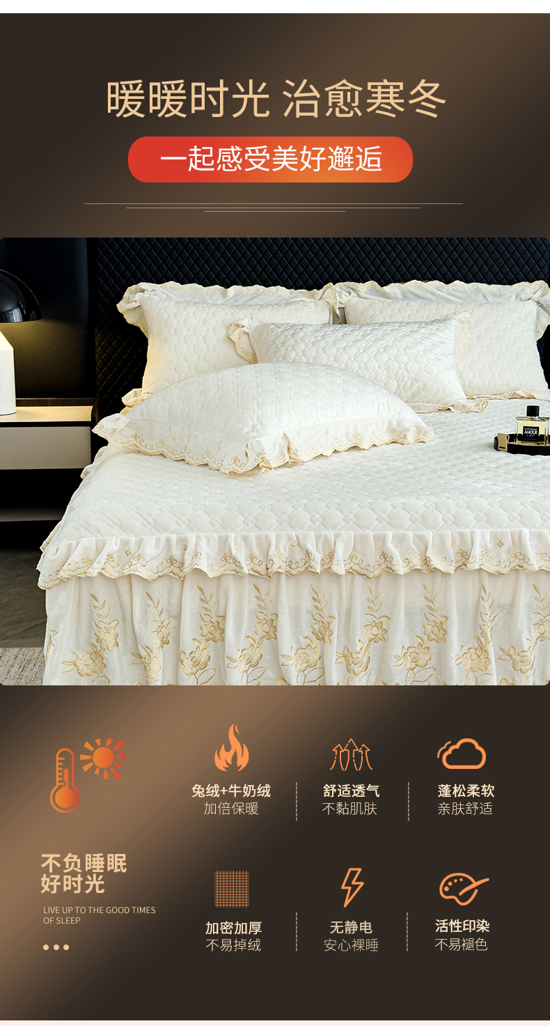 花香四季家纺 2025新款保暖绒绣花宝宝绒床裙系列 牛奶白