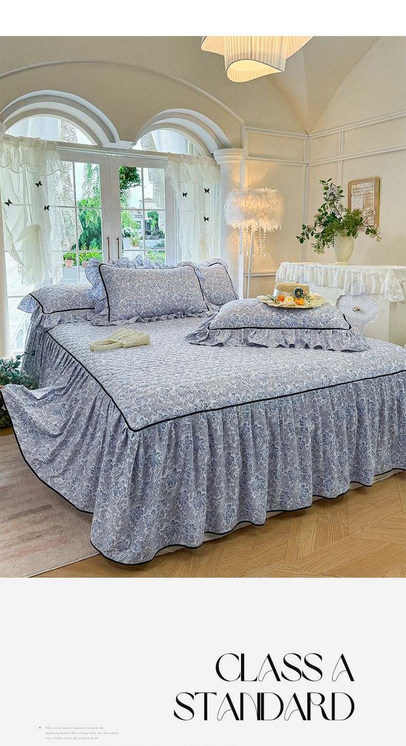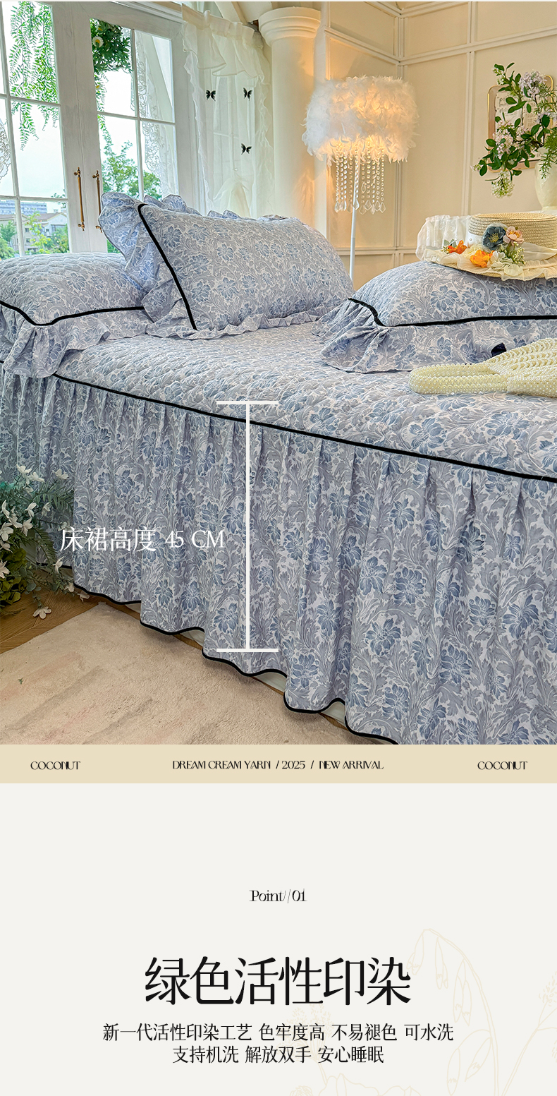 当前位置: 91家纺网 > 商品网购 > 床品套件 > 三件套 > 宜凡家纺 2025新款A类水洗珍珠棉夹棉床裙三件套 清野