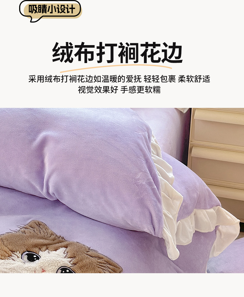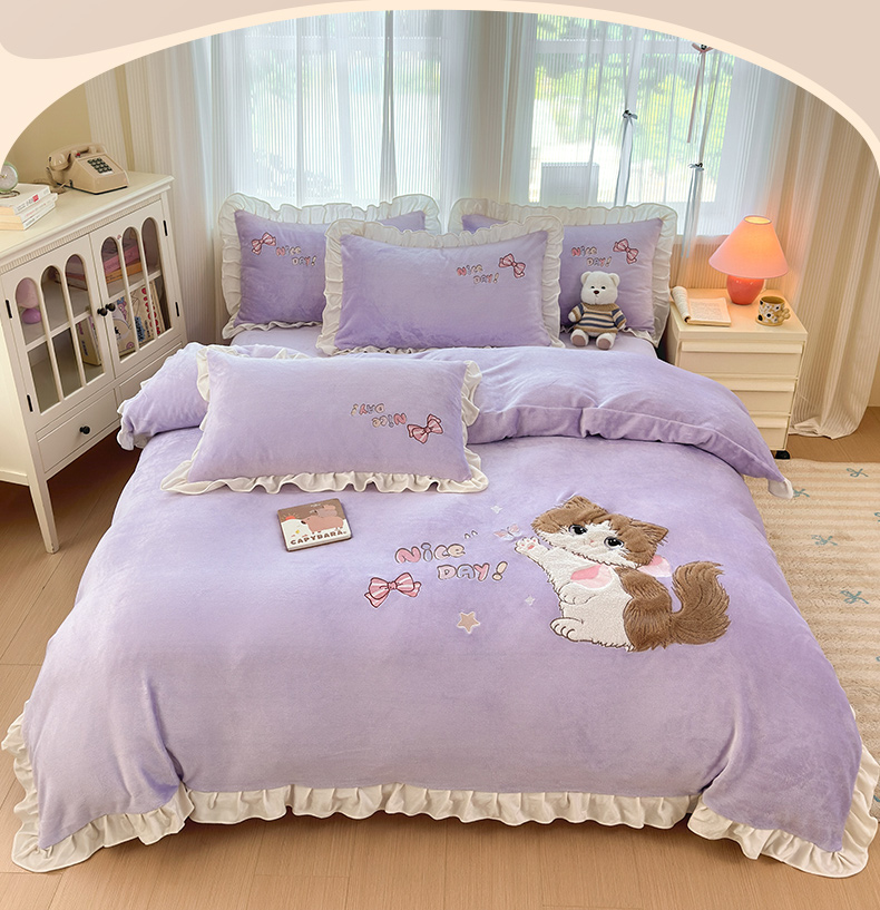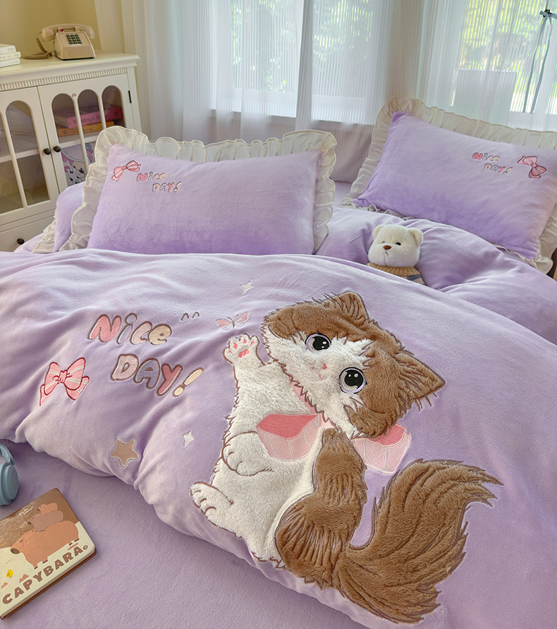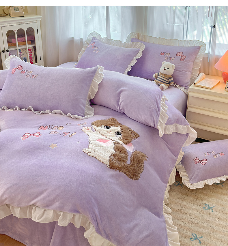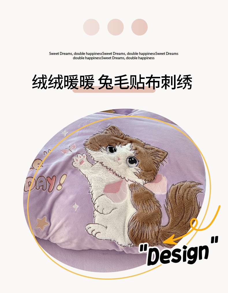 当前位置: 91家纺网 > 商品网购 > 床品套件 > 四件套 > 牛奶绒四件套 > 易禾 2025新款韩版牛奶绒卡通兔毛贴布刺绣床单款床笠款四件套三件套小奶猫系列(专版) 小奶猫——浅紫