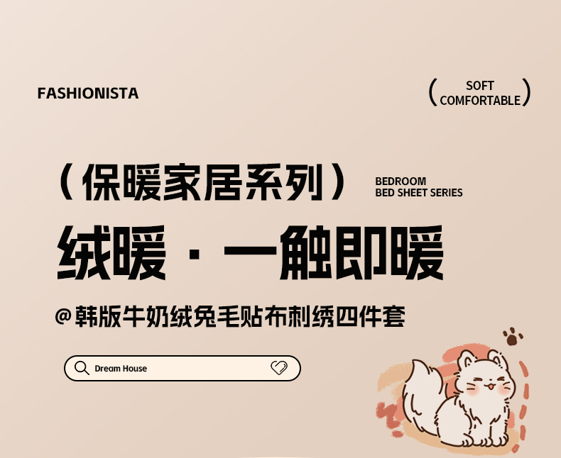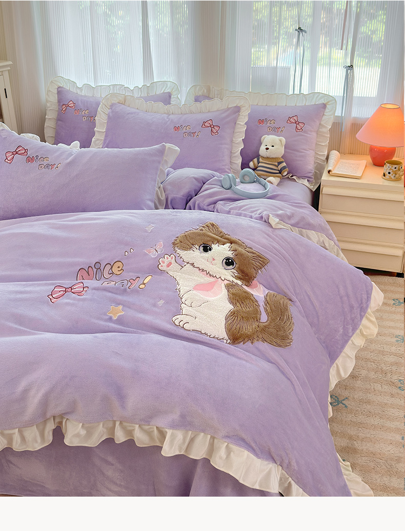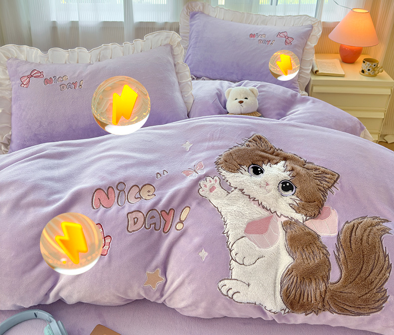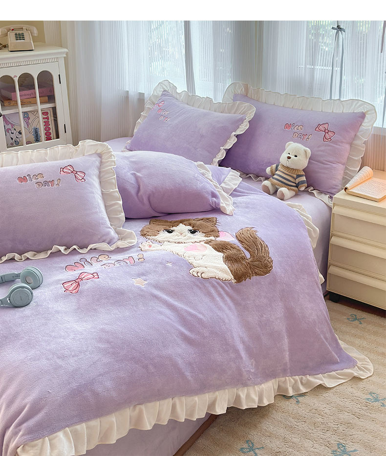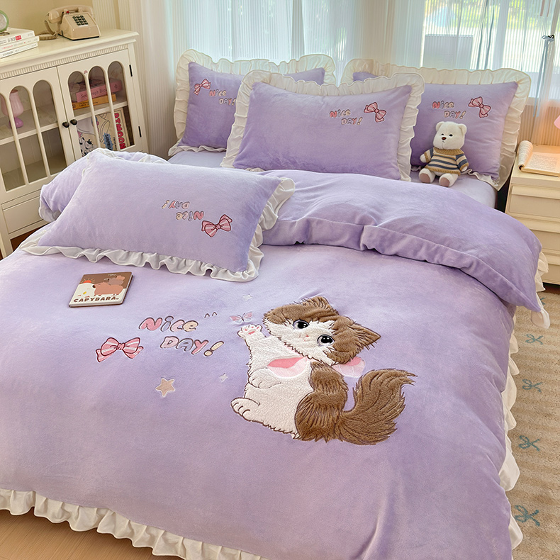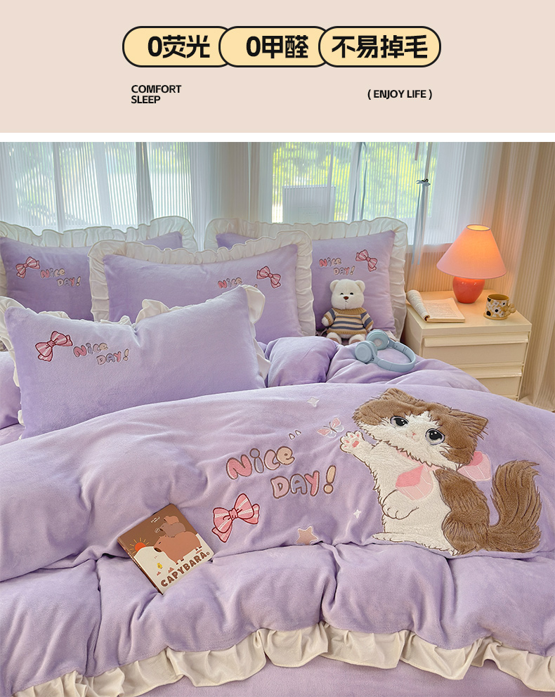 当前位置: 91家纺网 > 商品网购 > 床品套件 > 四件套 > 牛奶绒四件套 > 易禾 2025新款韩版牛奶绒卡通兔毛贴布刺绣床单款床笠款四件套三件套小奶猫系列(专版) 小奶猫——浅紫
